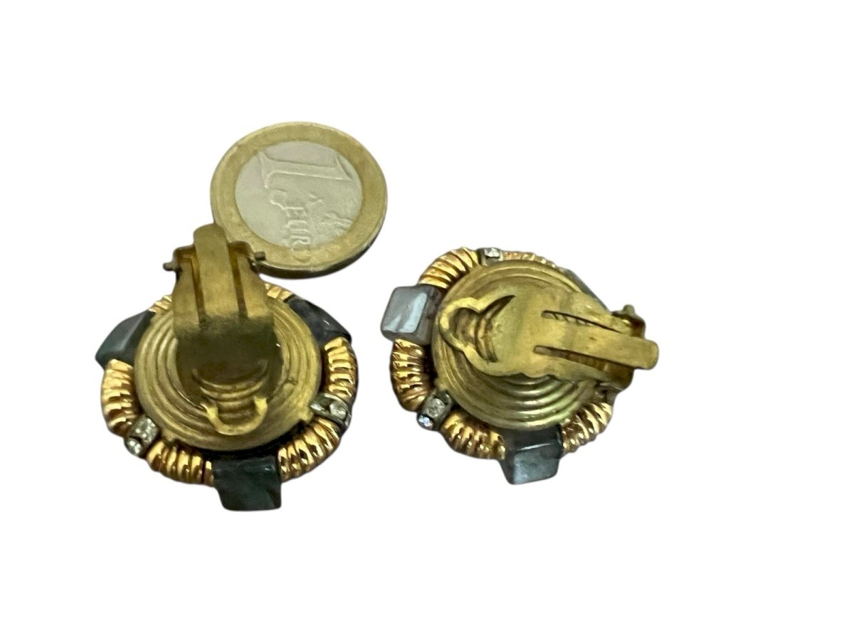 Vintage couture clip earrings with chic jasper elegant retro circa 1960. ? Vintage Couture Clip Earrings (Circa 1960) A magnificent pair of vintage clip earrings inspired by couture, dating from the 1960s. These pieces are designed in a dome shape and consist of the following elements: * Ornaments: Clustered herbaceous jasper cubes alternating with sparkling crystal rhinestones. * Structure: Dome and clip finish in gleaming gold-toned metal. * Dimensions: Each earring has a diameter of approximately 2.5 cm. * Condition: The set is in very good condition, and the clip mechanism is fully functional. Condition: Used: Item has been worn. ...Used: Item has been worn. any imperfections. Closure: Clips Dominant stone: Jasper Brand: Couture jewelry Country of origin: France Dominant color: Green Material: Jasper