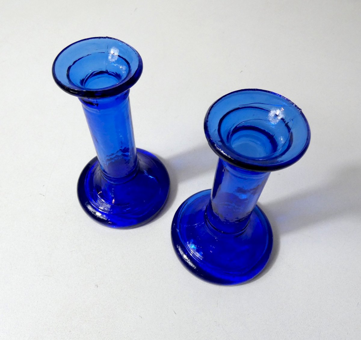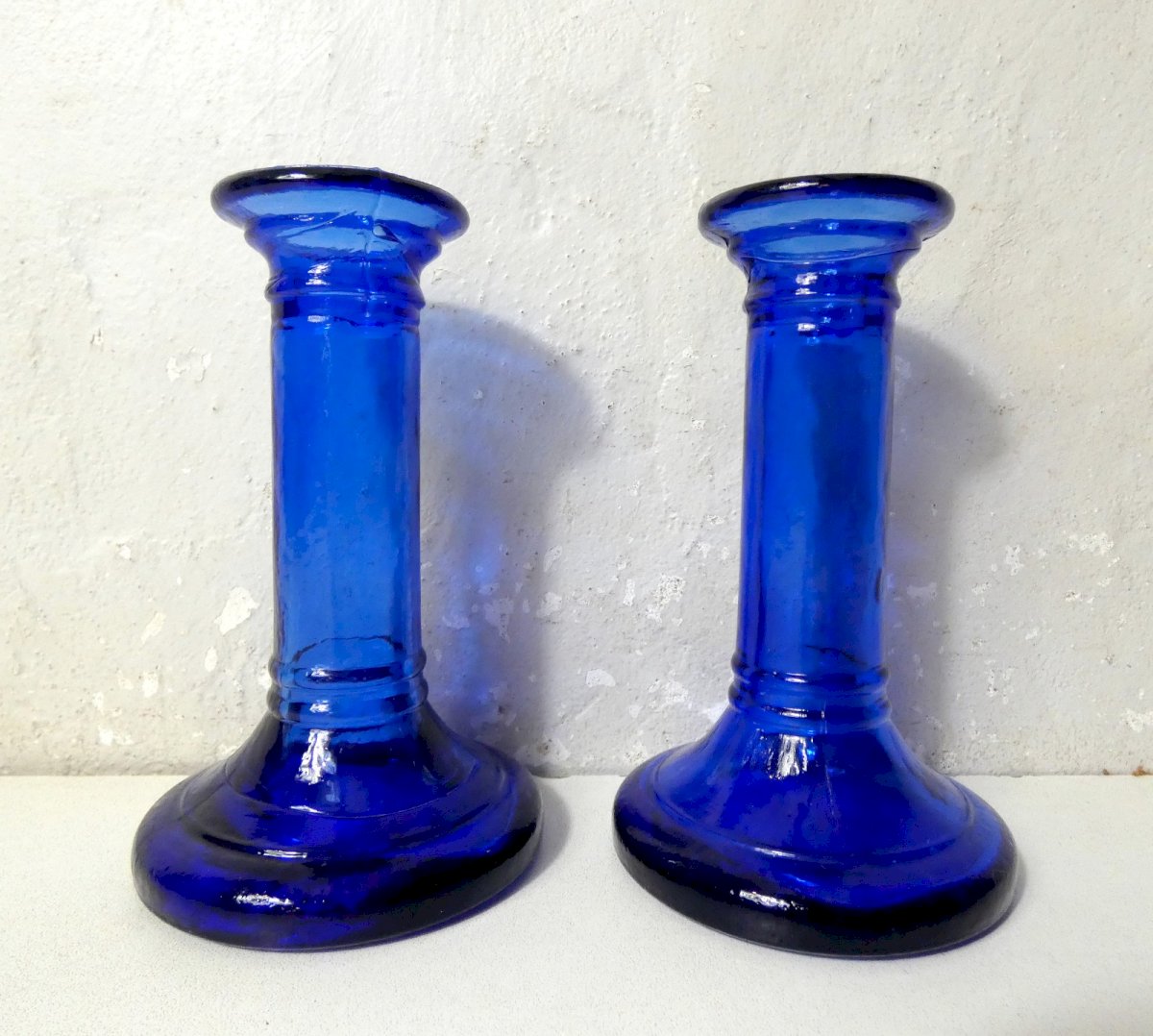 Pair of pressed glass candle holders, mass dyed, cobalt blue. Height: 15 cm. Base diameter: 8.5 cm. In very good condition. Condition: Used: Item has been used. Item shows some superficial signs of wear, ... Used: Item has been used. Item shows some superficial signs of wear, fully operational and working correctly. It may be a demonstration model or an item returned to the store after a short period of use. any possible imperfections. Type: Candle holder