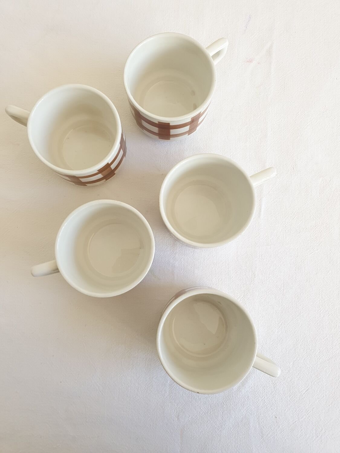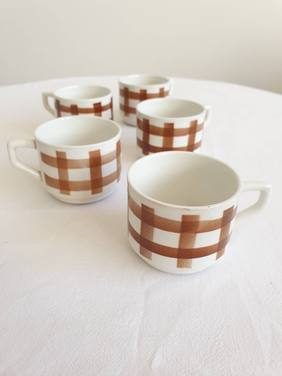 Set of 5 vintage coffee cups, brown tablecloth pattern on white ceramic. Unmarked. Very good overall condition, no chips or cracks. Height 5 cm. Diameter 6.5 cm. L: 6 W: 6 H: 5
