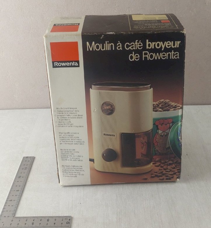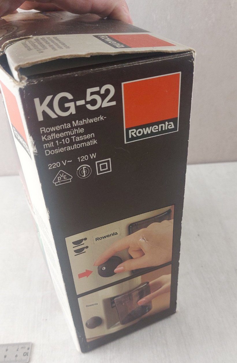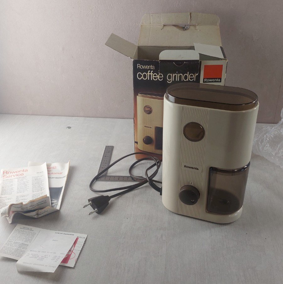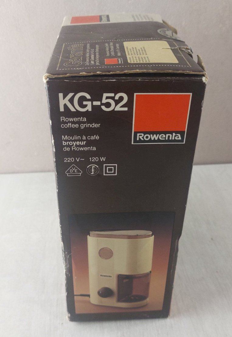 Old coffee grinder mill, Rowenta, KG-52, vintage in good condition, works with manual, invoice, original box see photos. Check out my other items! Reduced shipping costs for bulk purchases. Condition: Used Item that has been used. Possible imperfections. Type: Electric coffee grinder.