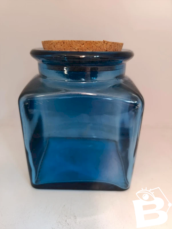 blue glass jar with cork lid in good condition