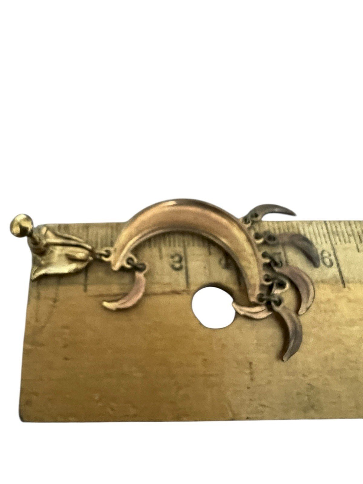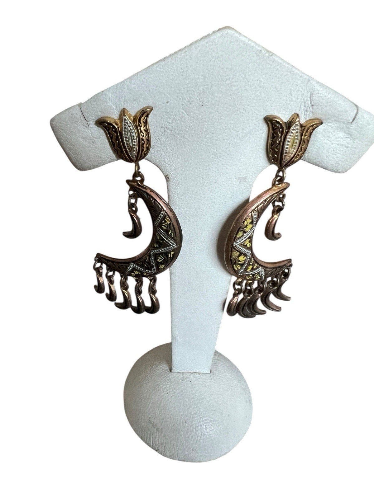 Elegant Antique Earrings from Toledo (Spain) - Enamelled Moon Crescent - Secure Screw-Back Clip Beautiful pair of long dangling earrings of Spanish origin, typical of Toledo craftsmanship. These period pieces stand out with a large richly decorated moon crescent motif. The decoration features an old patina enamel (or damasked) in vibrant colors (black, gold, and white), enhanced by movable charms that add dynamism. A major advantage: they are equipped with a screw-back clip system. This rare and sought-after mechanism allows for a perfect and secure fit for unpierced ears, ensuring optimal comfort. Key Details: * Style: Traditional Spanish Jewelry, Toledo. * Closure: Screw-back (ideal for secure wear without piercing). * Dimensions: Approximately 5.5 cm in length x 2.5 cm in width. * Condition: Very good, with a beautiful old patina. Condition: Used: Item has been worn. ...Used: Item has been worn. any potential imperfections. Type: Dangle Brand: Toledo Closure: Screw-back