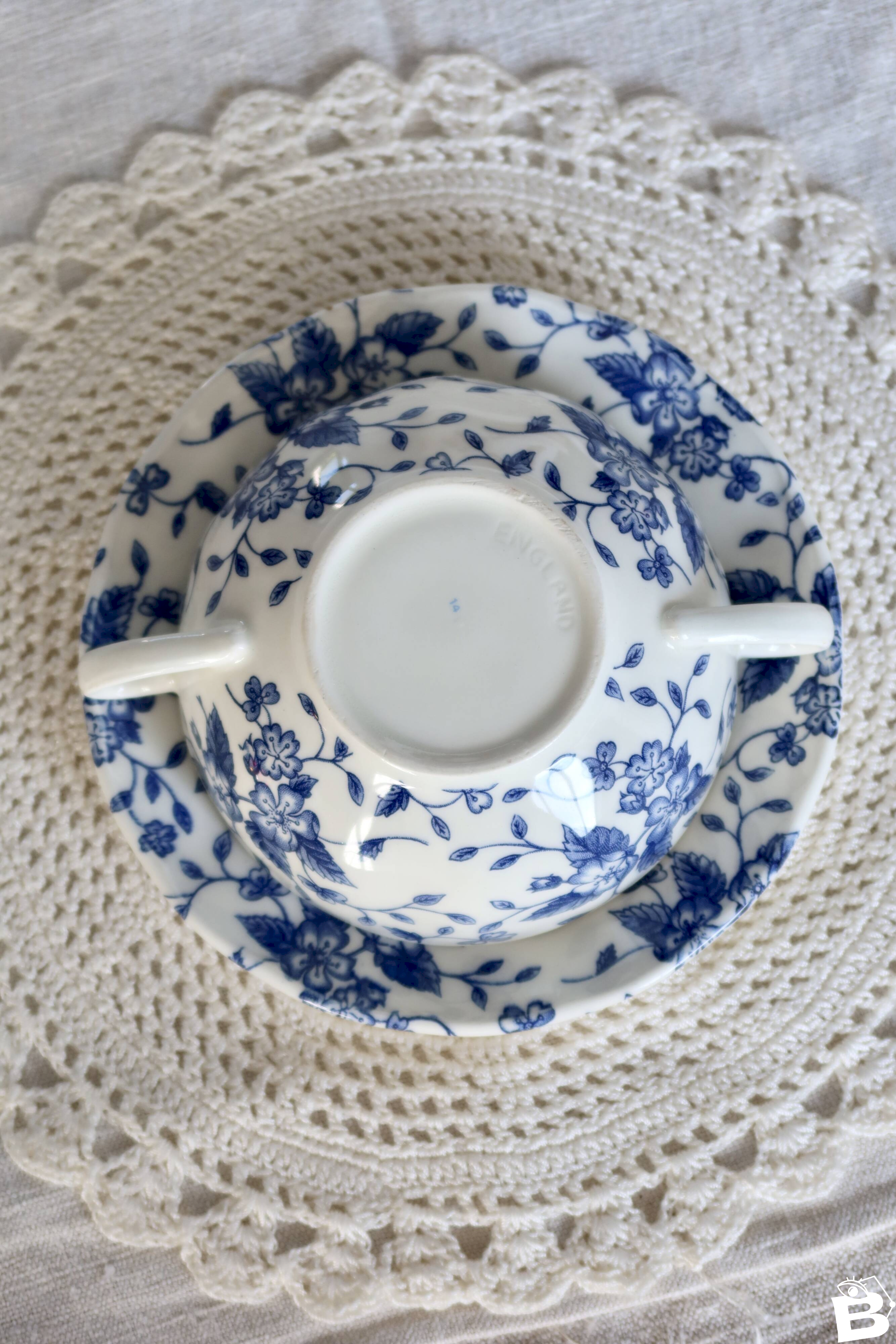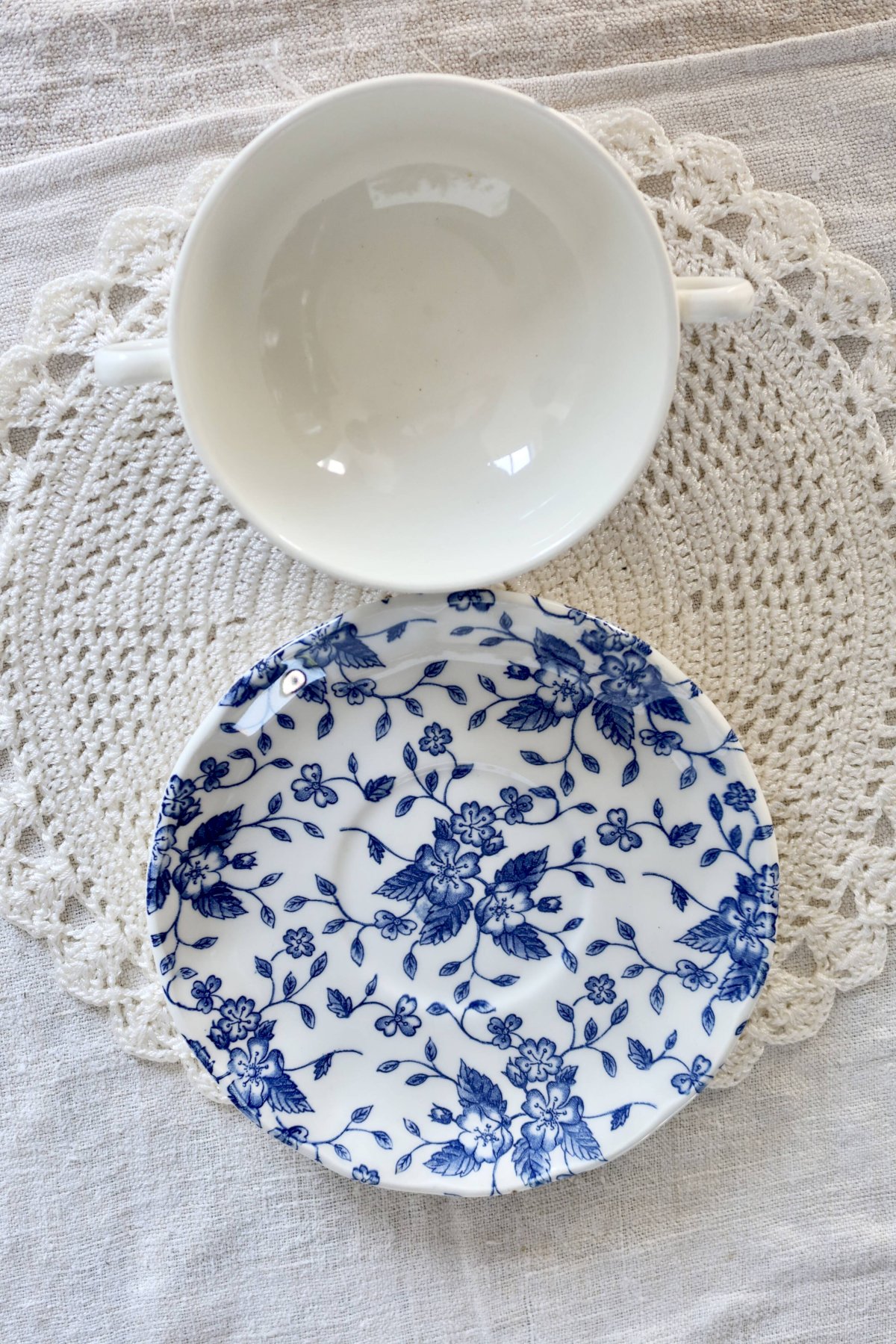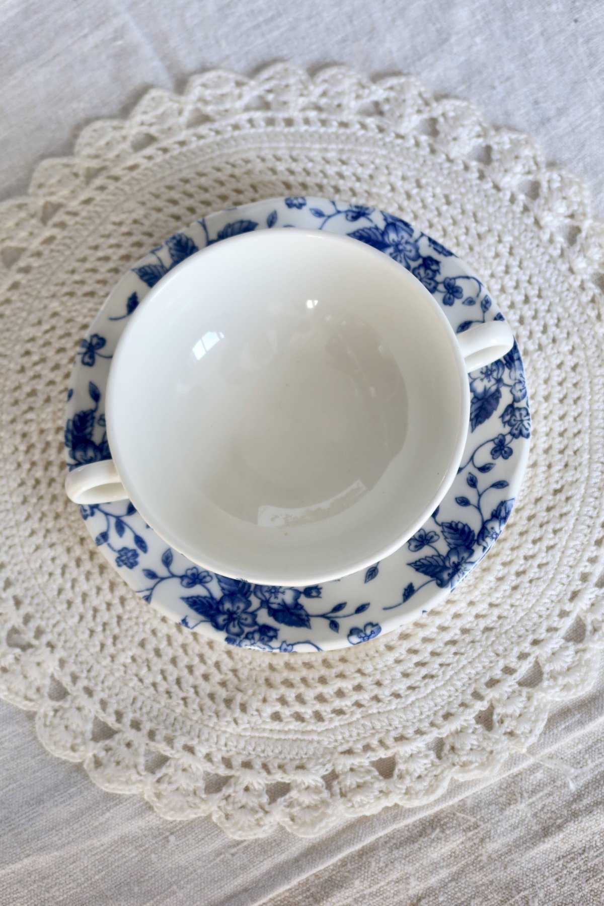 White earthenware with an all-over blue floral design: an English classic with cottage charm, perfect for serving broth, a light cream soup, or a generous café au lait. Dimensions: Cup: 12cm X 4cm. Saucer: 16cm. L: 12 W: 12 H: 4