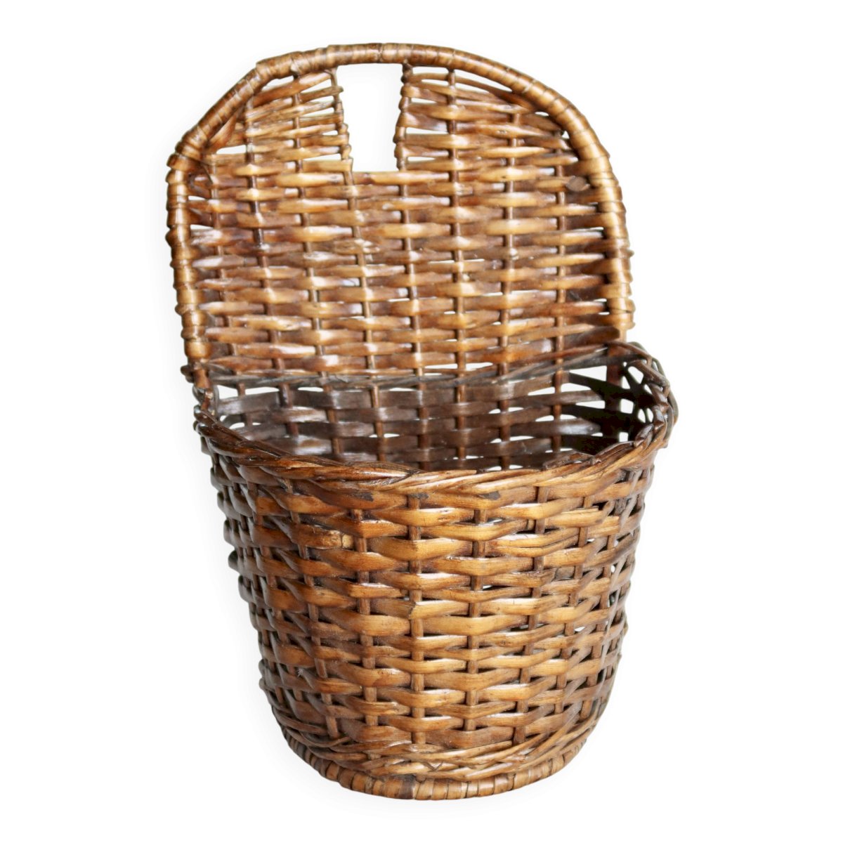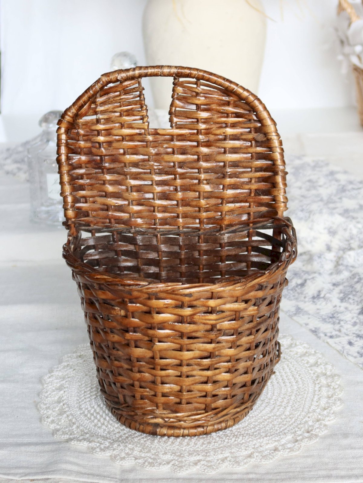 Dark wicker wall basket with tight weaving and a warm patina. Ideal for storing utensils, dried flowers, or accessories in an entryway, kitchen, or bathroom. Very good vintage condition, with some discreet signs of use. Dimensions: 18cm X 28cm X 14cm. L: 18 W: 14 H: 28