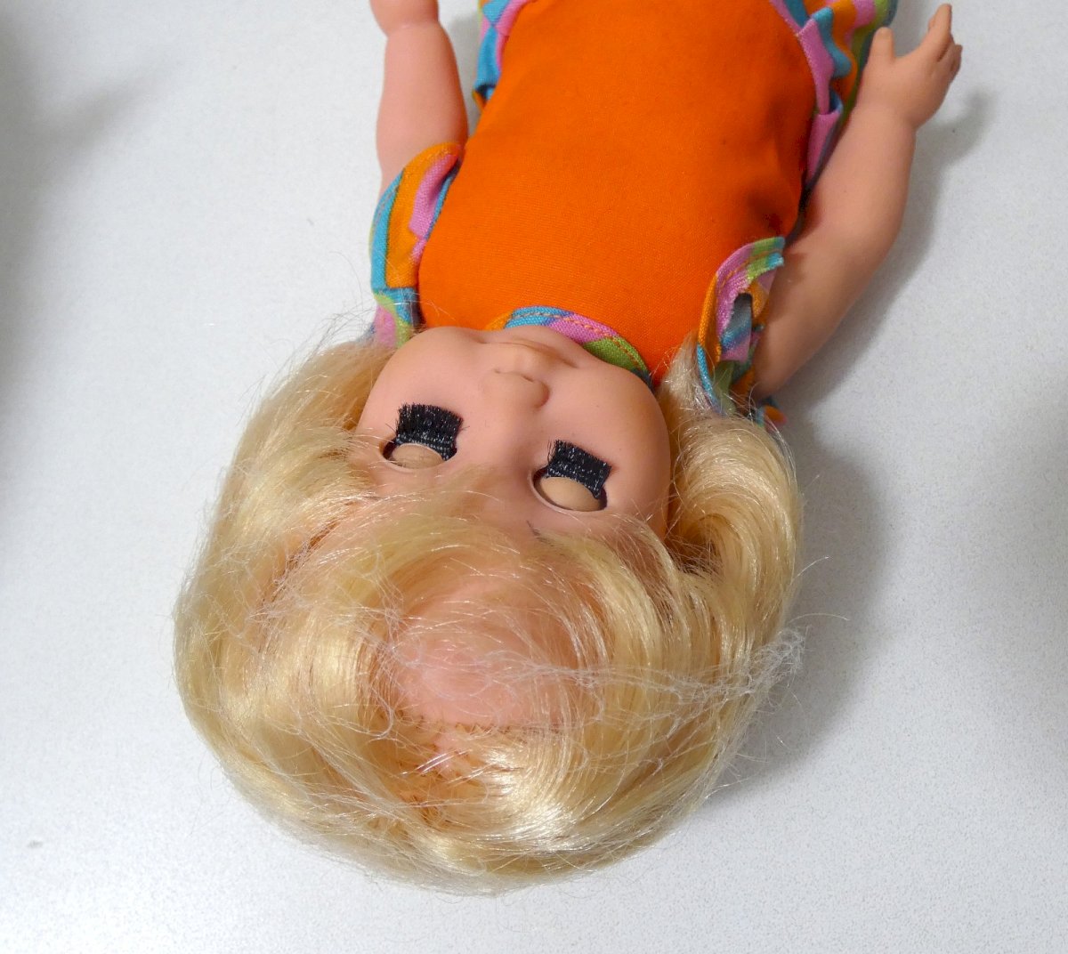 1970s doll. No apparent markings. It measures 30 cm. Her eyes are sleeping eyes and the mechanism works perfectly. Her lashes are black and thick, giving her a doe-like look. Her head, arms, and legs are made of soft plastic, while her torso is made of hard plastic. She is new and still has her protective netting on her hair. Condition: Like new, impeccable. Condition: Used item. Please check the seller's description for more details... Used item: An item that has been used. Any possible imperfections.
