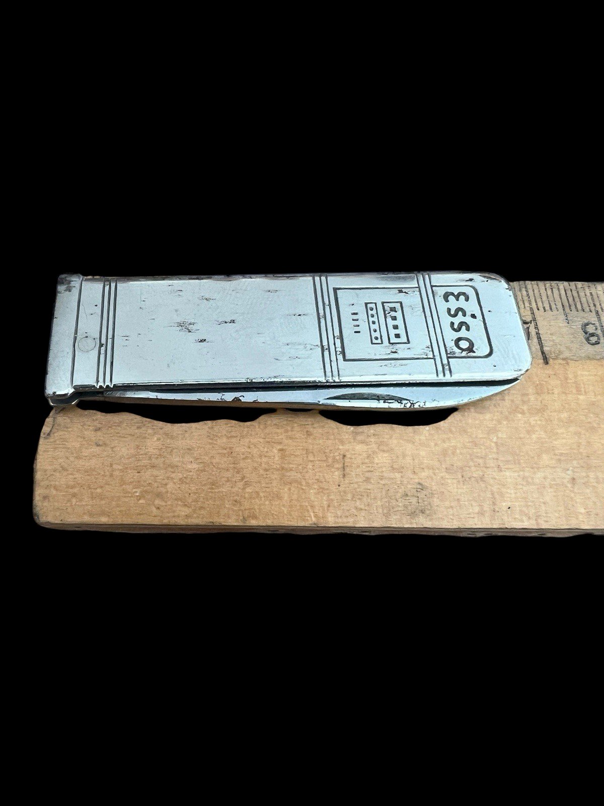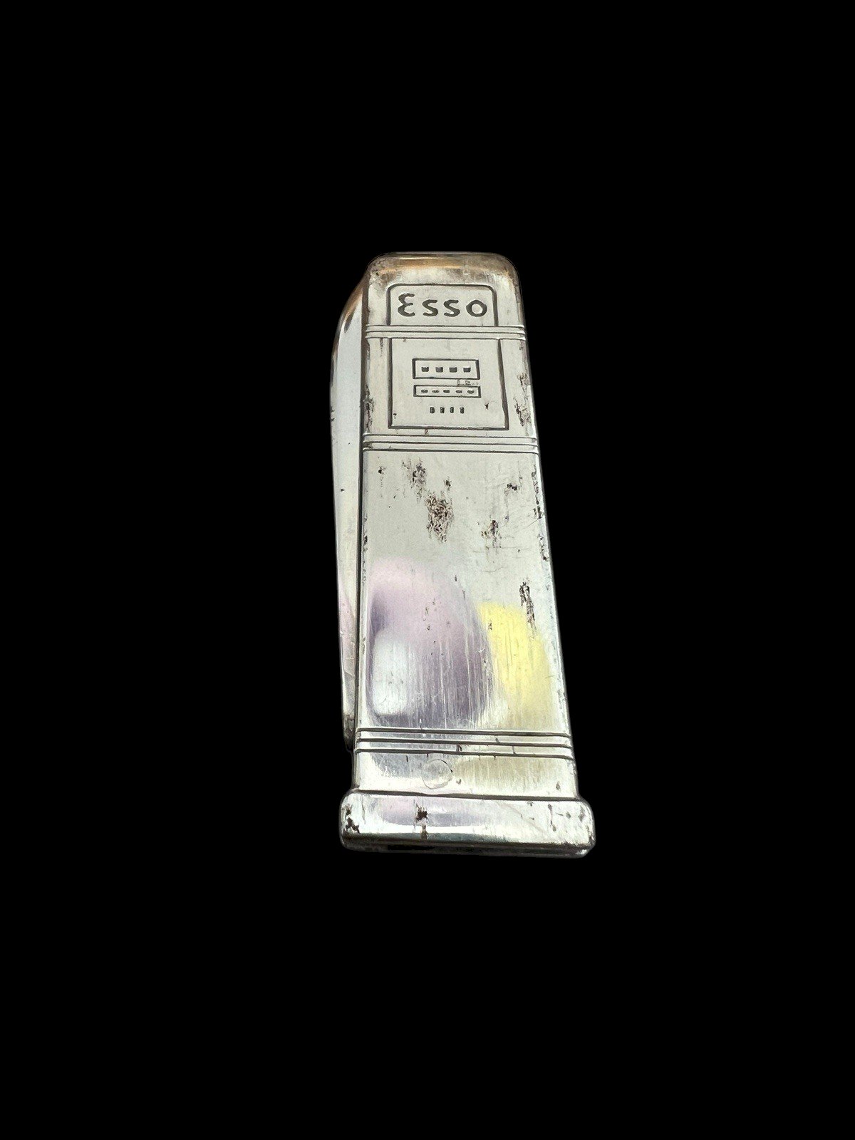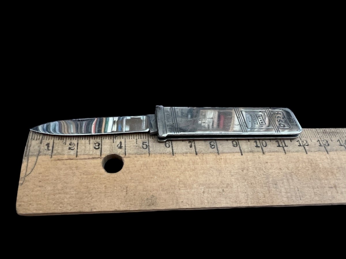 Vintage Esso unisex double-sided advertising pocket knife. Minor signs of wear. Extra flat knife. Double-sided design. Dimensions approximately 6.5 cm by 2 cm. Condition: Used item. Please refer to the seller's description for more details on any potential imperfections. Color: Silver Type: Folding knife Brand: Esso Country of manufacture: France Handle material: Metal