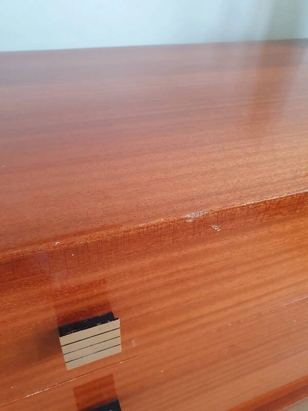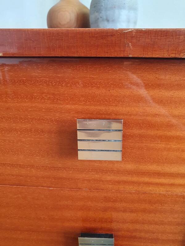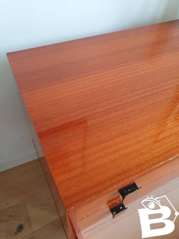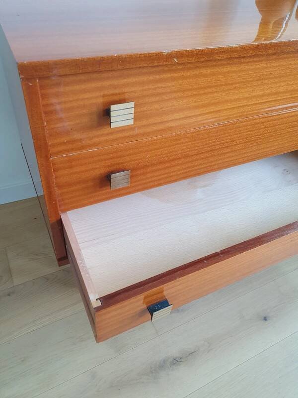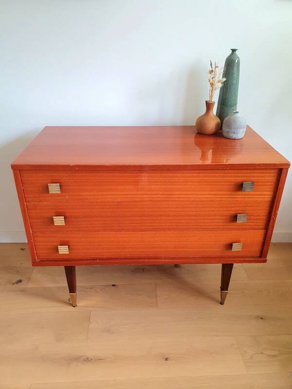 Vintage dresser, 1950s/60s, tapered legs, wood veneer with a lacquer finish. 3 wide drawers, small golden handles. Very good overall condition. Height 77 cm. Width 100 cm. Depth 48 cm. Note: a few small marks of friction on the lacquer and fine scratches on the top (see photos). L: 100 W: 48 H: 77