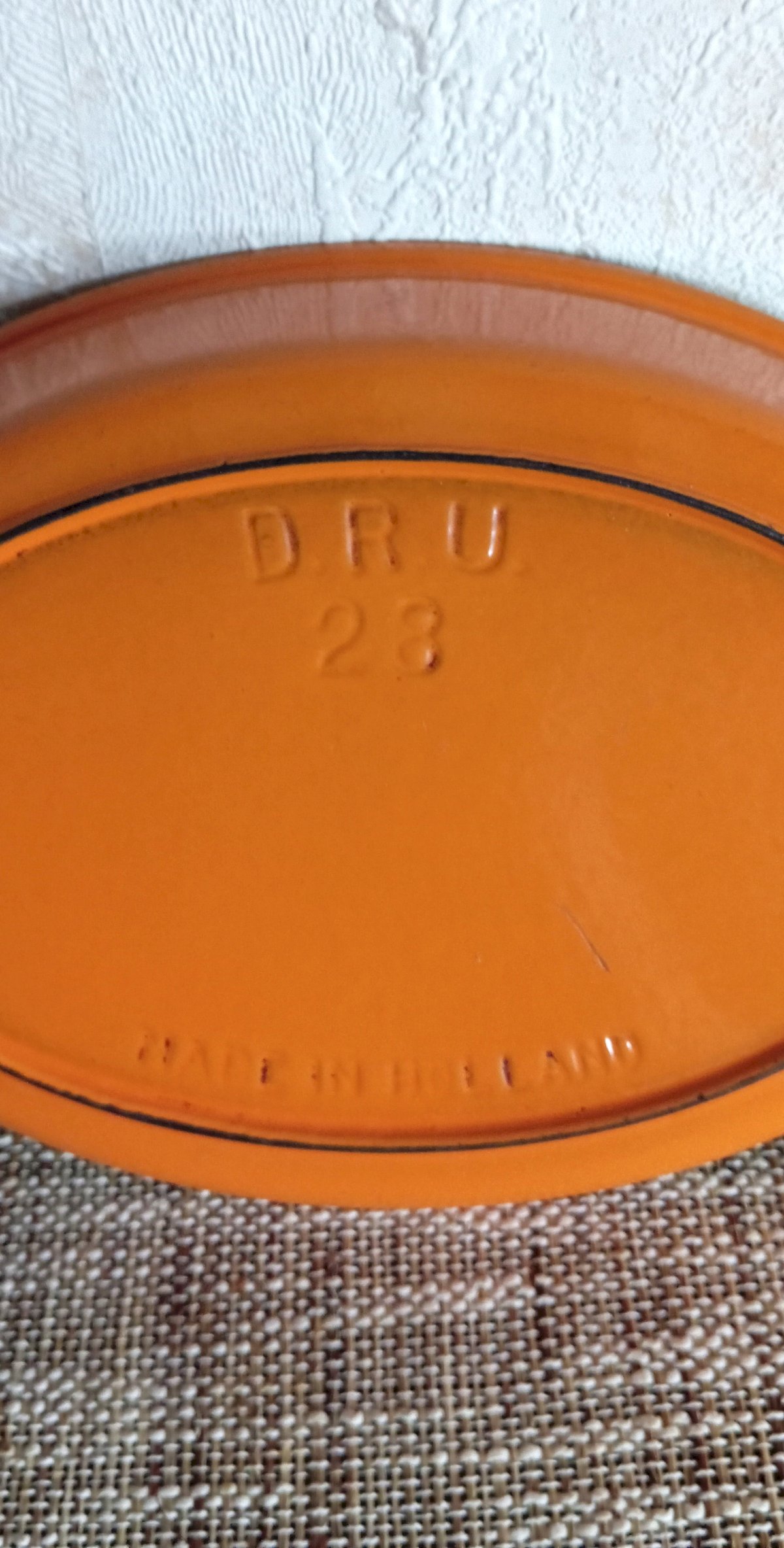 Discover this vintage DRU 28 orange enameled cast iron dish, an iconic piece from the 1970s, made in the Netherlands by De Royal Utrecht (DRU). This dish combines durability, retro aesthetics, and authenticity.