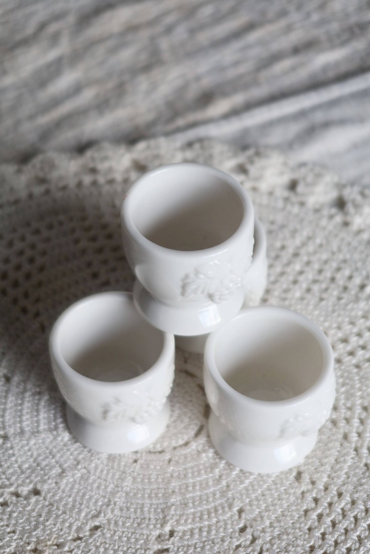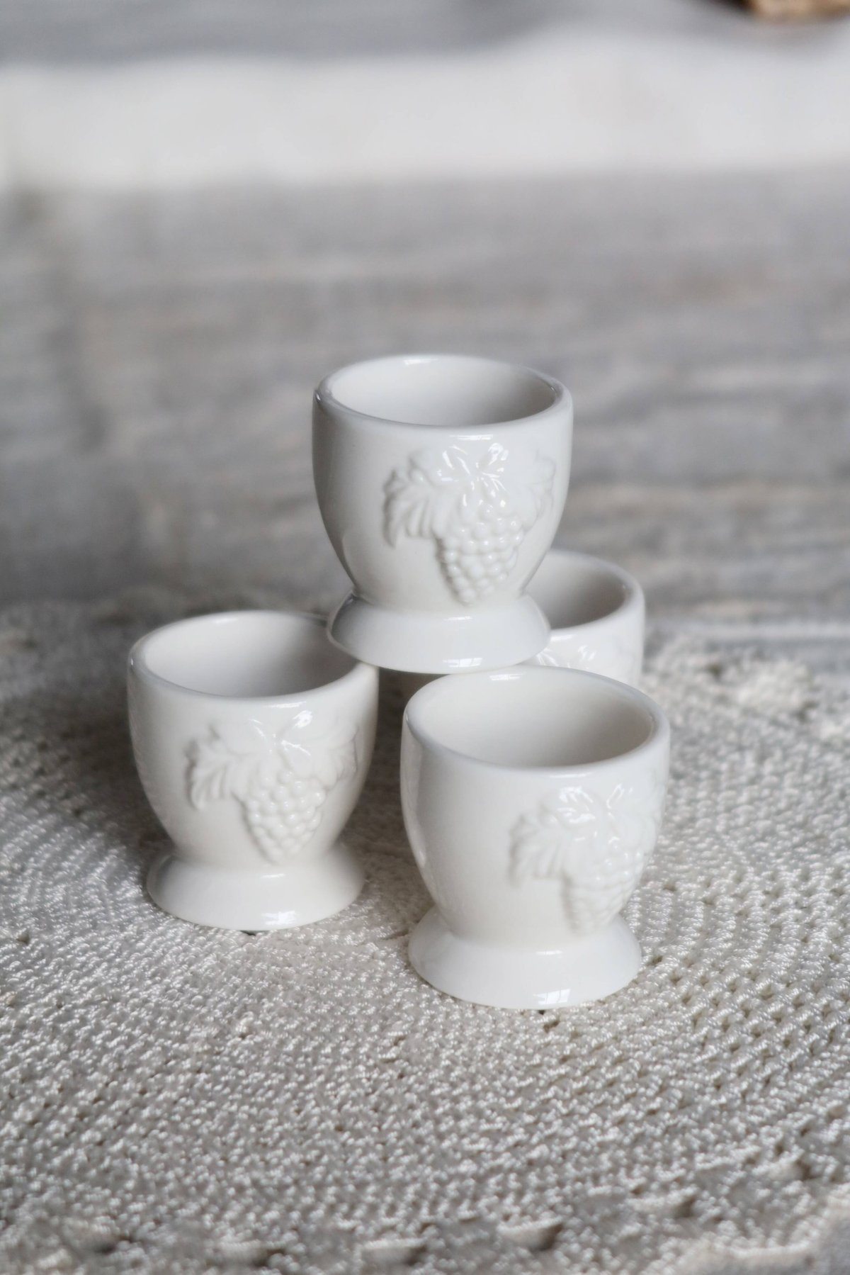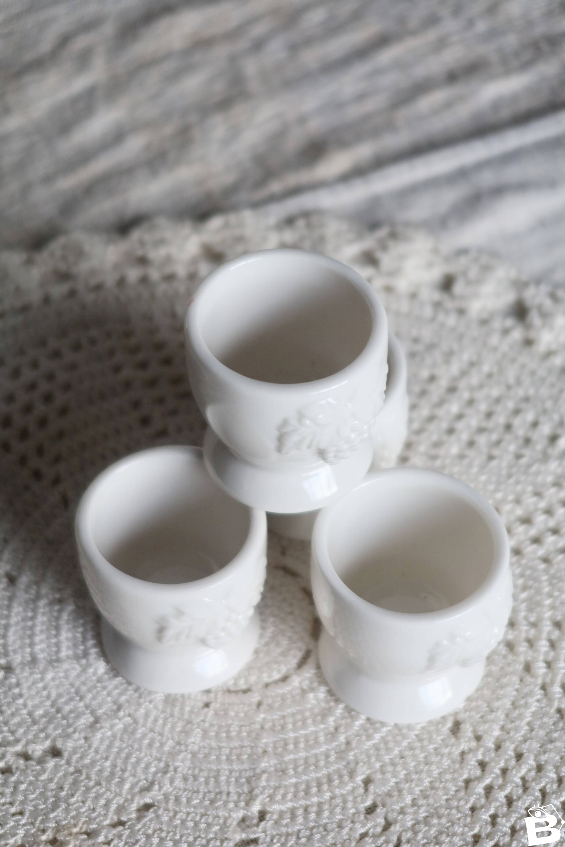 Set of 4 vintage egg cups in white majolica, decorated with a delicately sculpted relief grape motif.