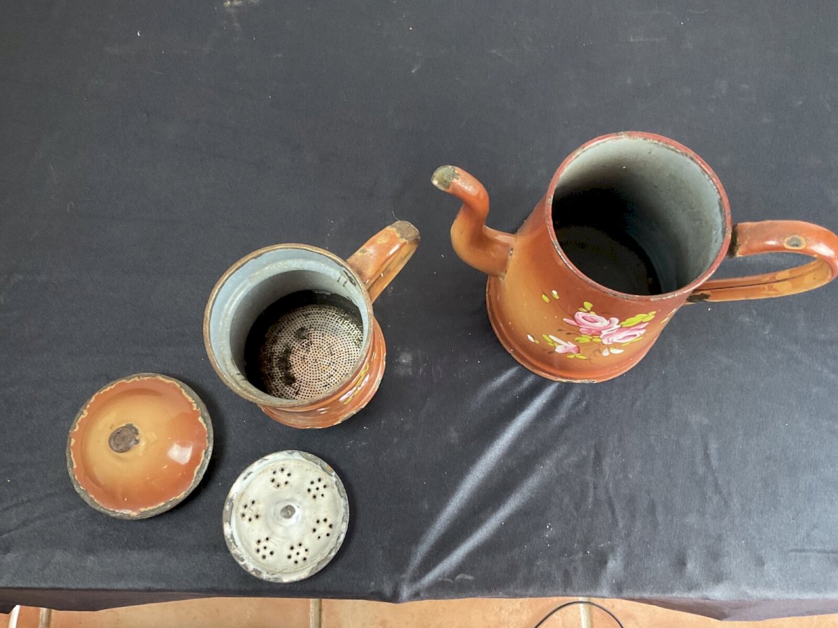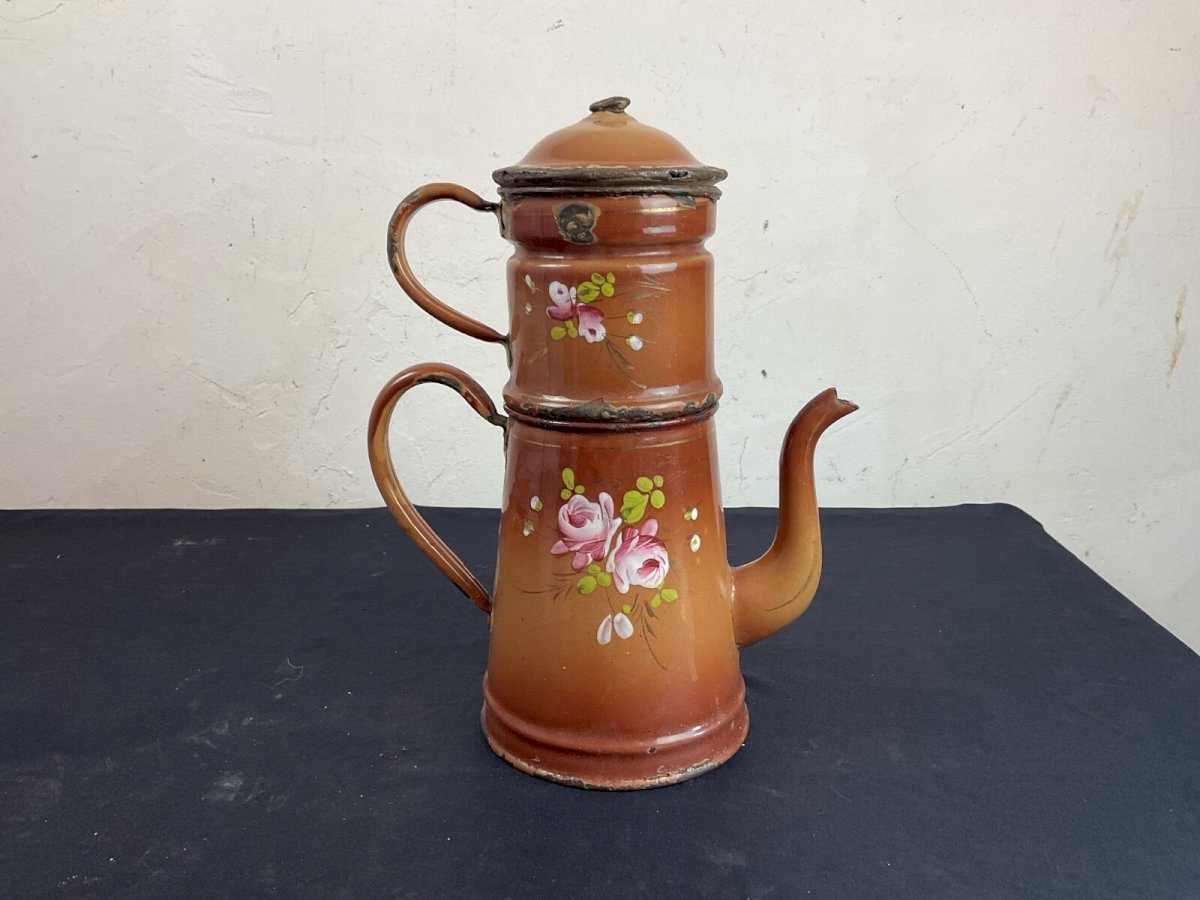 Vintage Enamelled Metal Coffee Pot with Rose Decorations Height: 29.5 cm Condition: Used item. Please check the seller's description for more details ... Used item. Any imperfections. Color: Brown Type: Coffee Pot Period: Art Deco, 1920-1939 Country of manufacture: France Material: Enamelled metal