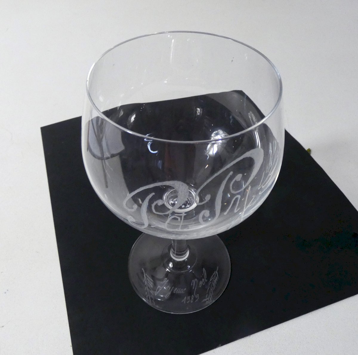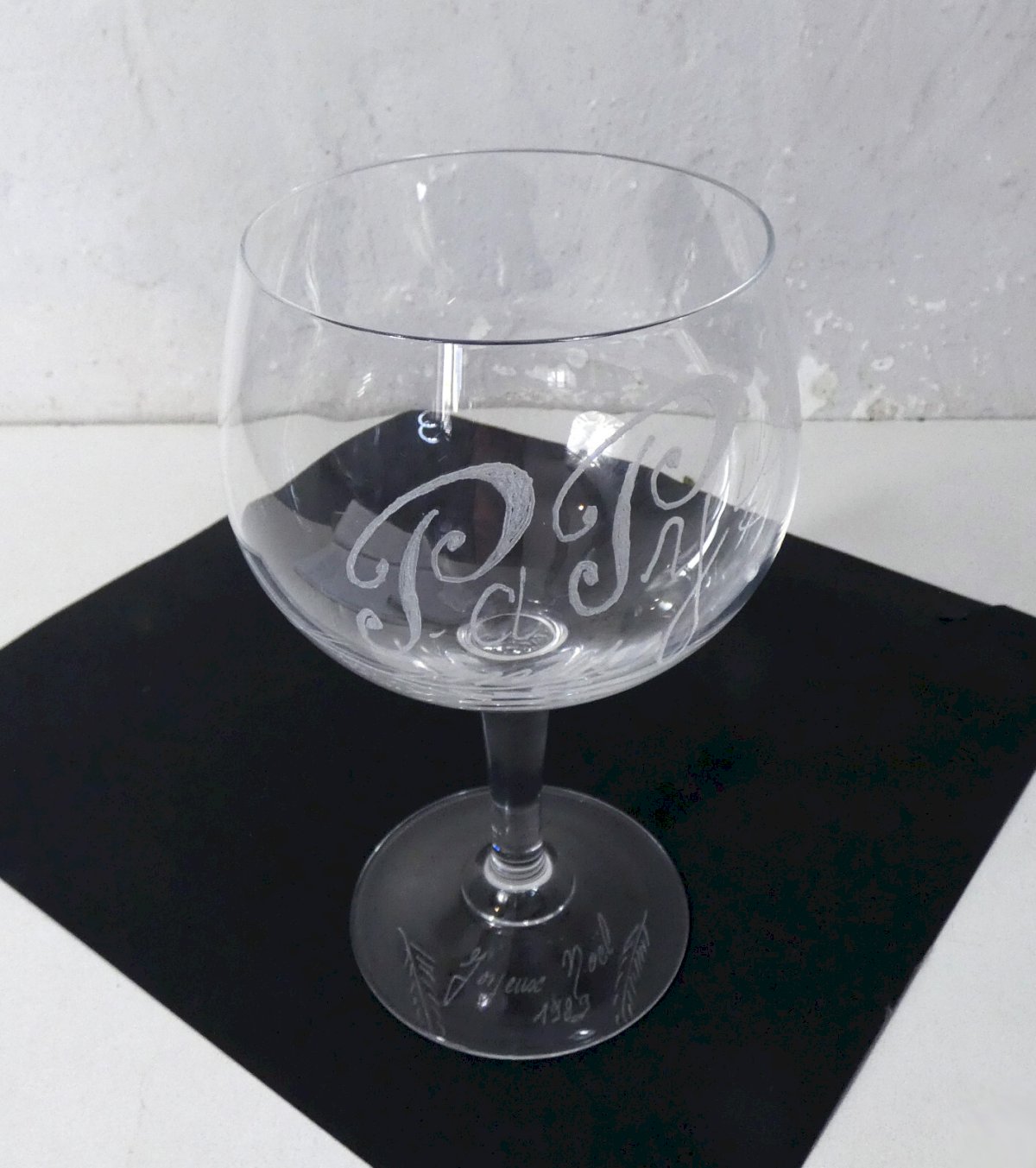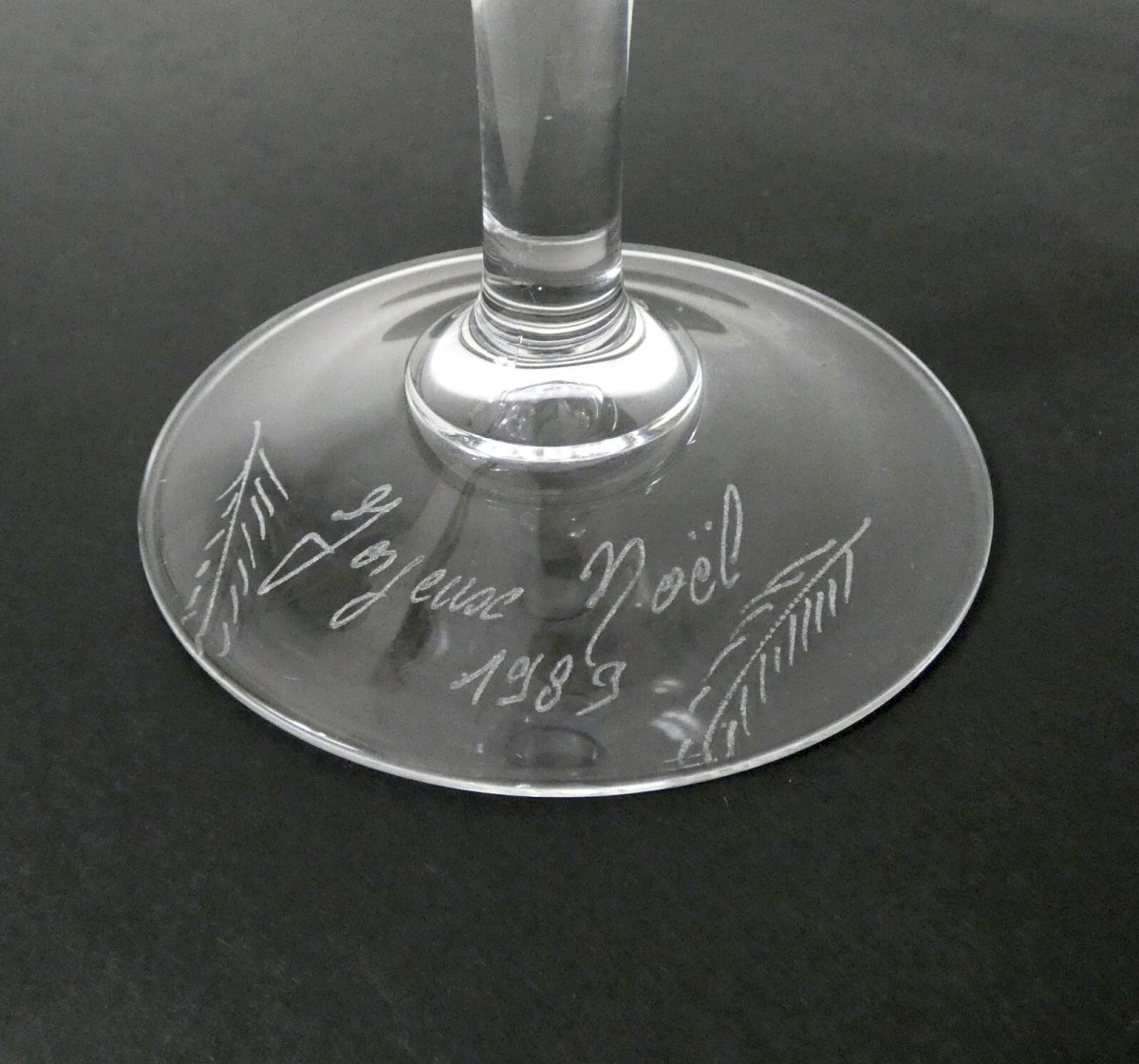 Balloon glass, made of crystal. The sound is clear and long, typical of lead crystal between 24 and 30%. Engraved glass "Papy," adorned with stylized fir branches. And "Merry Christmas 1989" engraved on the foot. Unsigned. Height: 19 cm. Diameter: 11 cm. In very good condition. Condition: Used: Item has been used. Item shows some signs of superficial wear, ... Used: Item has been used. Item shows some signs of superficial wear, fully operational and functioning correctly. It may be a demonstration model or an item returned to the store after a short period of use. any imperfections. Type: glass Material: Lead crystal
