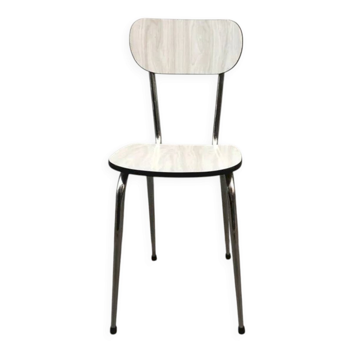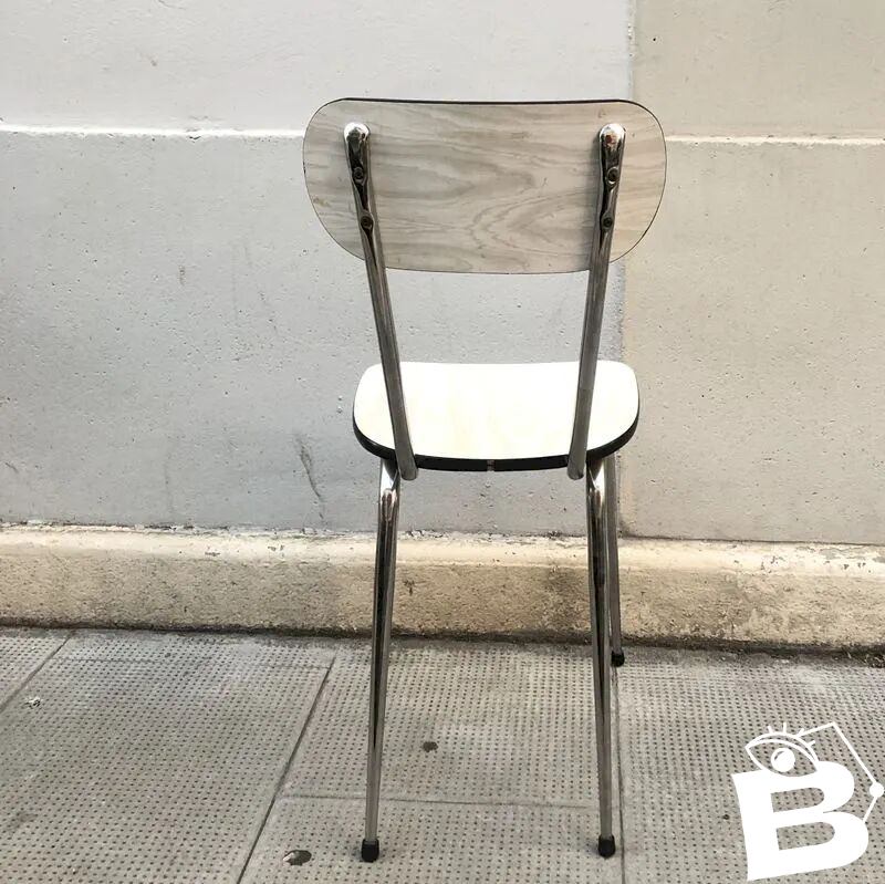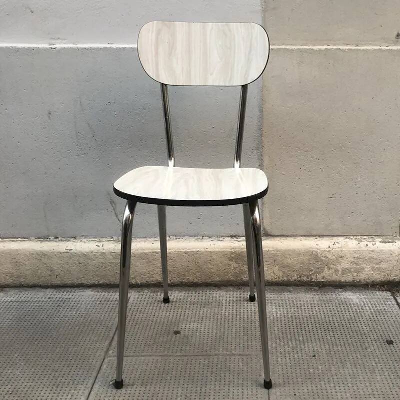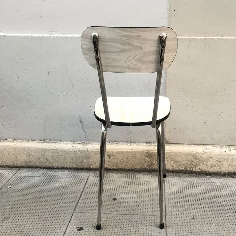 With its light marbled Formica seat and backrest, it brings softness and brightness, while its chrome metal legs give it that iconic look of period kitchens and bistros.