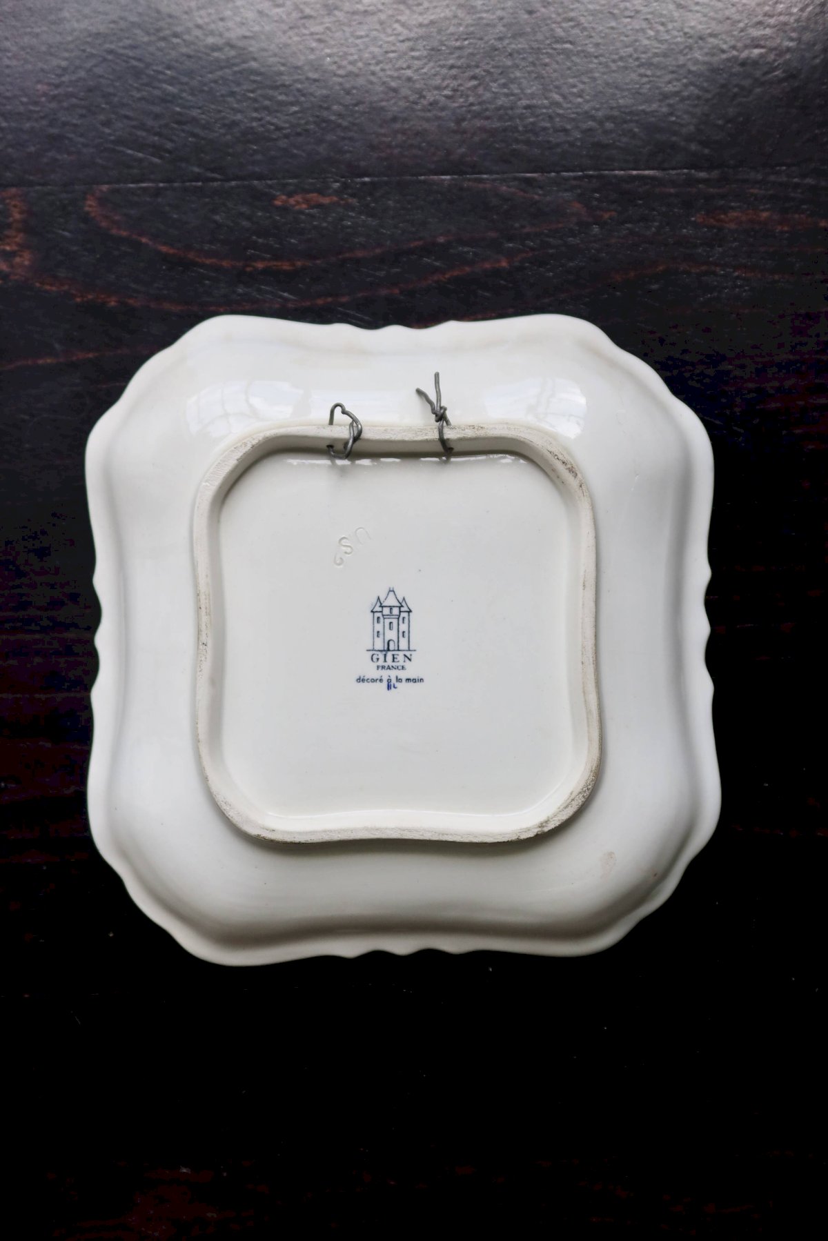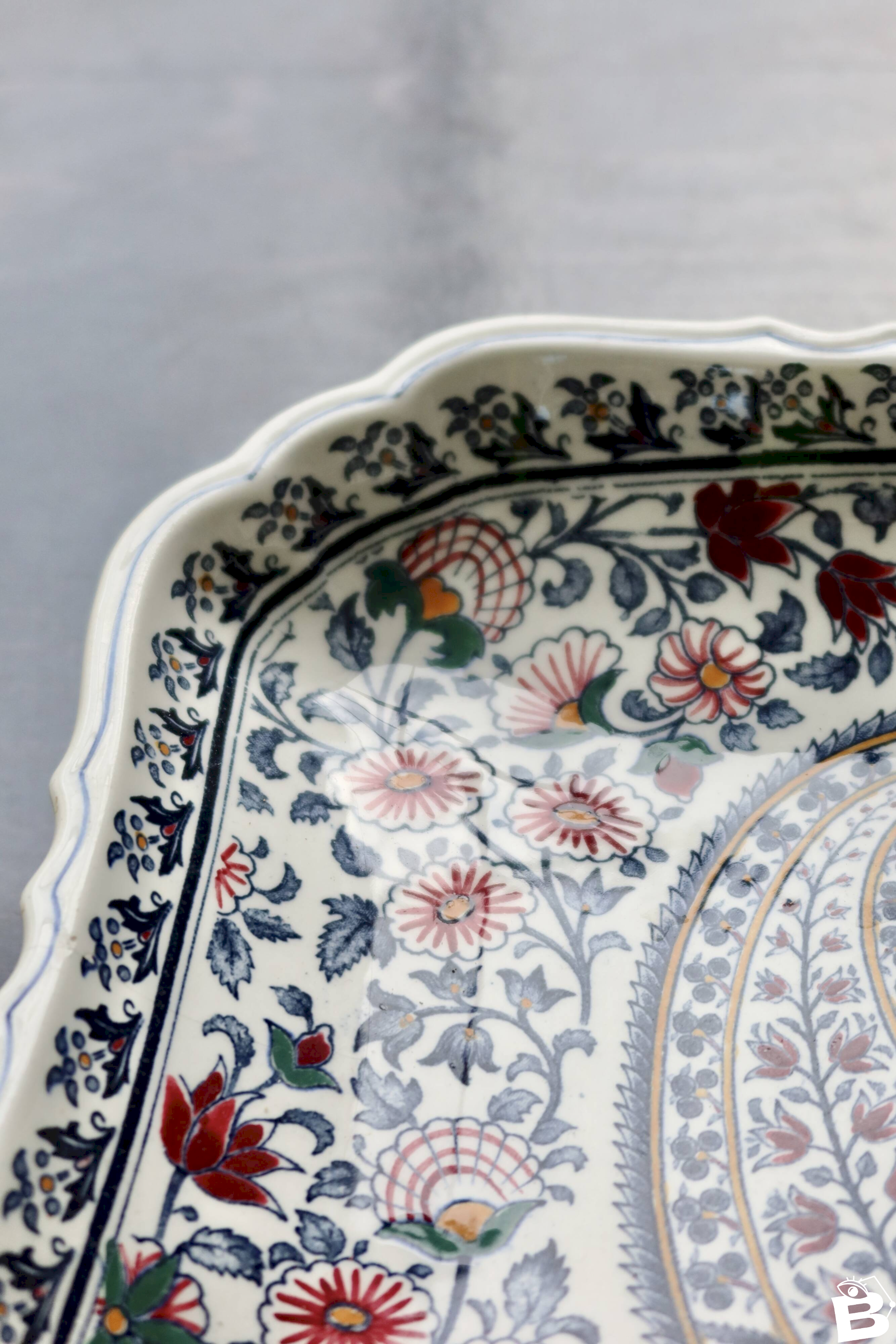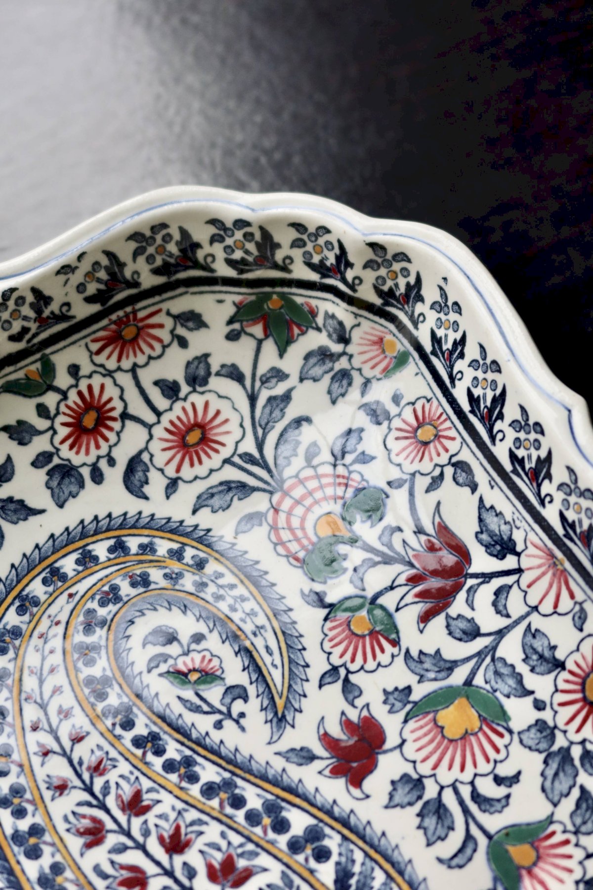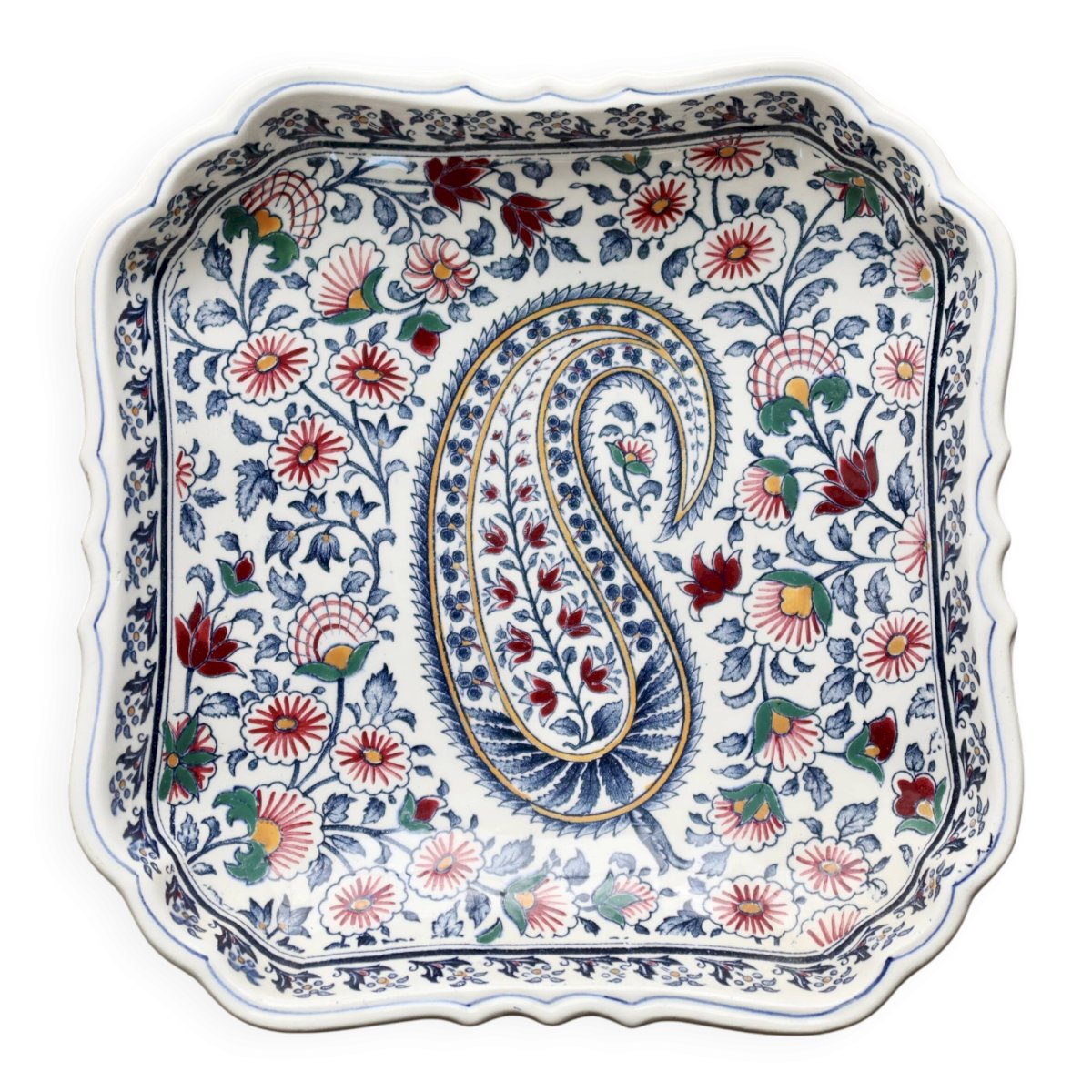Square and hollow earthenware plate from Gien, richly decorated with a paisley pattern featuring stylized flowers in shades of blue, red, and green, typical of the productions from the 1960s. The scalloped shape and the central decoration inspired by Oriental motifs make it a strong decorative piece, as elegant on a table as it is repurposed as a serving dish or a wall element. Overall good condition for a vintage piece, with possible minute signs of wear consistent with its age. Dimensions: 19.5cm x 3cm. L: 19 W: 19 H: 3