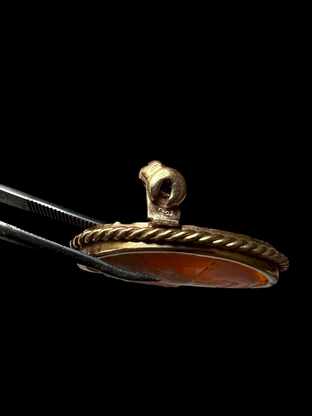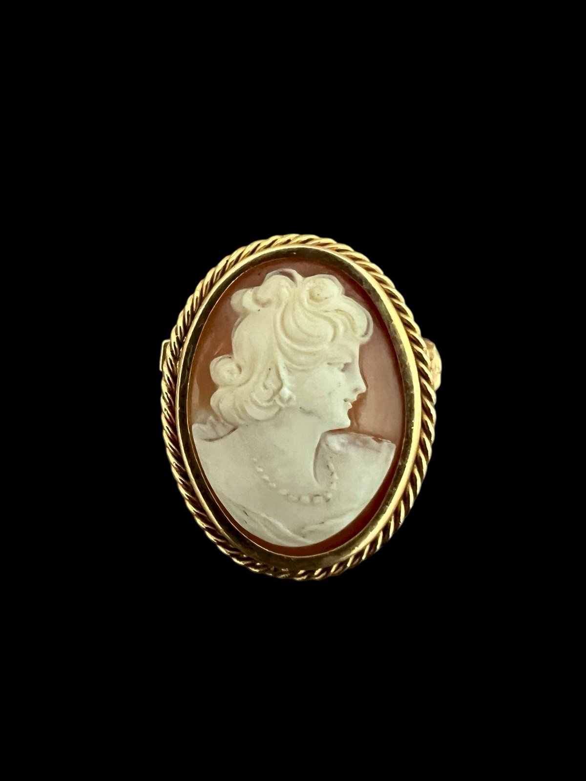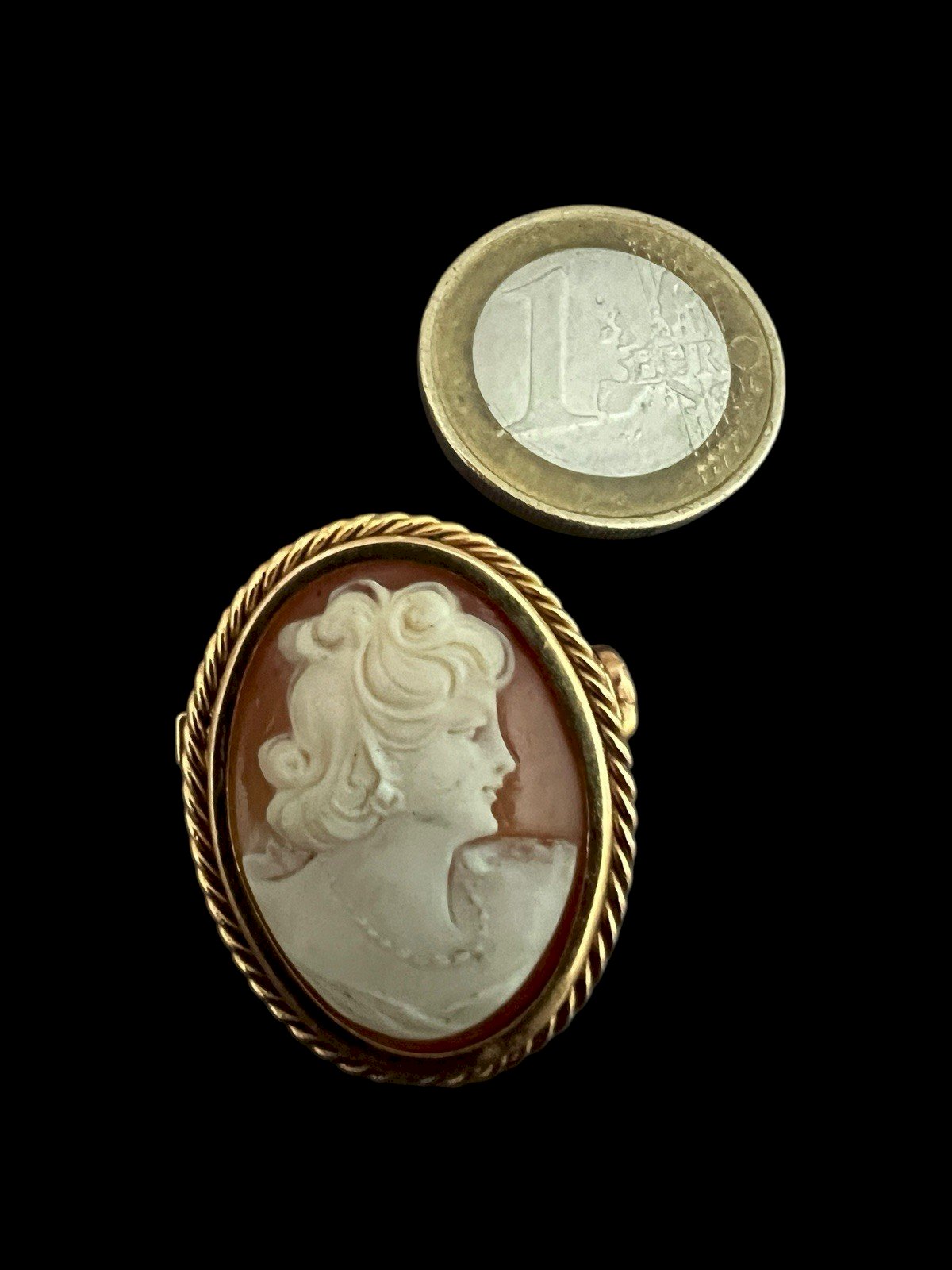 Cameo shell brooch plated in gold. Gold-plated brooch with a hallmark, see the third photo, set with a shell depicting a woman's face. Good vintage condition. Dimensions approximately 2.6 cm by 3 cm. Condition: Used: Item has been worn. ...Used: Item has been worn. any possible imperfections. Type: Brooch. Dominant color: Gold. Material: Shells. Metal: Yellow gold-plated. Theme: Female portrait.
