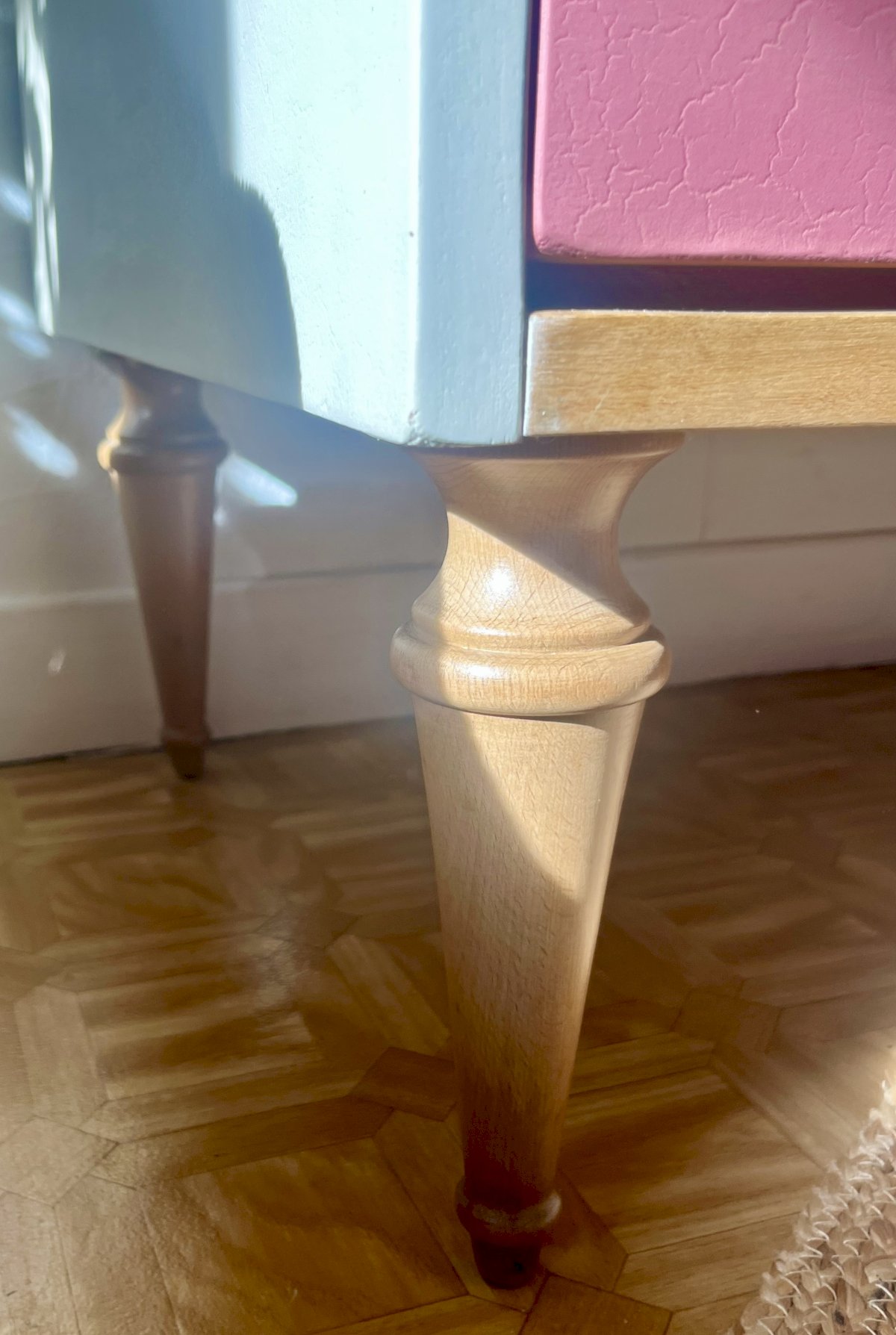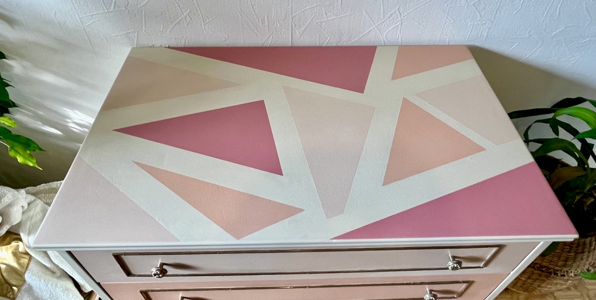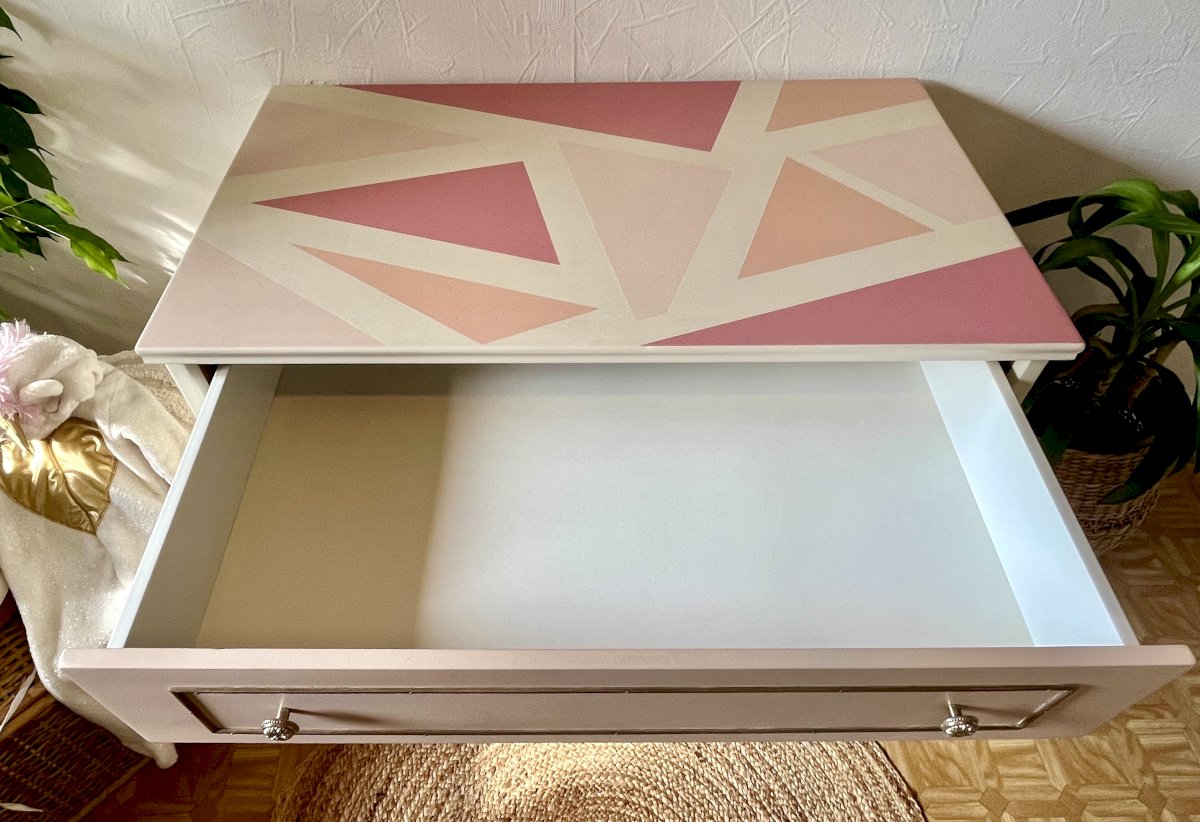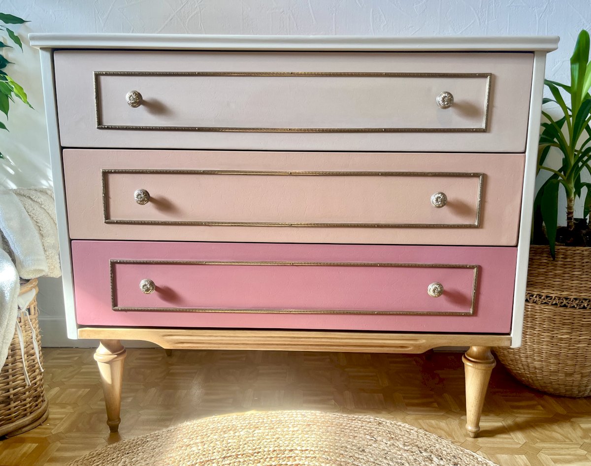 Add a colorful and bright touch to your room with this renovated chest of drawers in a gradient of pinks and cream.