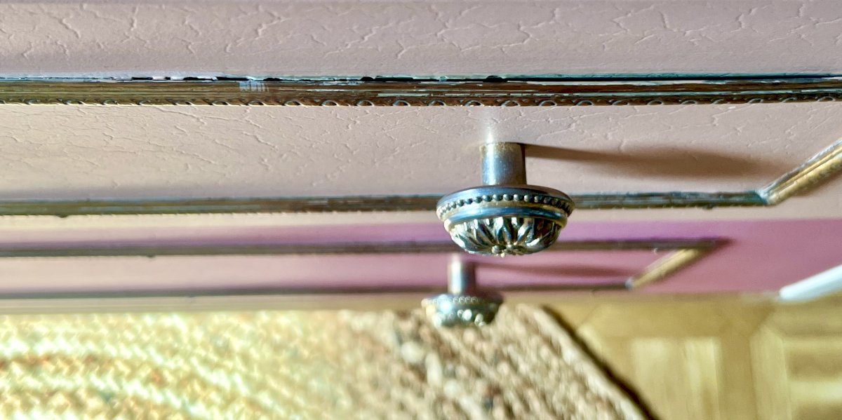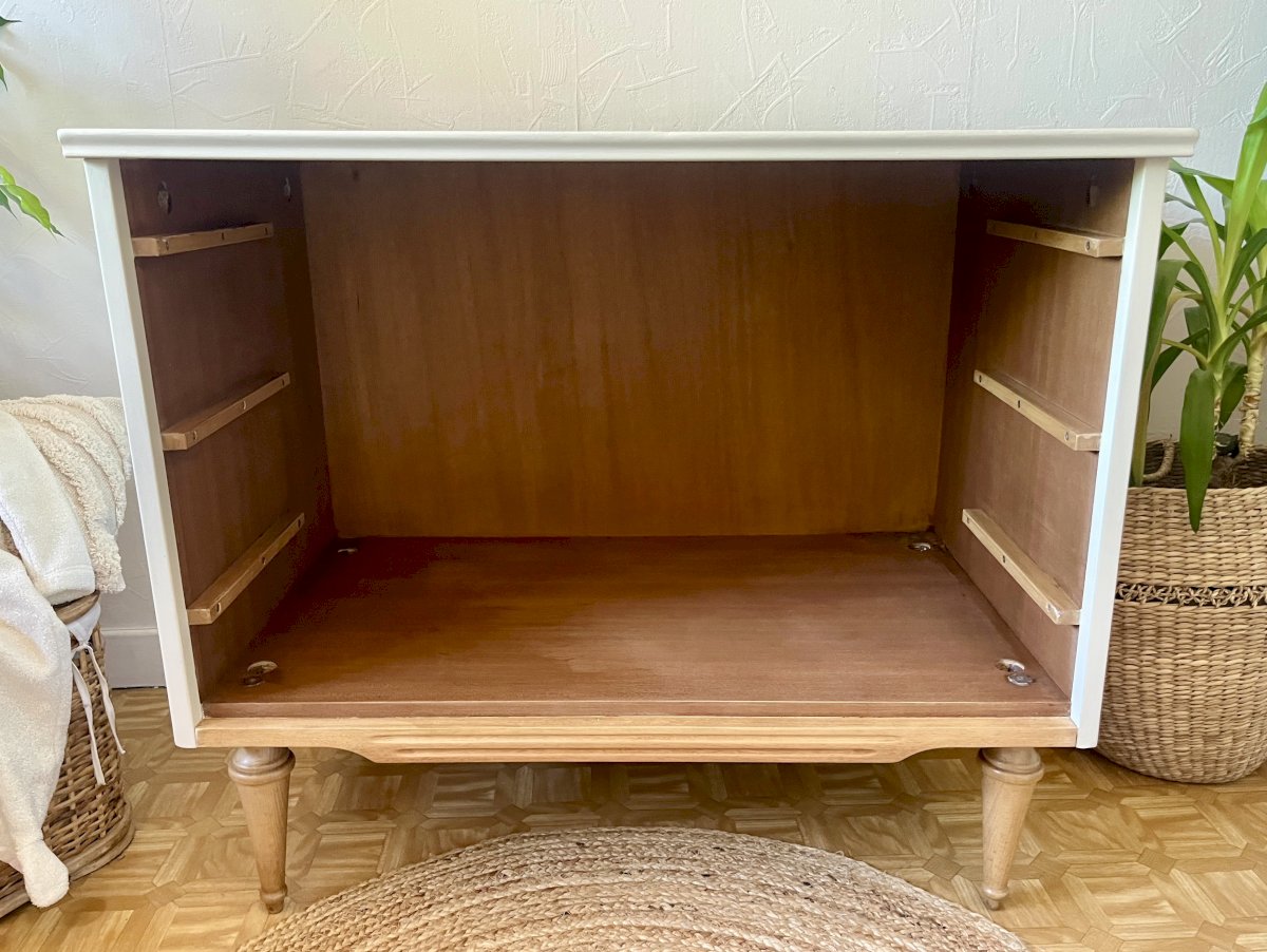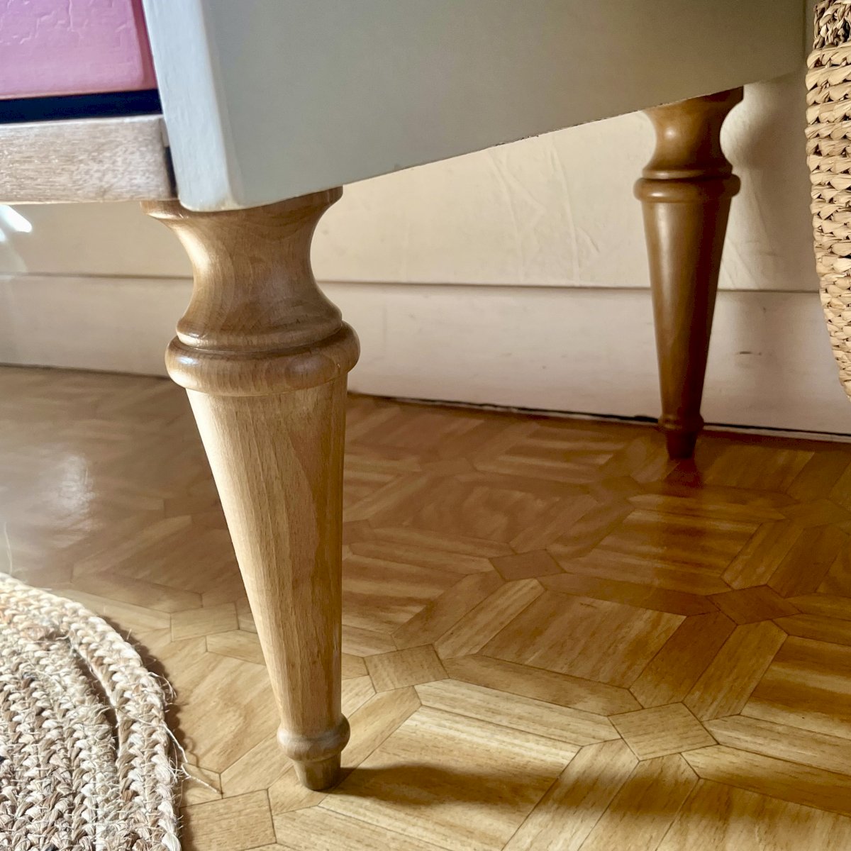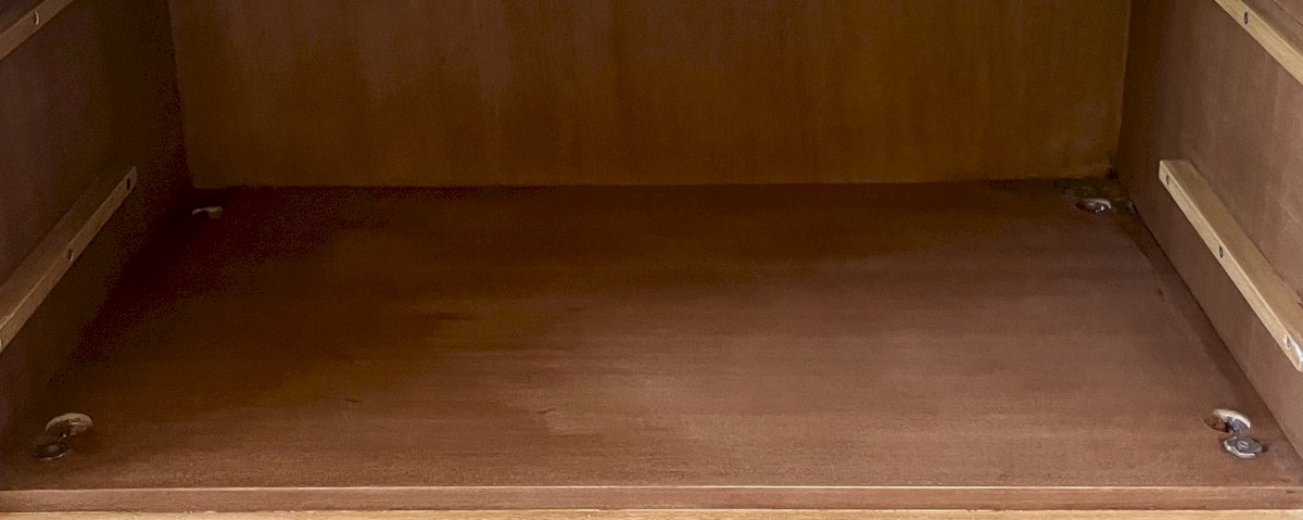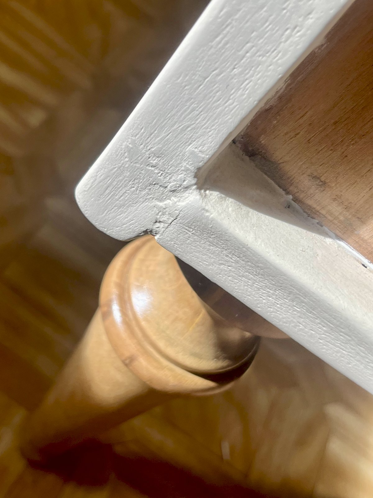 - Brand new screws on an original leg that was pulled out: visible patching on the inside beneath the last drawer, not very pretty but smooth, and it's on the inside...