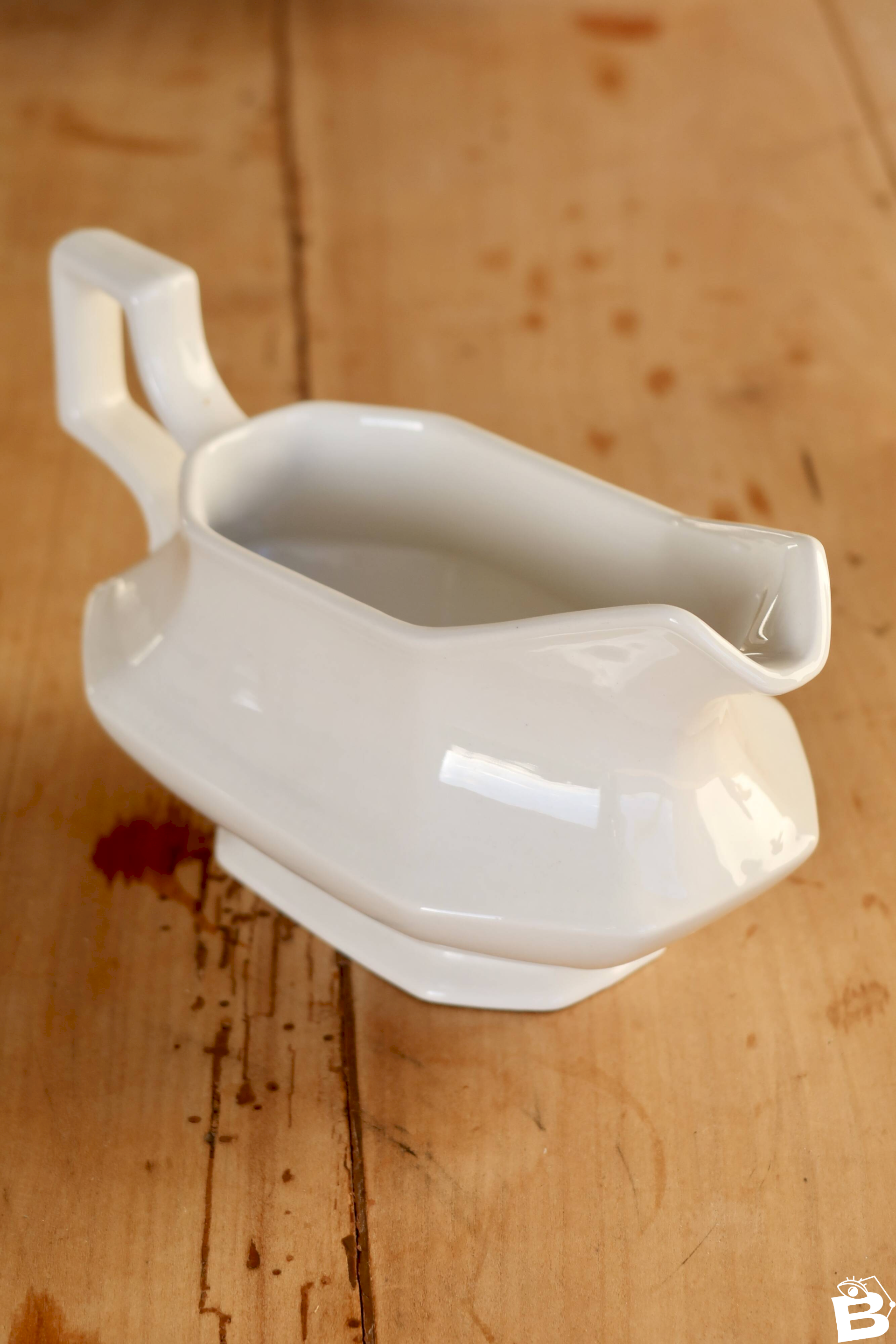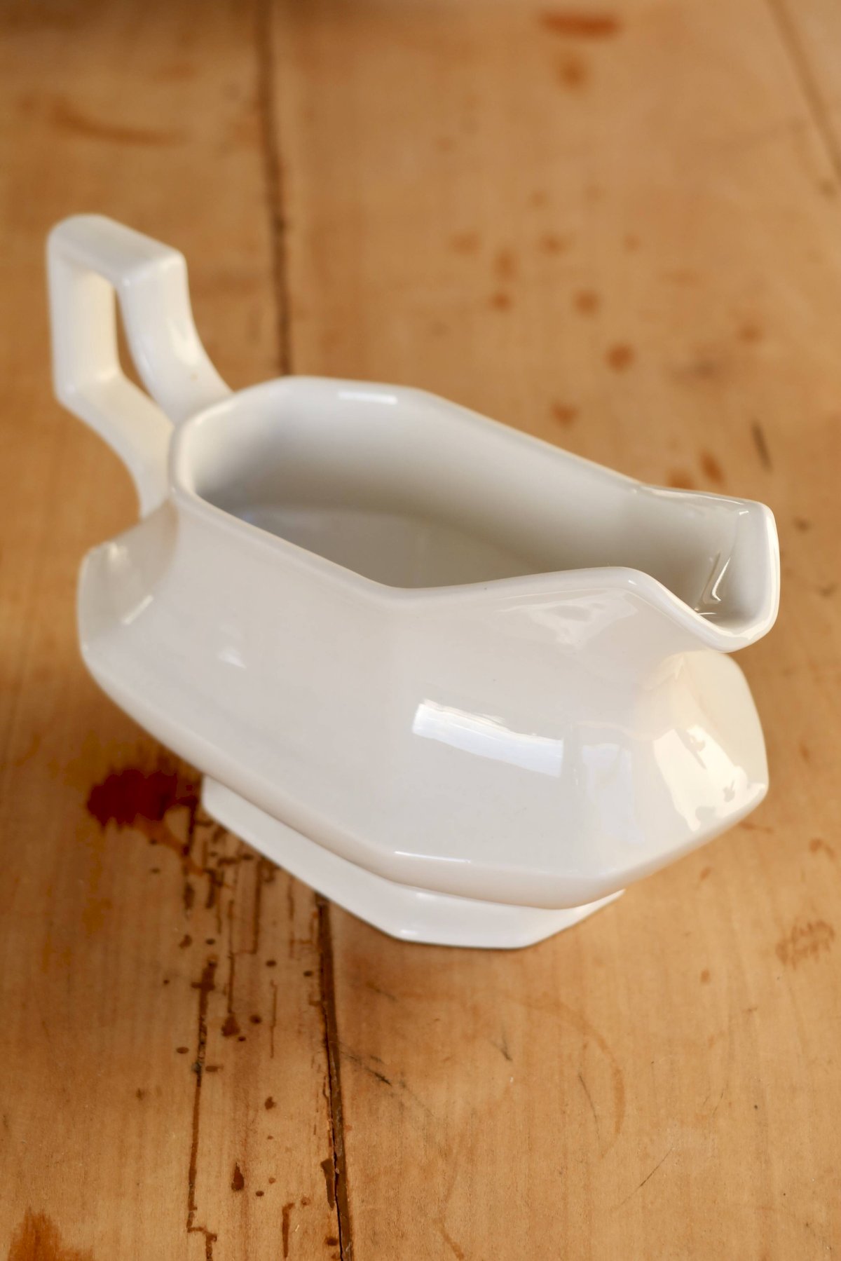 English porcelain sauceboat by Johnson Brothers, model Pearl, featuring a bright white highlighted by a delicate pearled relief.