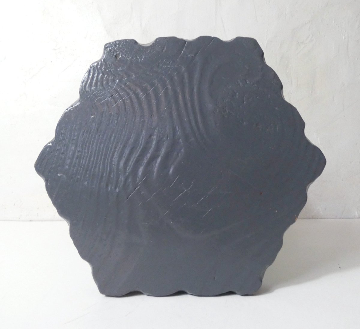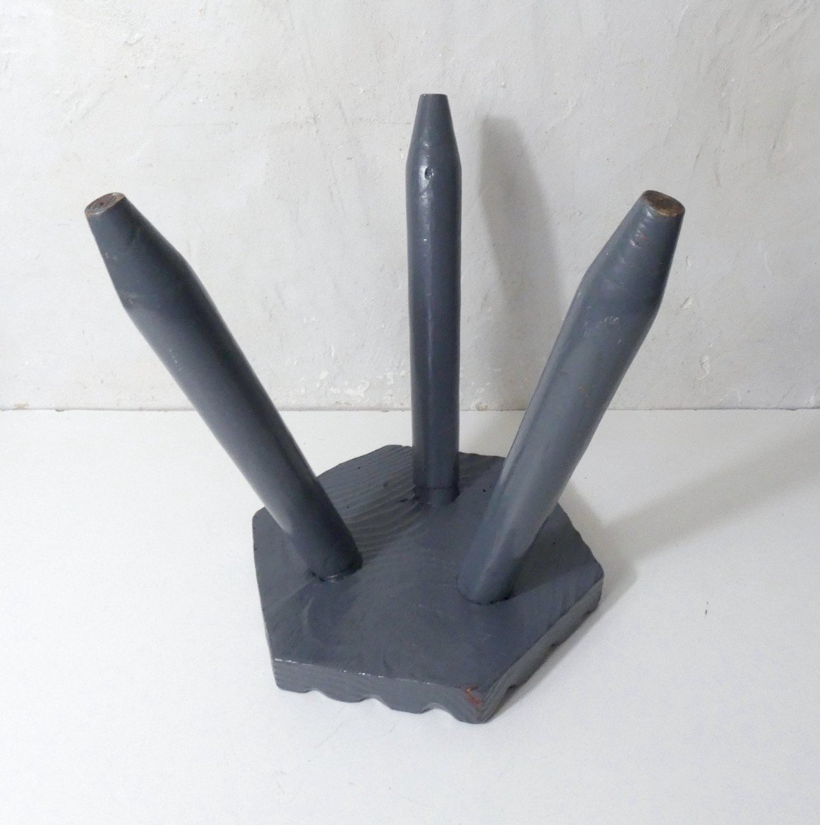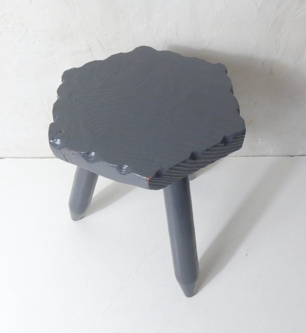 Antique three-legged stool, made of solid oak. Turned wooden legs. Original hexagonal seat. Height: 37.5 cm. Diameter: 30 cm. In very good condition. Fully functional. The wood and construction are reliable and sturdy. Color: Gray Type: Stool Material: Oak