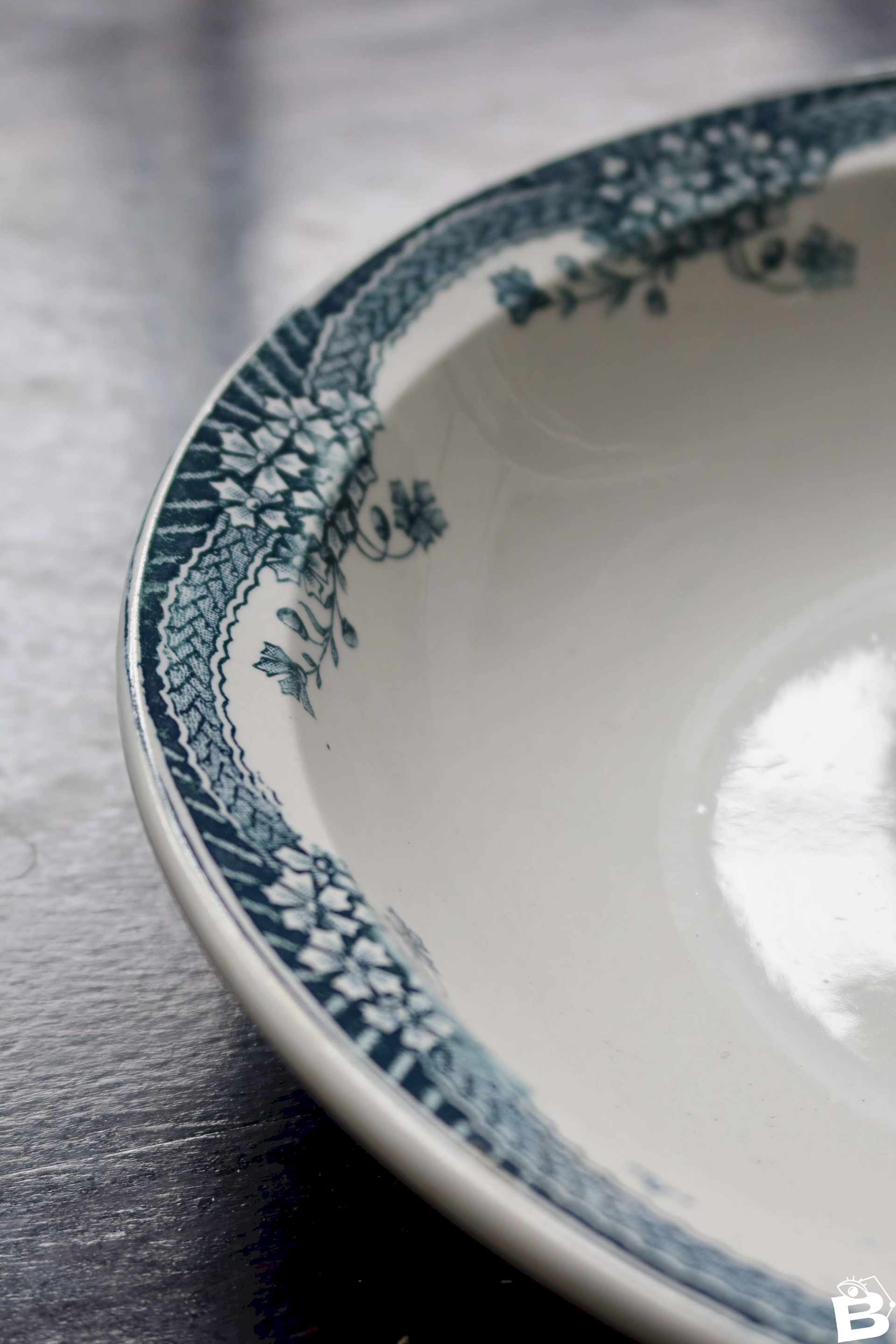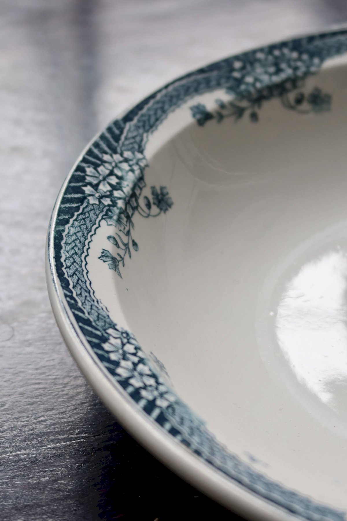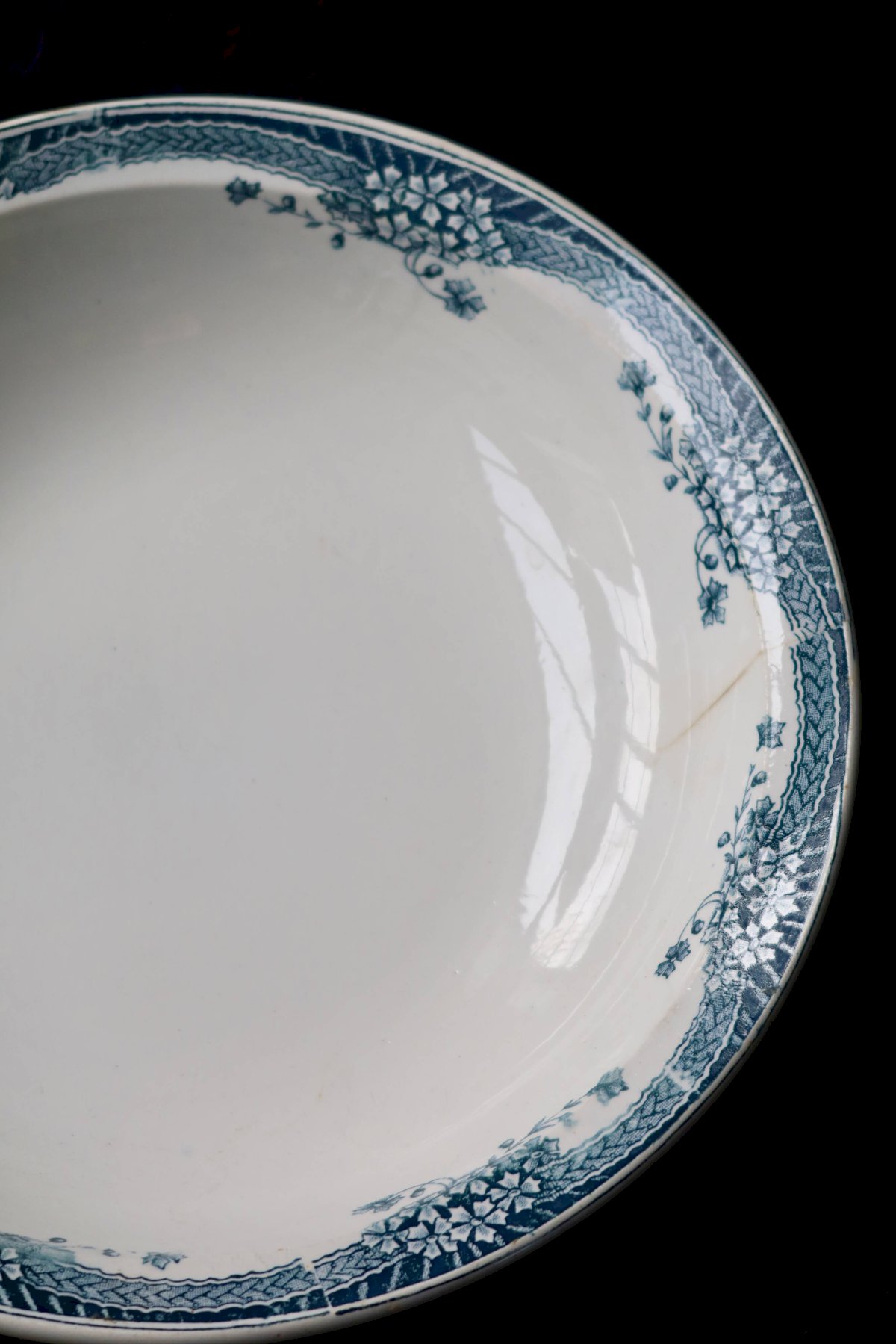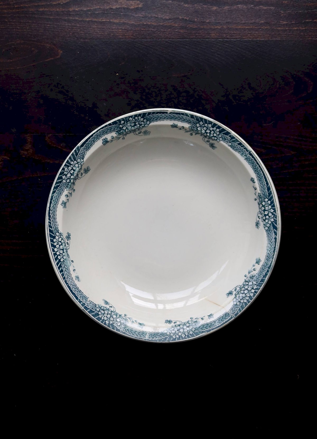 Large rim adorned with garlands of small flowers and fine trellis, antique enamel with beautiful network of cracks, micro signs of wear and a discreet hairline visible on the front (no chips or loss), typical blue-green hue slightly nuanced by time. Dimensions: 30cm in diameter. L: 30 W: 30 H: 2