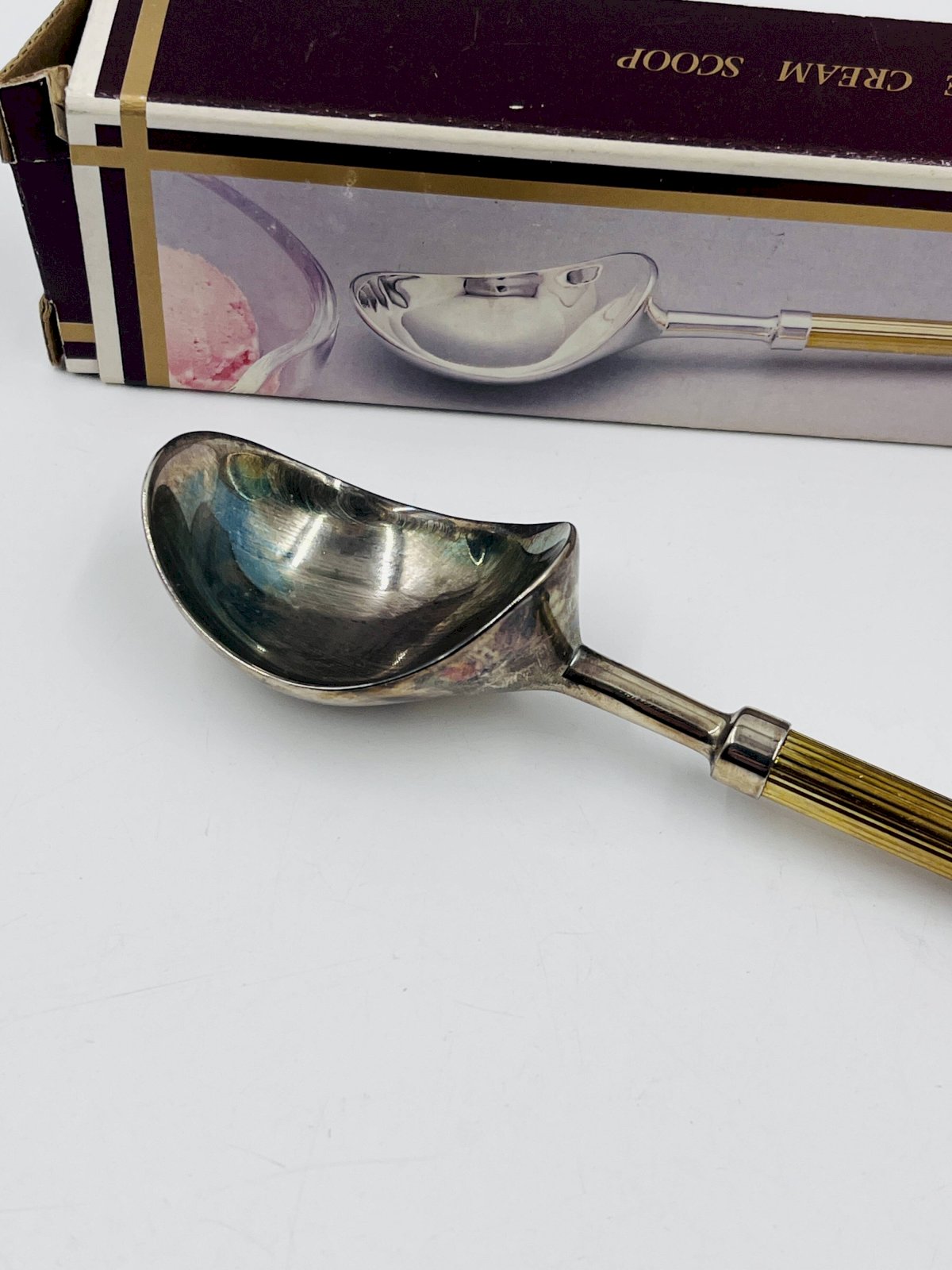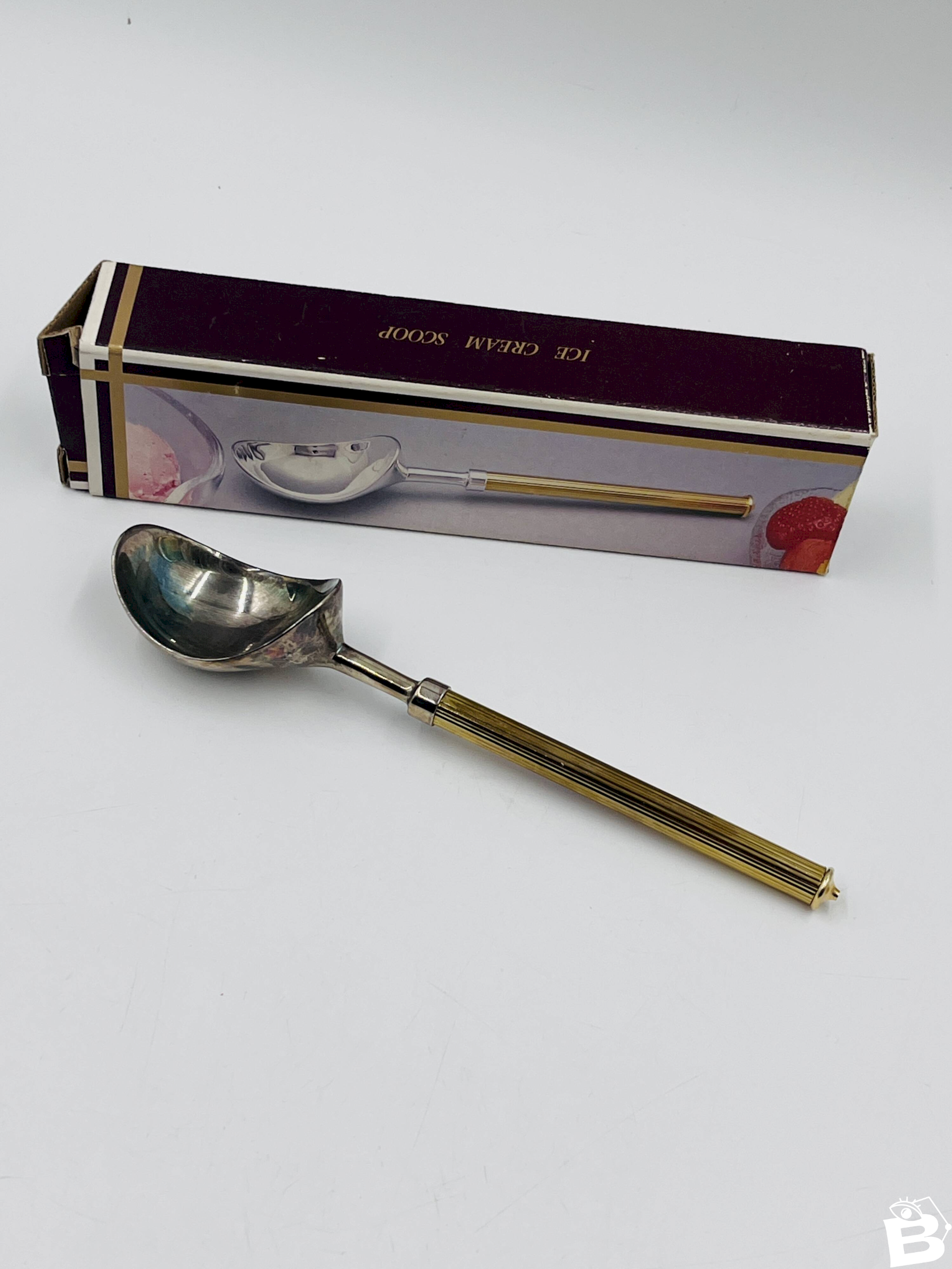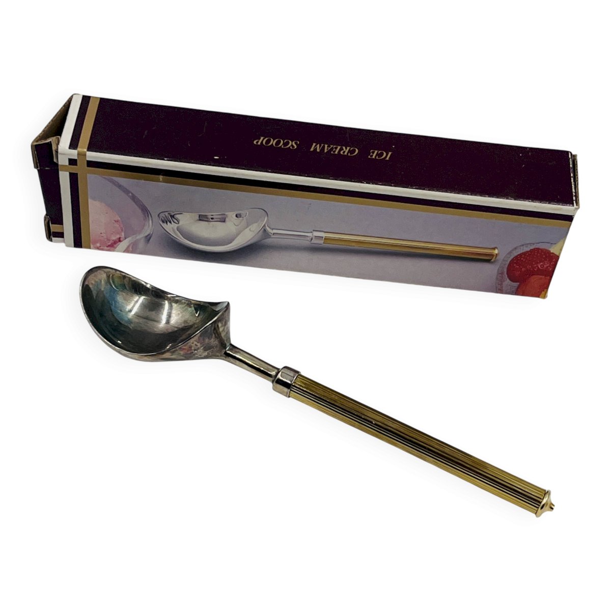 Elegant ice cream spoon with a refined design, featuring a golden ribbed handle and an ergonomic silver-plated head, ideal for serving ice creams, sorbets, or frozen desserts with precision. Its chic and timeless aesthetic makes it a beautiful tableware item, suitable for both everyday use and for a neat presentation during events. It is sold with its original box, which is a real plus for a gift or for vintage tableware enthusiasts. Condition: Very good overall condition.