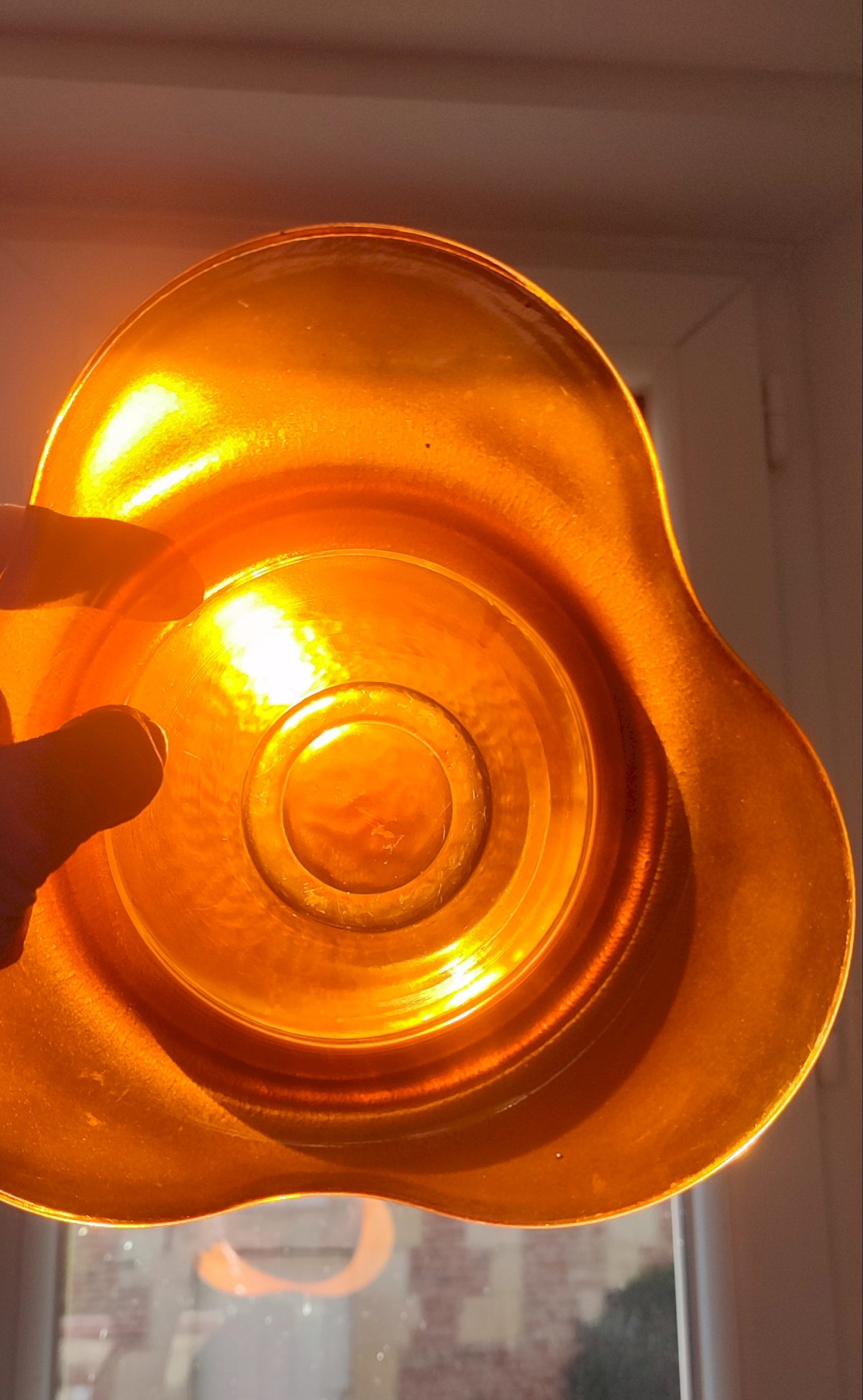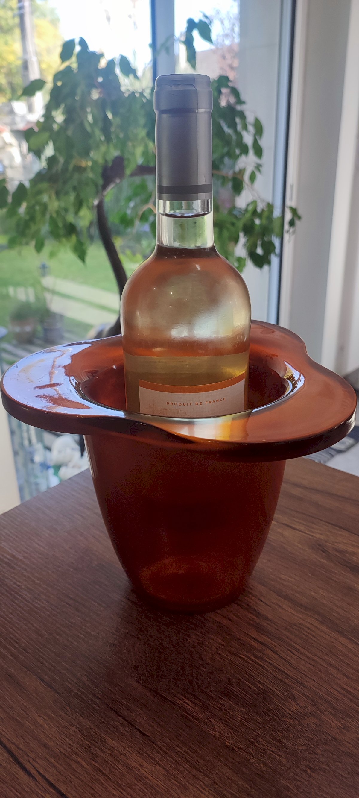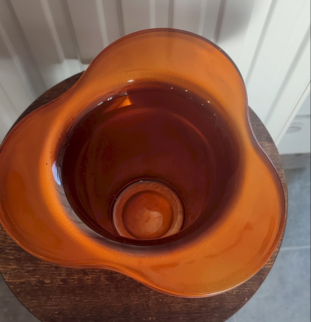 Thick glass vase painted hot or coated with a metallic film (often based on oxide), typical of the 1970s–1980s period. Coppery orange tone with iridescent metallic reflections, 70s design. Flared shape with a wide neck. French or Italian glasswork. Can serve as a vase or a bottle cooler. Very good condition. Height 15 cm. Maximum width 19 cm. Weight 1622 g.