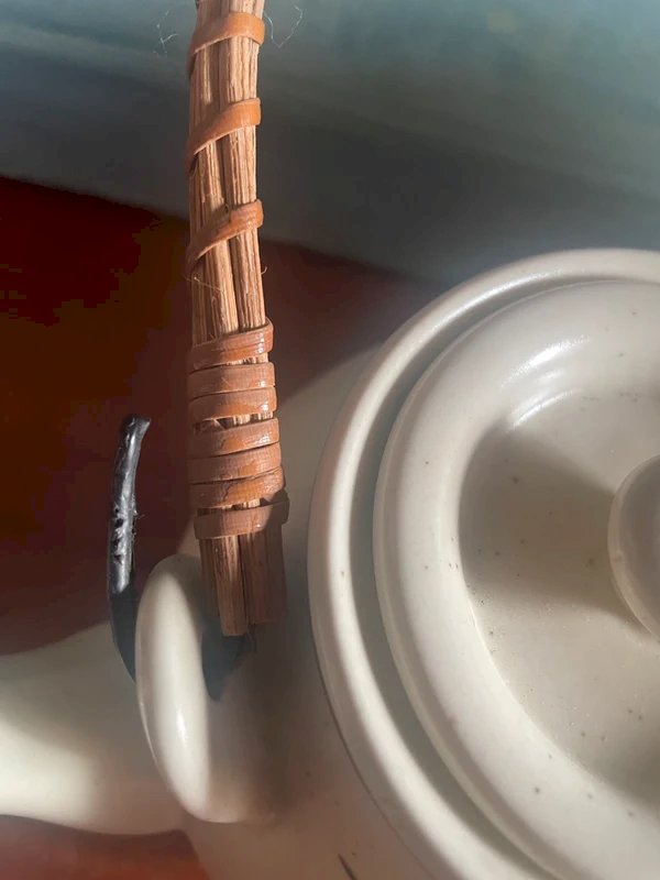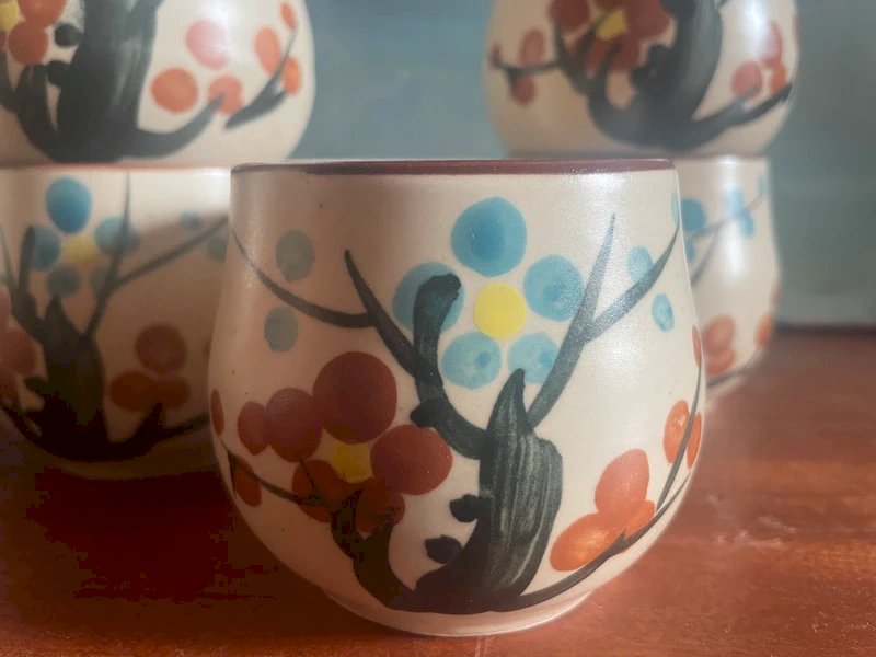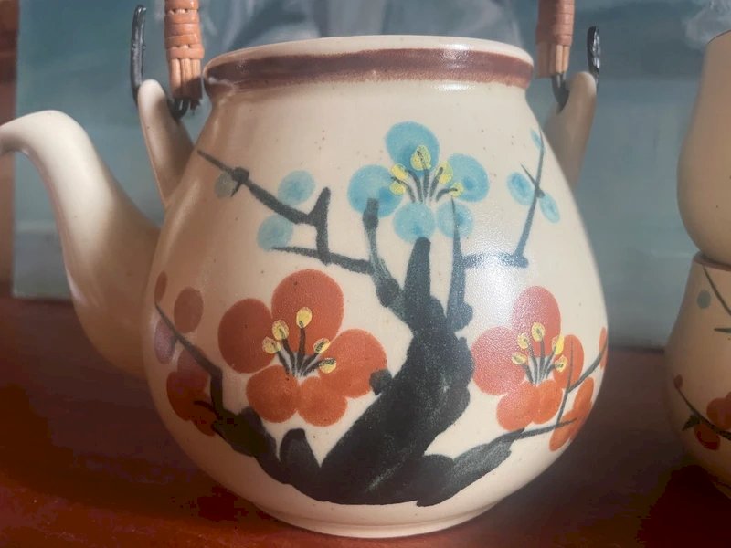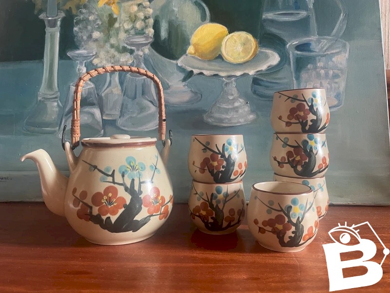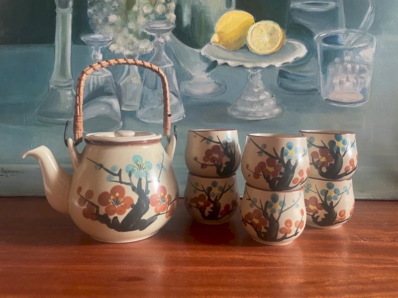 Very nice speckled beige stoneware service with hand-painted floral decoration in a Japonese style - Teapot handle in woven rattan. Very good condition. Cup height 7cm. Teapot height 13cm without the handle.
