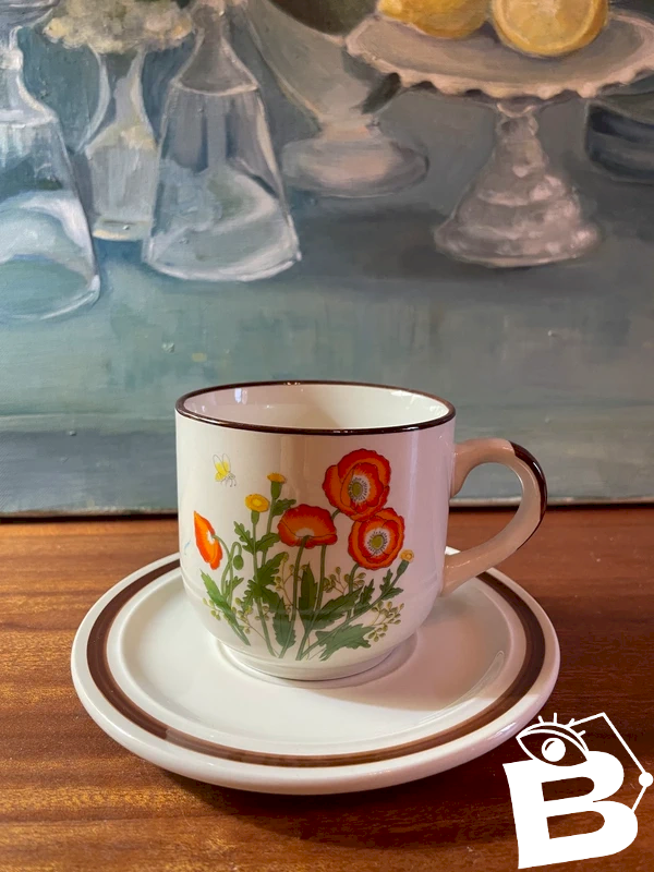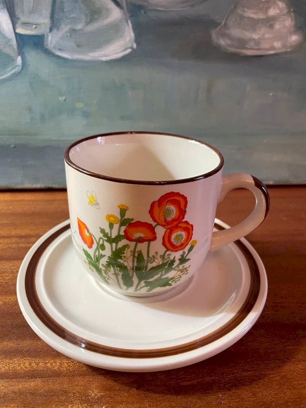 Vintage stoneware cup and saucer with poppy patterns Made in Korea Very good condition Saucer diameter 15.5 cm Cup height 8 cm, diameter 8.5 cm