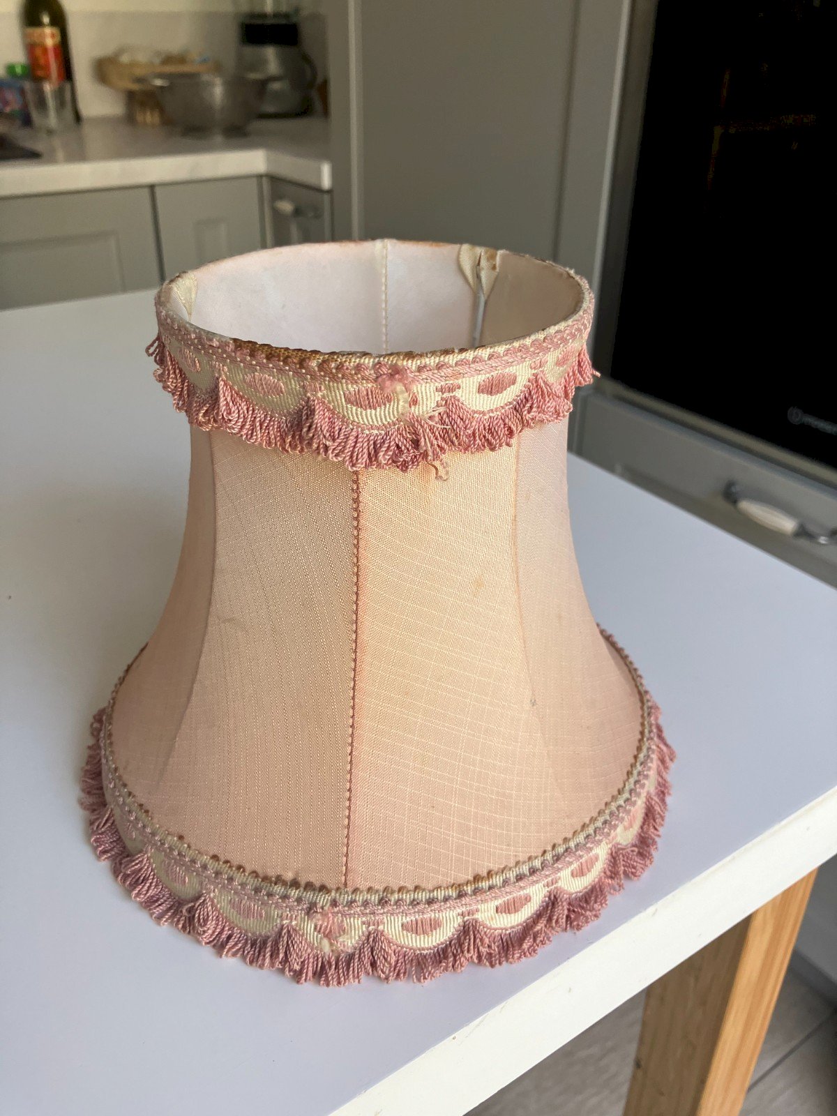 vintage lampshade made of bordered fabric for bedside lamp base diameter 18 cm upper diameter 11 cm height 15 cm fixing hole diameter 15 mm signs of use - wear and tear with a snag in one place shipping via MONDIALRELAY Type: Lampshade Material: Fabric