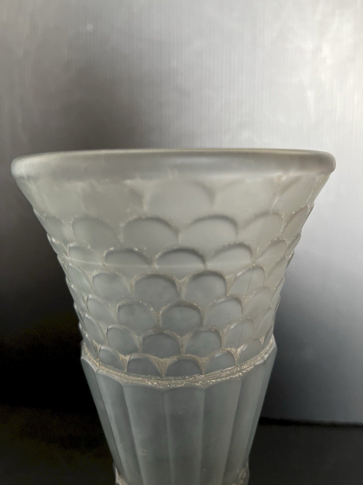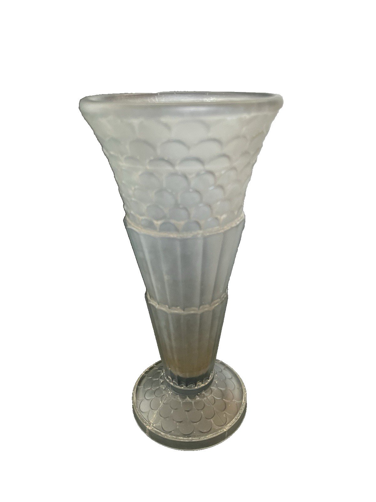 Vintage light blue pressed molded glass vase in Art Deco style. Beautiful geometric design with scales. Good condition, height 22 cm, base diameter 8.50 cm, neck diameter 9.50 cm, weight 750 g. Please see the photos above, which also serve as a description. Careful and secure packaging with the option of shipping via postal service to select during your purchase for shipping cost calculation. (Otherwise, standard Mondial Relay shipping) Thank you all and happy hunting in my shop. Returns accepted within 14 days from receipt, return in its original packaging, in its initial condition, no refund for items returned broken or lost by the carrier, return shipping at the buyer's expense. Don't hesitate to add my shop to your favorites!