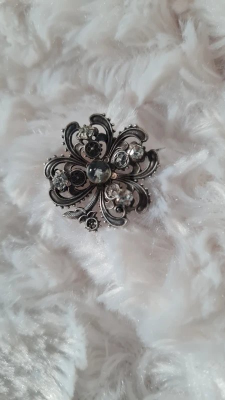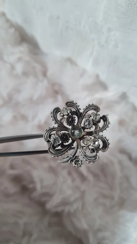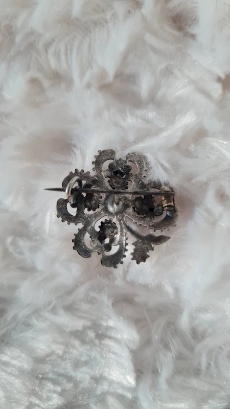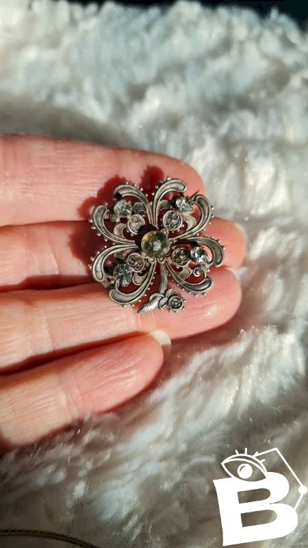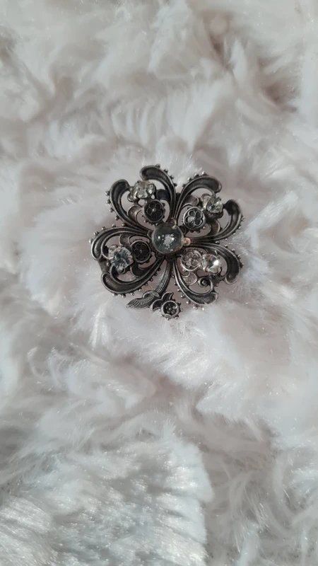 Old beautiful brooch, rhinestone decoration, silver-plated metal, vintage.