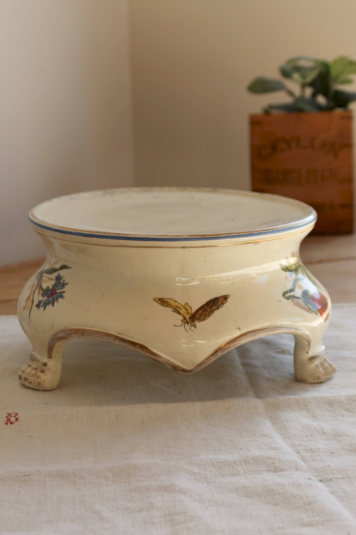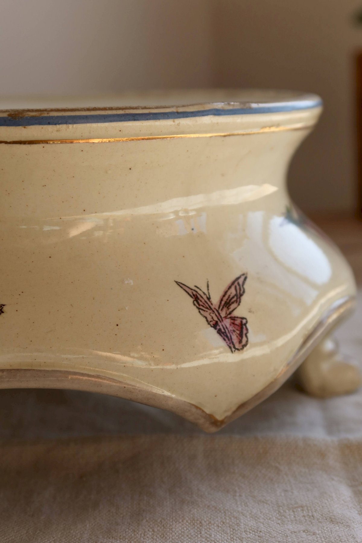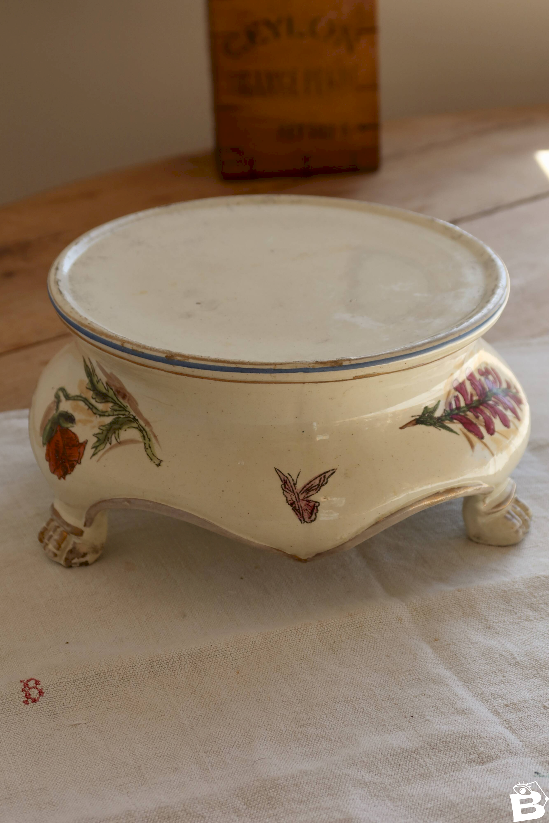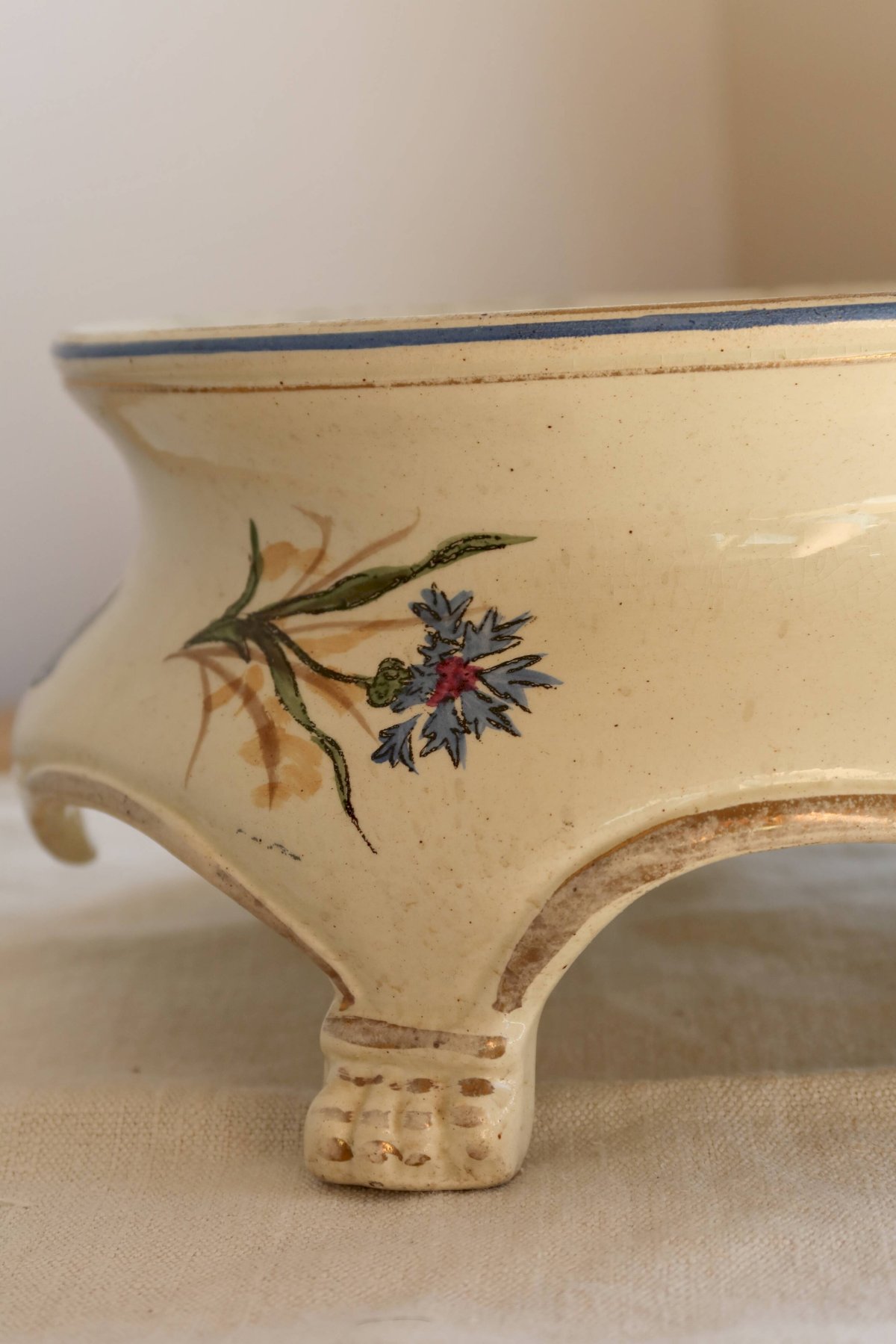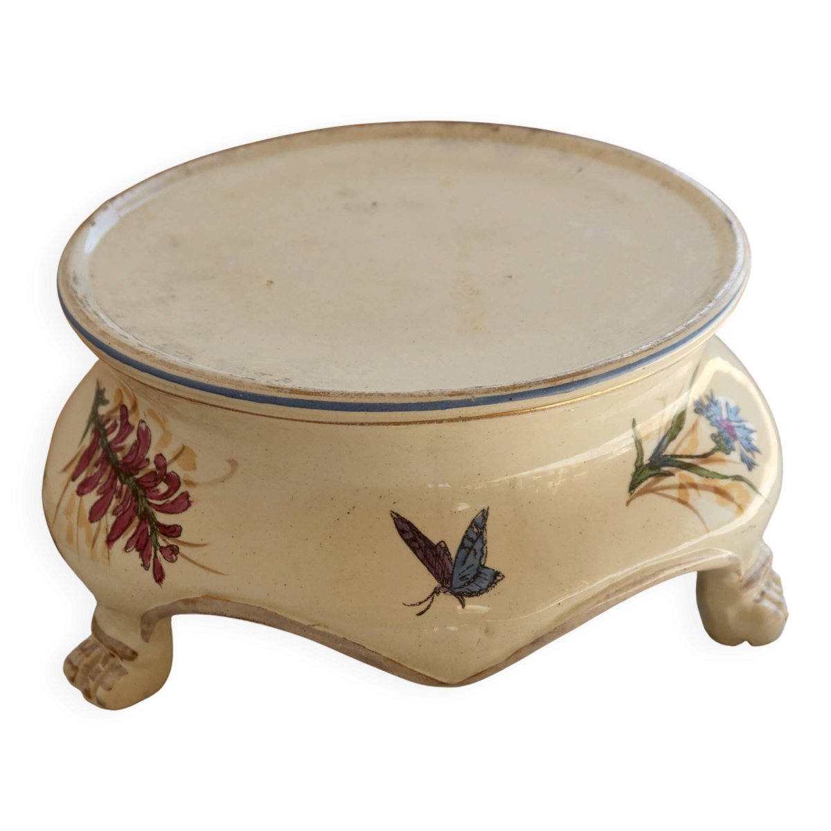 Its elegant shape on small curved feet makes it a refined decorative object, ideal for holding a small plant, a candle, or serving as a display. Signs of wear consistent with its age (slight wear to the decoration and rim, small marks) add to its charm. Diameter: 19.5cm X 11cm. L: 19 W: 19 H: 11.