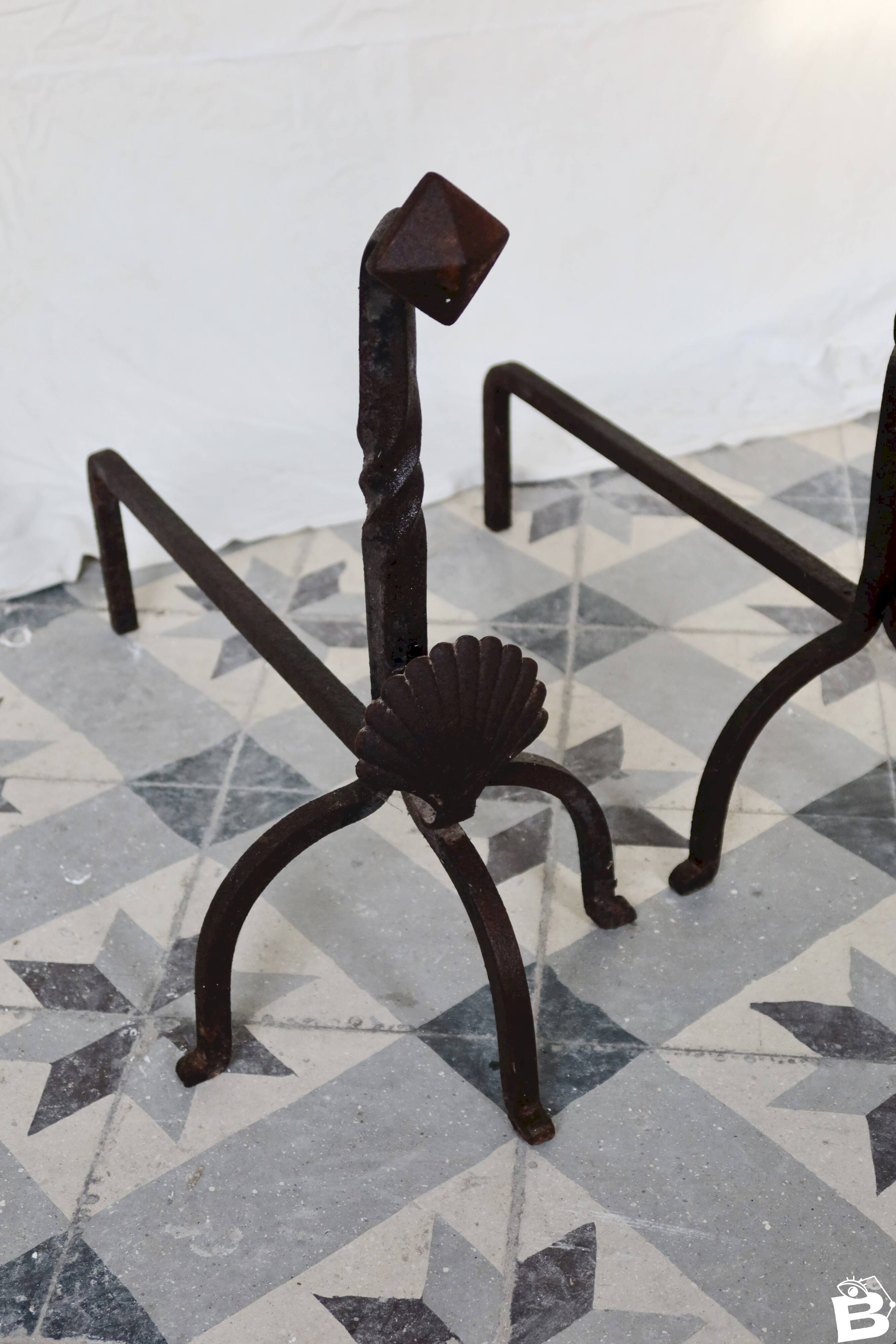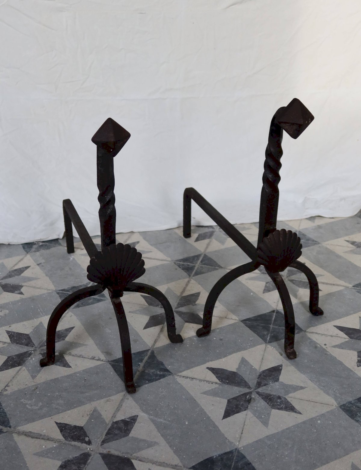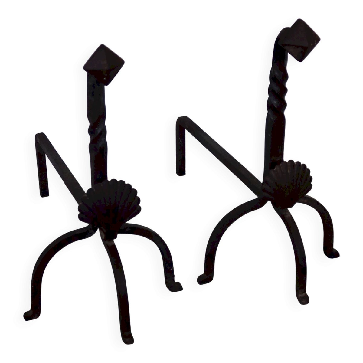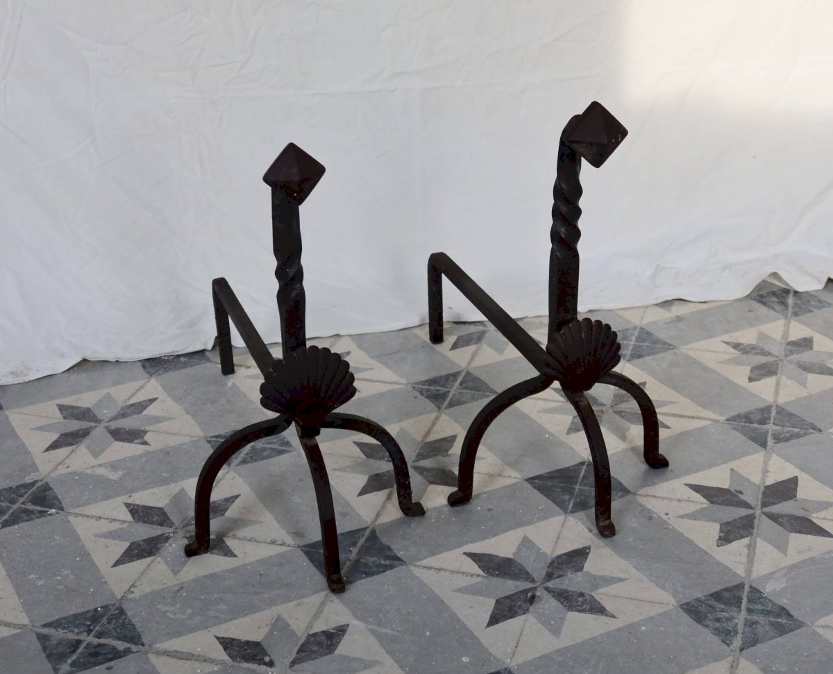 Pair of antique metal and cast iron fire-dogs, adorned with a shell motif on the front and twisted uprights. Their marked patina and signs of wear testify to their age and authenticity. A decorative and functional set, ideal for an old fireplace or a decor inspired by classical and rustic styles. Dimensions: 55cm X 47cm X 37cm. L: 55 W: 37 H: 47