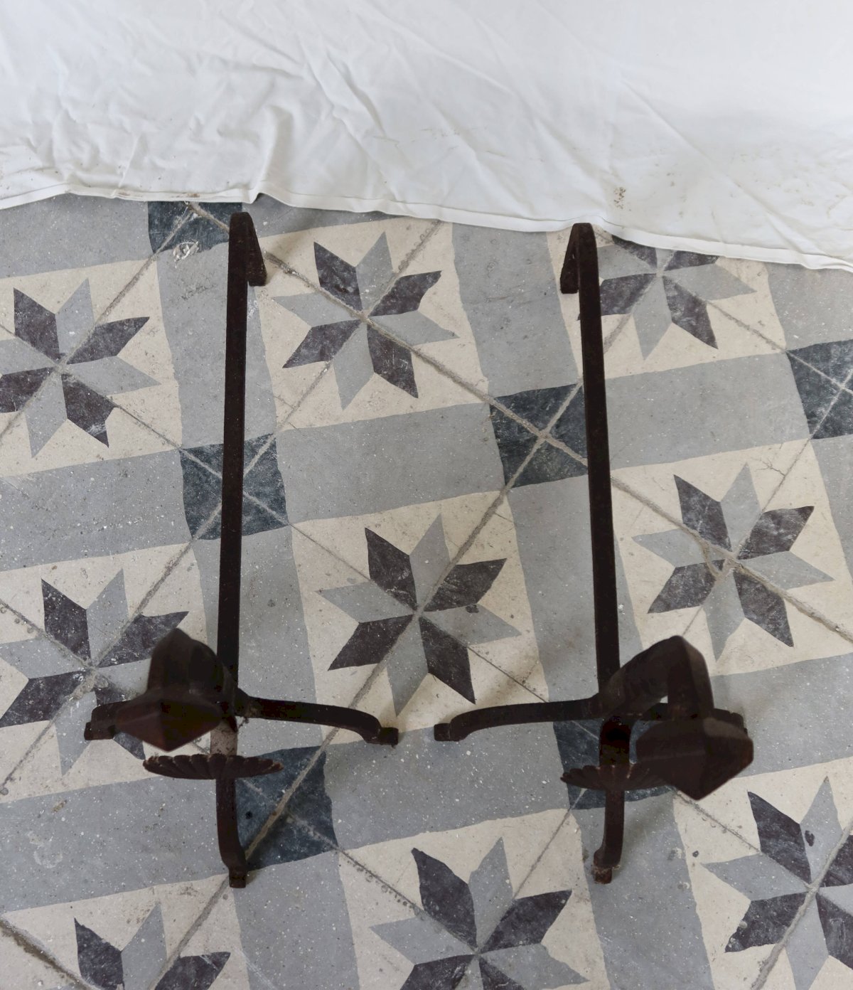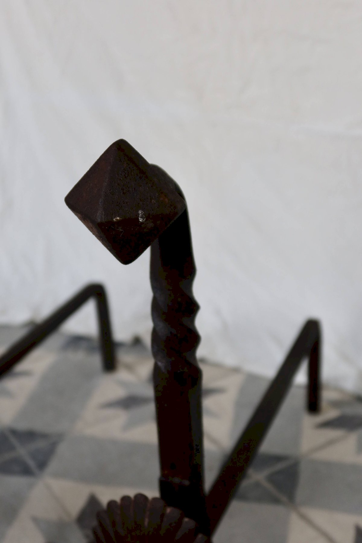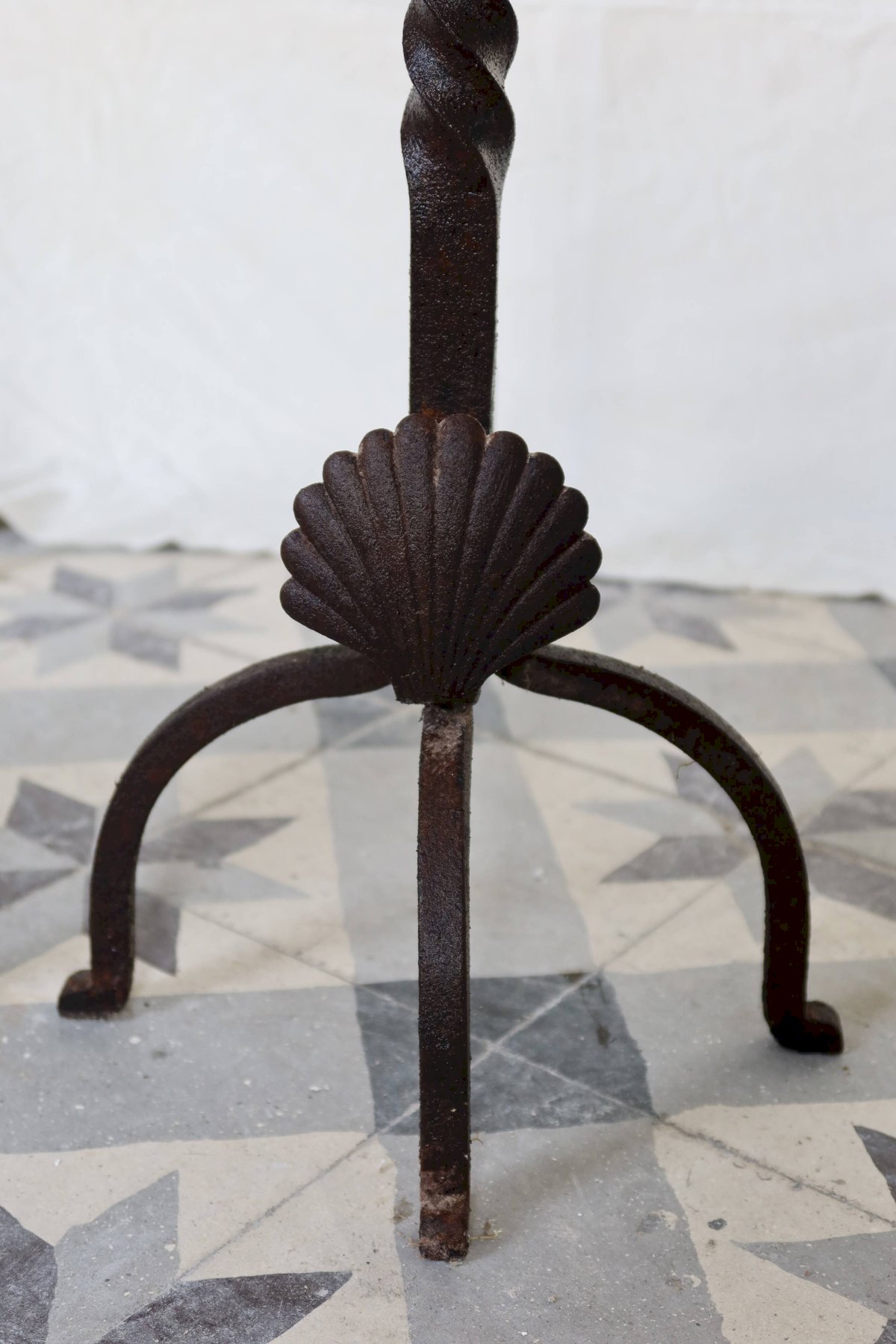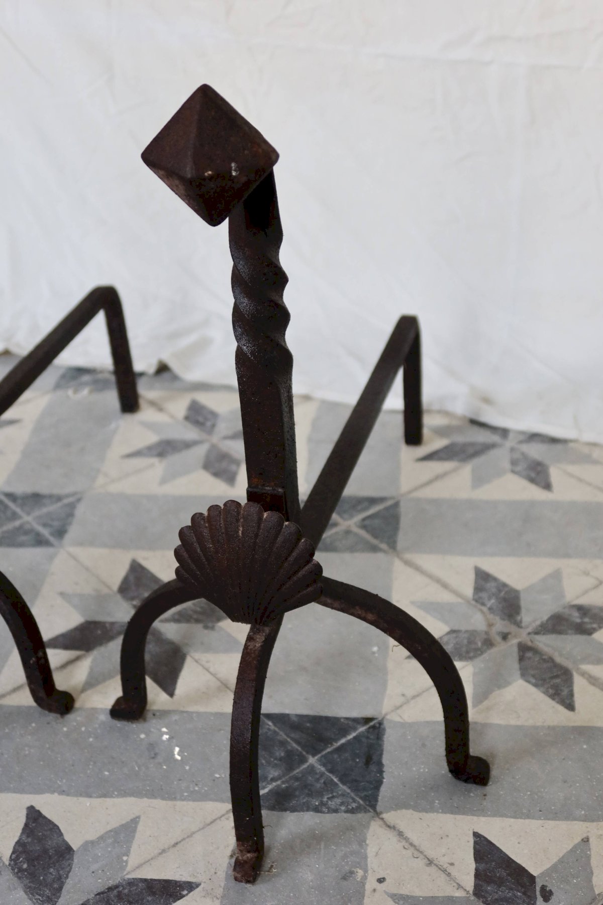 Pair of antique metal and cast iron fire-dogs, adorned with a shell motif on the front and twisted uprights. Their marked patina and signs of wear testify to their age and authenticity. A decorative and functional set, ideal for an old fireplace or a decor inspired by classical and rustic styles. Dimensions: 55cm X 47cm X 37cm. L: 55 W: 37 H: 47