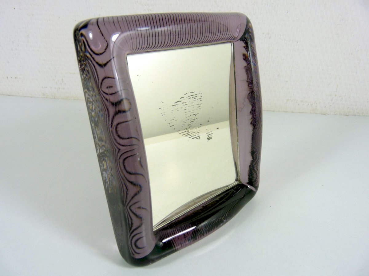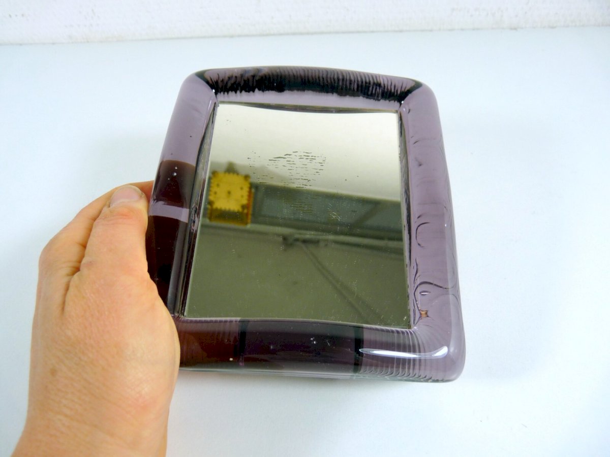 Vintage mirror frame glass Murano? purple, not signed. Very good overall condition, a few small stains, see photos. Dimensions: Height: 14 cm, Width: 13 cm, Depth: 3 cm, Weight: 1063 gr.