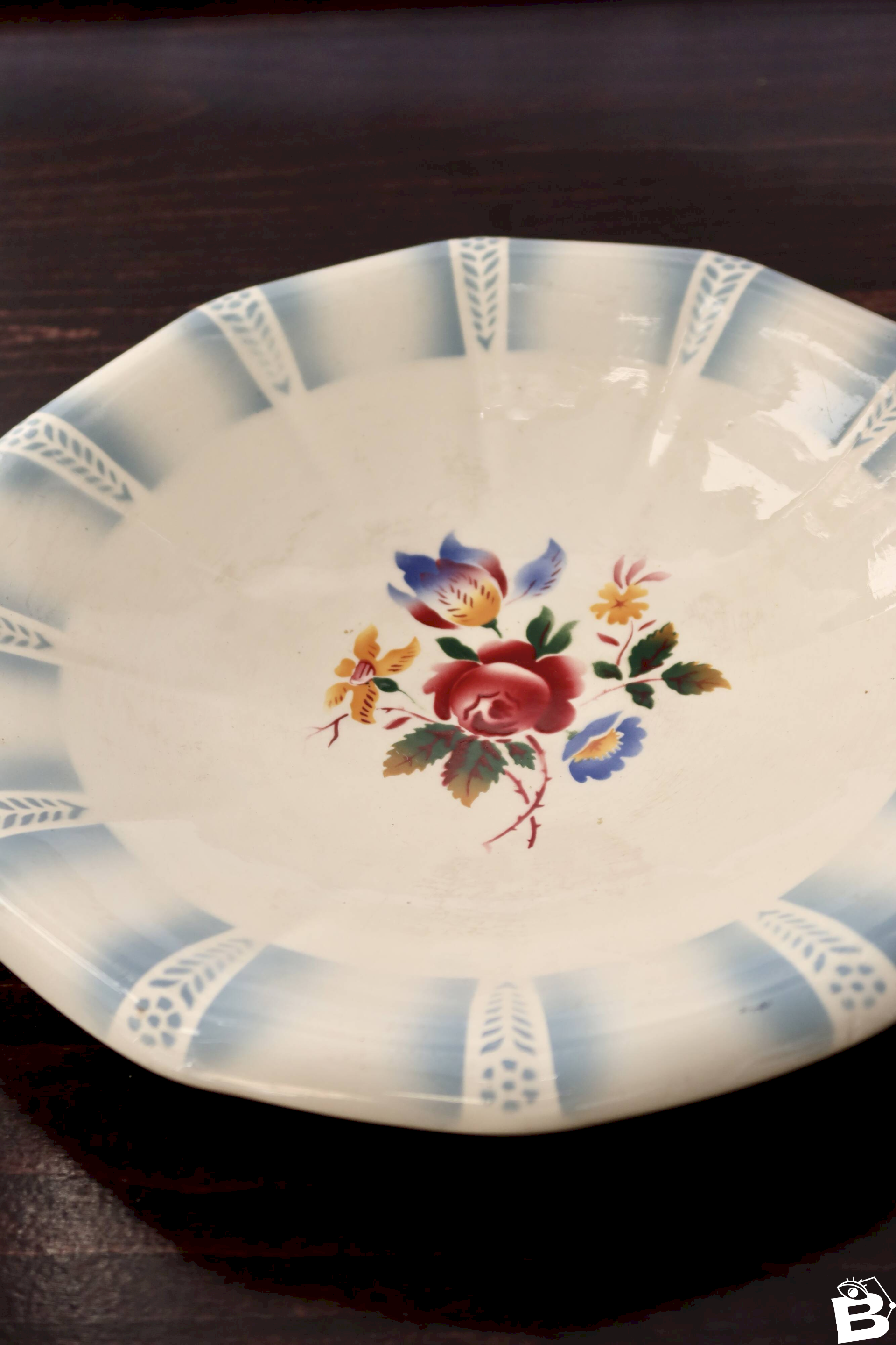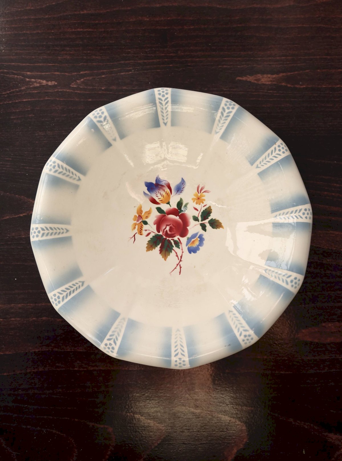 Fruit bowl in faience from Sarreguemines, Claude model, with a central floral decoration in delicate tones and a pale blue border.