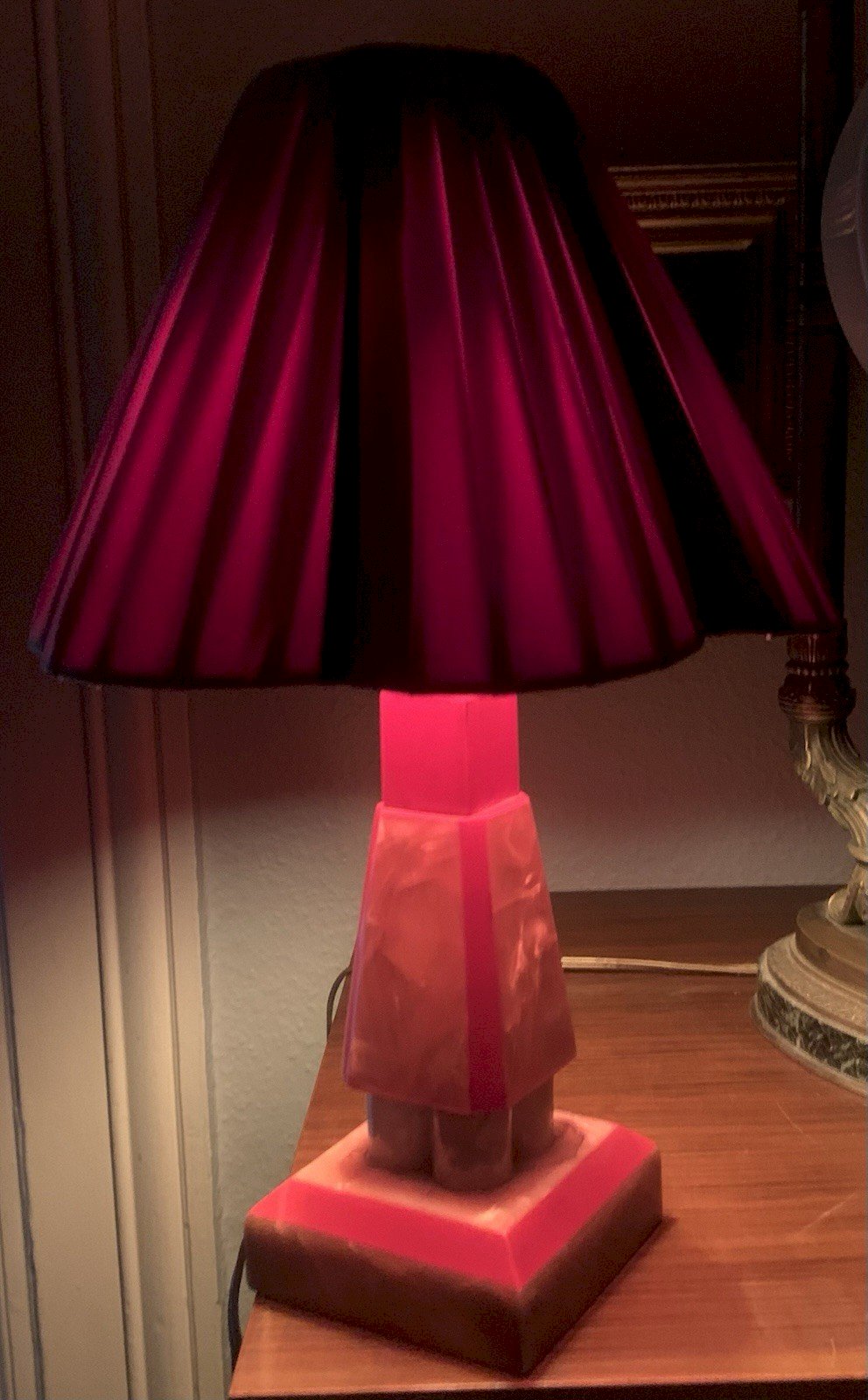 Night light bedside lamp Bakelite and galalith base Red plastic shade Works Bayonet socket Period 1940-1950 Good condition Small scratches on the base Height: 30cm Base dimensions: 8x8cm Type: Table lamp Period: 20th Century design Subtype: Bedside Country of origin: France Dominant color: Red Material: Plastic Style: 1940-1960 Maximum power (Watts): Less than 40 Features: Bayonet