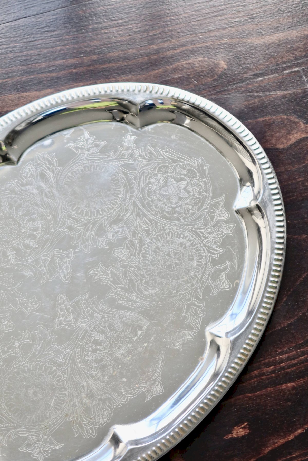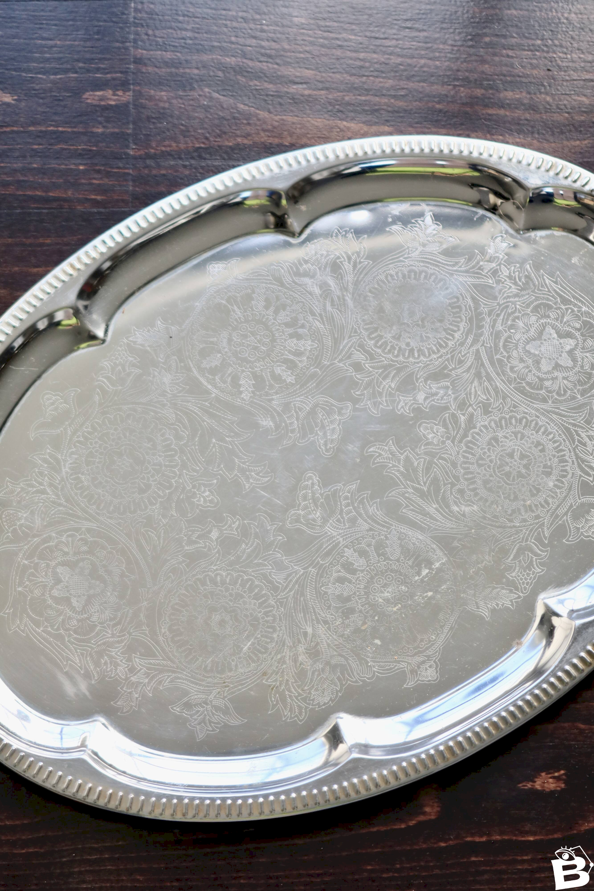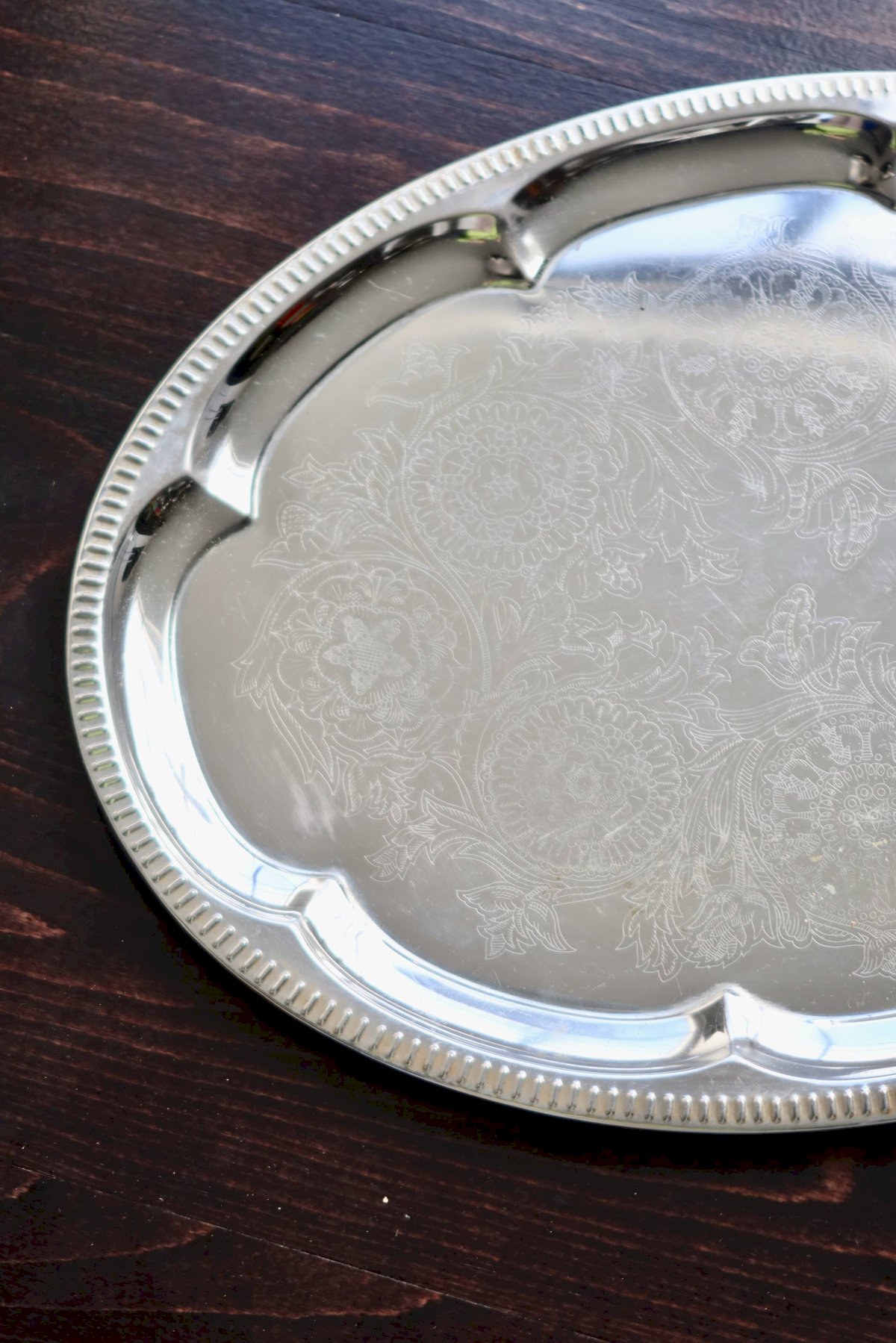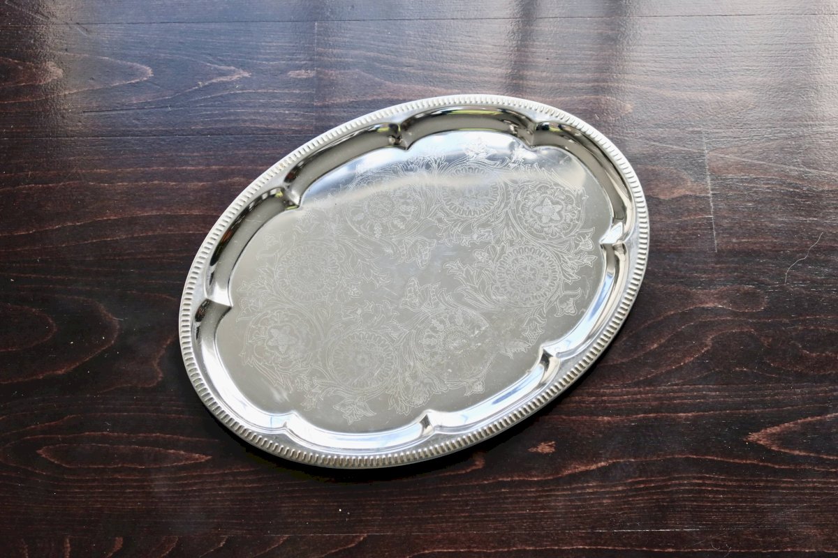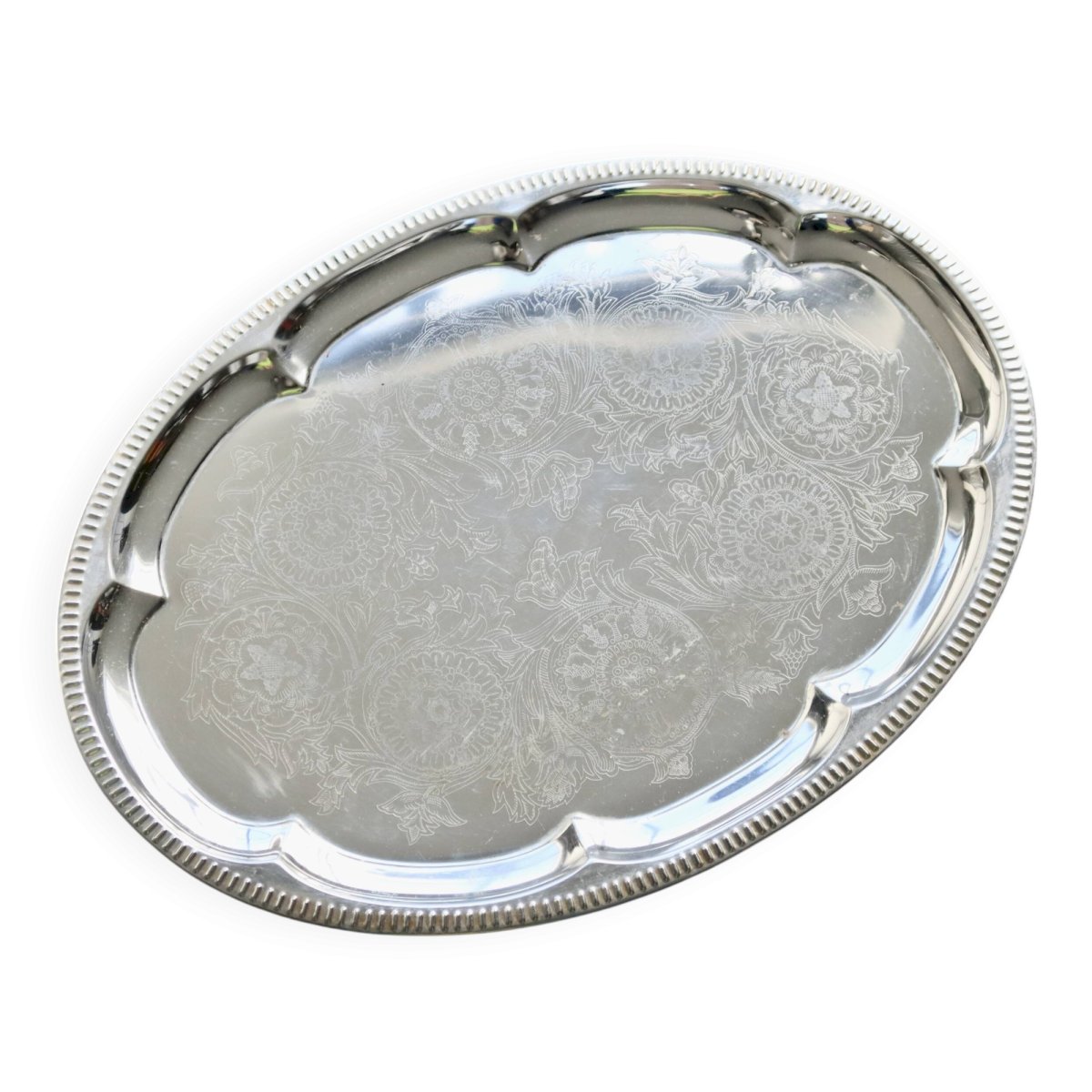 Oval silver-plated tray with finely worked rockery edges, in a classic and elegant style.