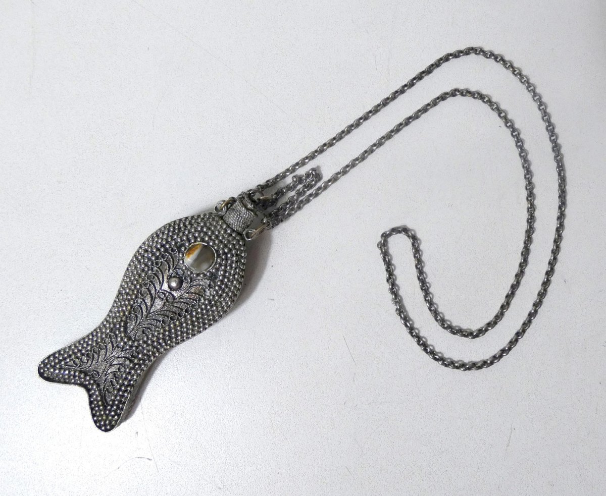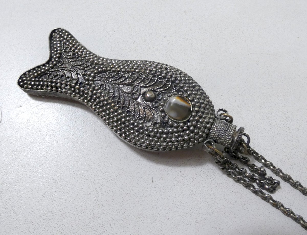 Old fish-shaped perfume bottle, worn as a pendant on a link chain. Work combining beaded silver and silver-plated metal, decorated with filigree, set with agate cabochons on each side of the pendant. Oriental/ethnic style, probably late 19th – early 20th century. Dimensions of the bottle: approximately 11 x 4.5 cm. Original antique chain. The cap remains secured by its small chain. Very good overall condition with a patina of use, intact natural stones. Decorative and rare collectible item, can be worn as jewelry. Please specify your preferred pickup point if you have one.