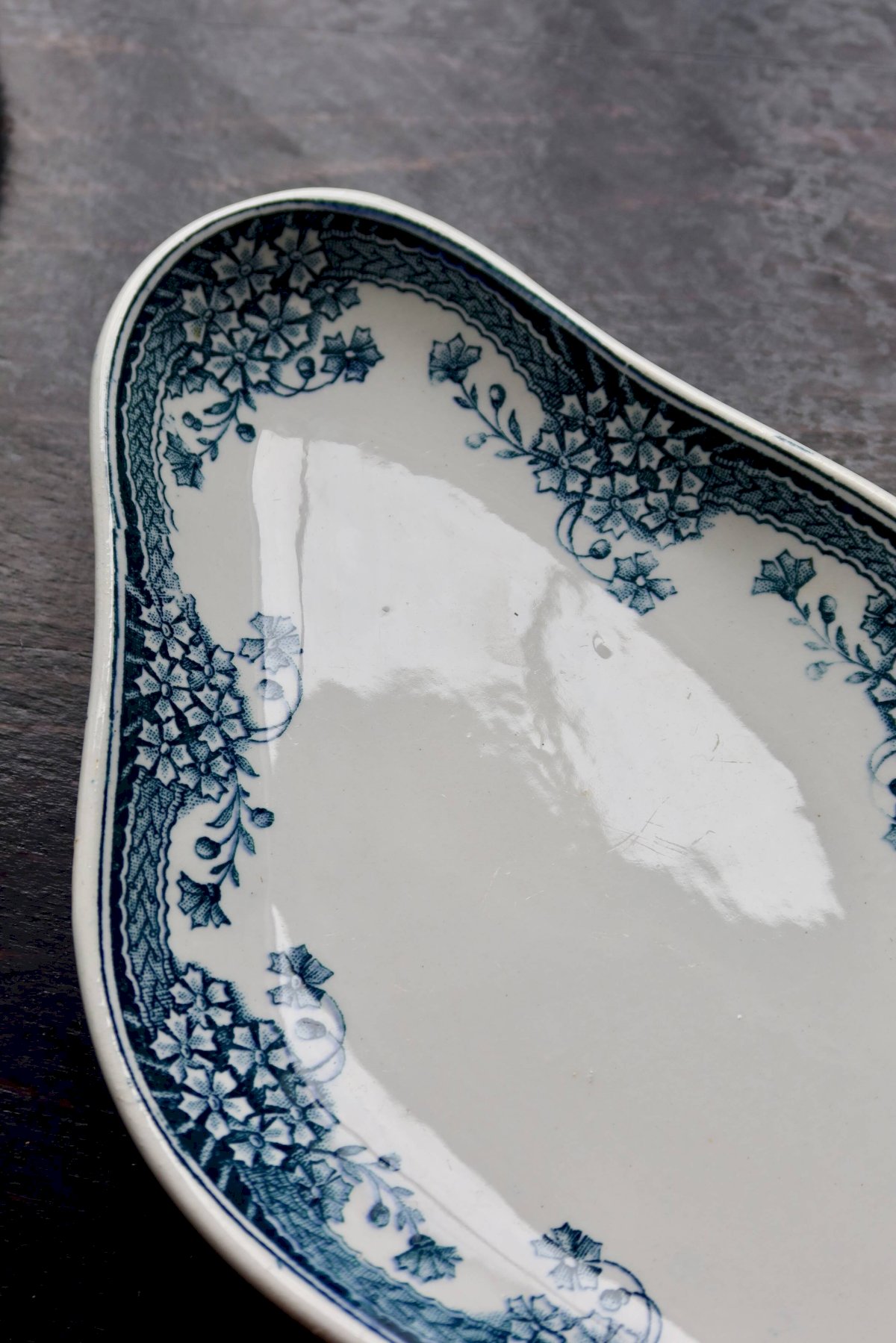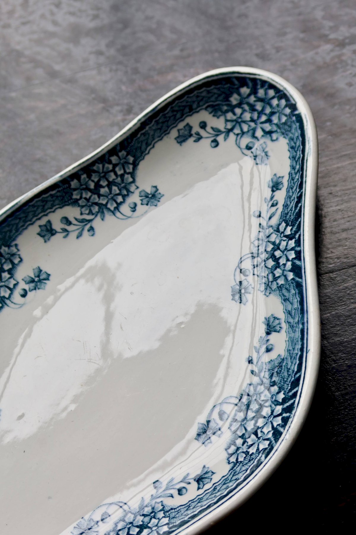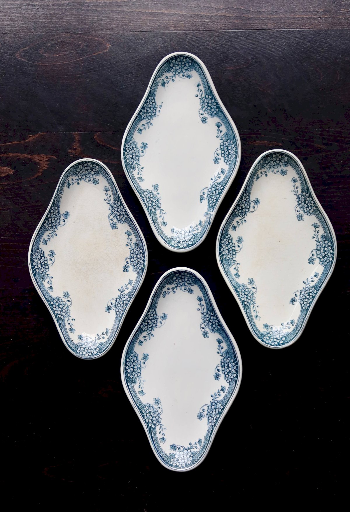 Sinuous shape with a blue-green floral cartridge border, shiny white earthenware with a decoration applied by transfer. 4 units are available for sale, price displayed for one. Please note, variable condition depending on the piece, make sure to check the photos. ? Beautiful vintage condition, micro signs of use, patina. ? Dimensions: 24.5cm X 1cm X 15cm. L: 24 W: 15 H: 1