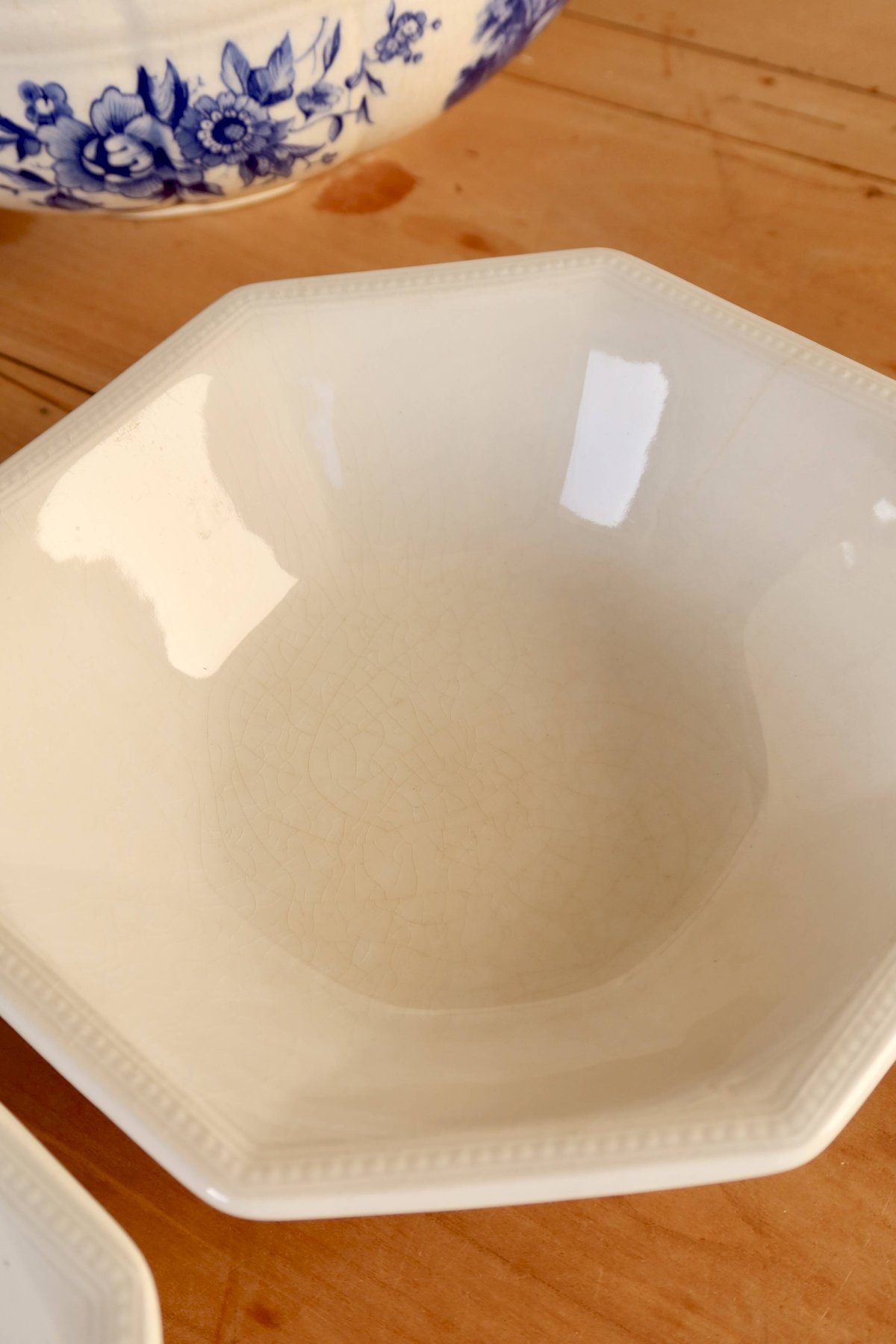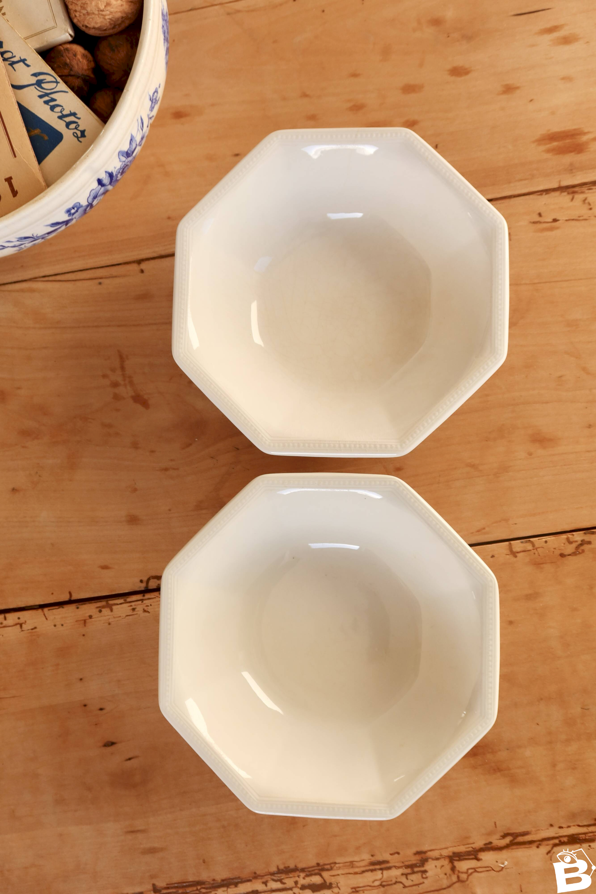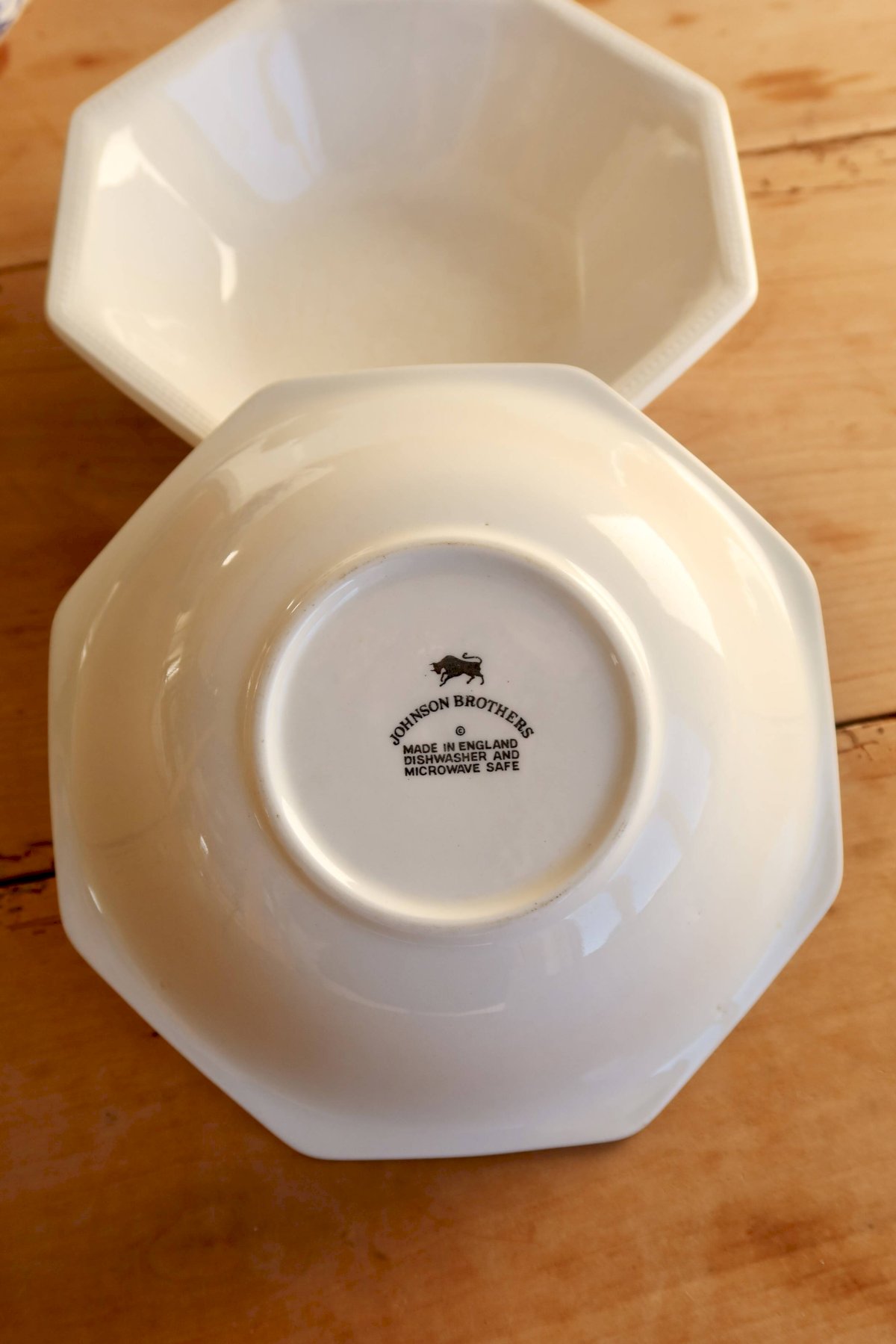 English porcelain bowls by Johnson Brothers, model Pearl, recognizable by their octagonal shape and the delicate raised pearl rim.
