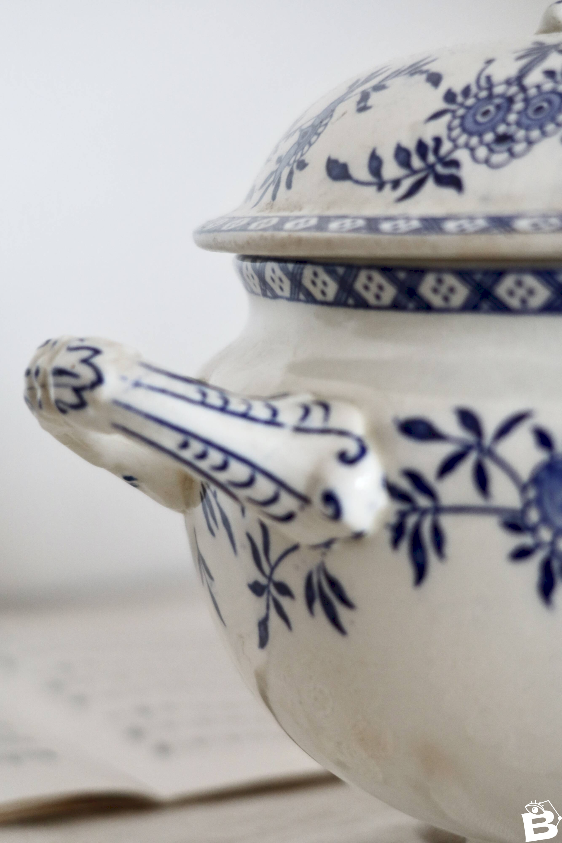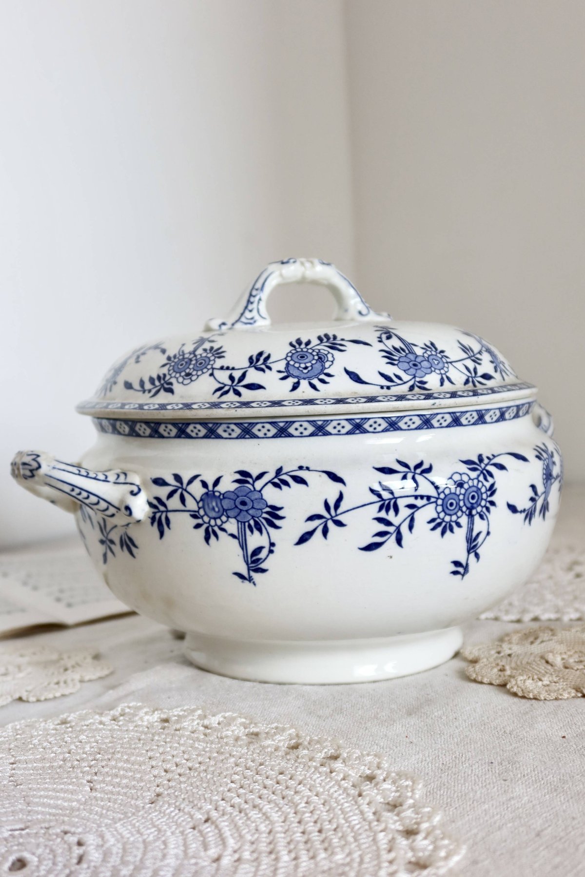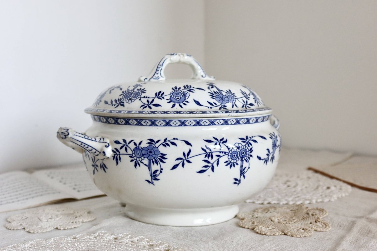 Large vintage soup tureen in Dresden porcelain, featuring a delicate floral decoration framed by an ornamental frieze typical of baroque and rococo styles.