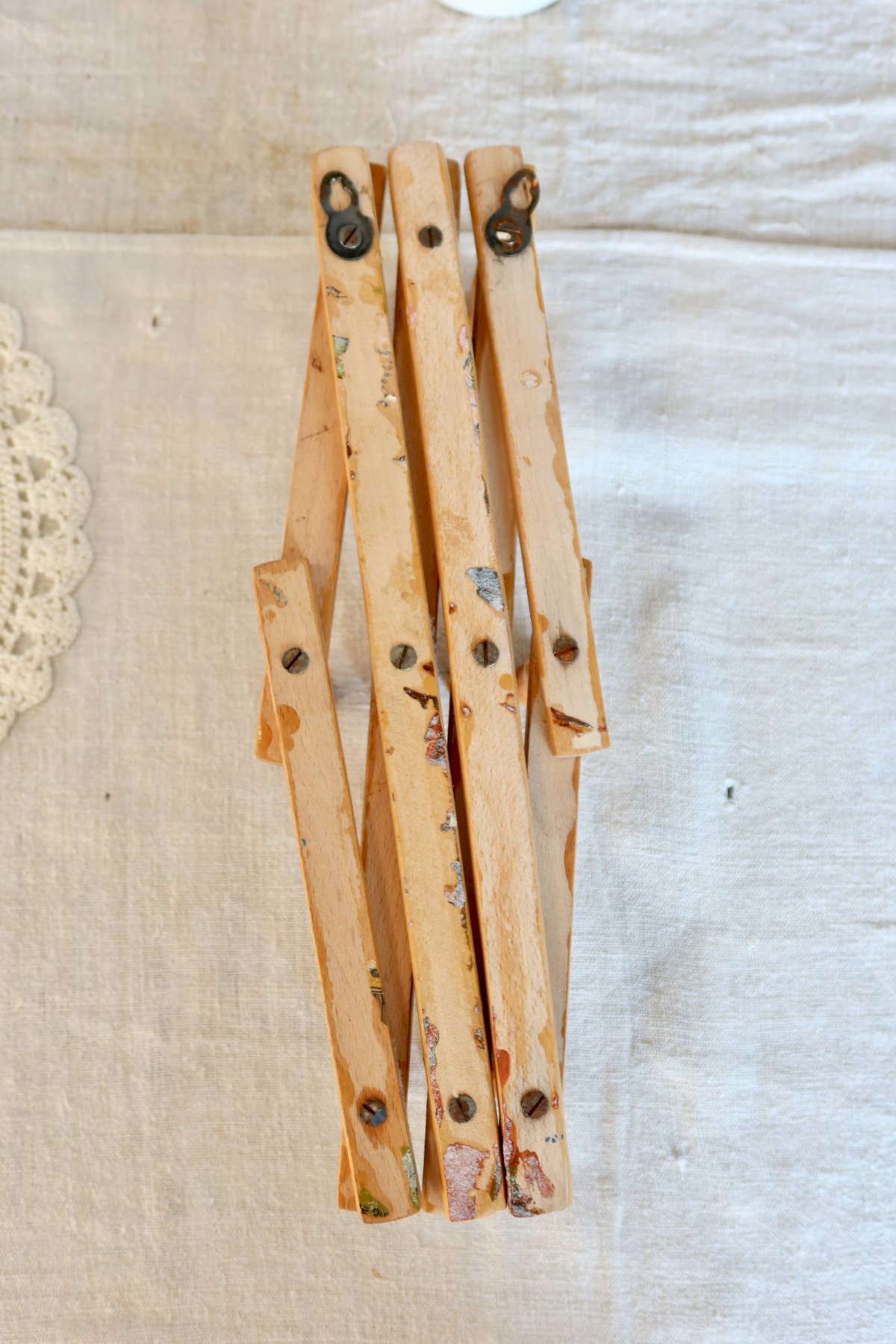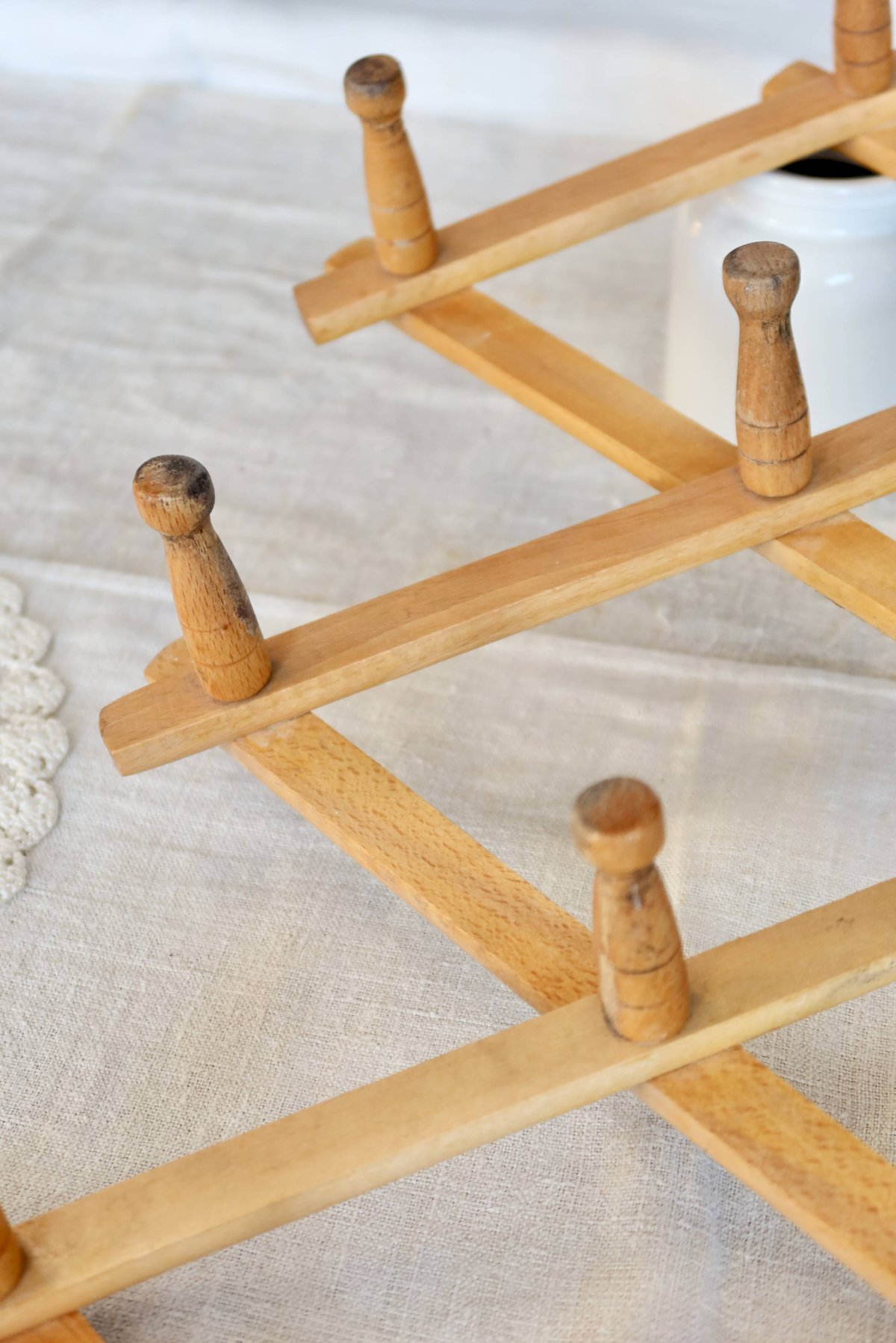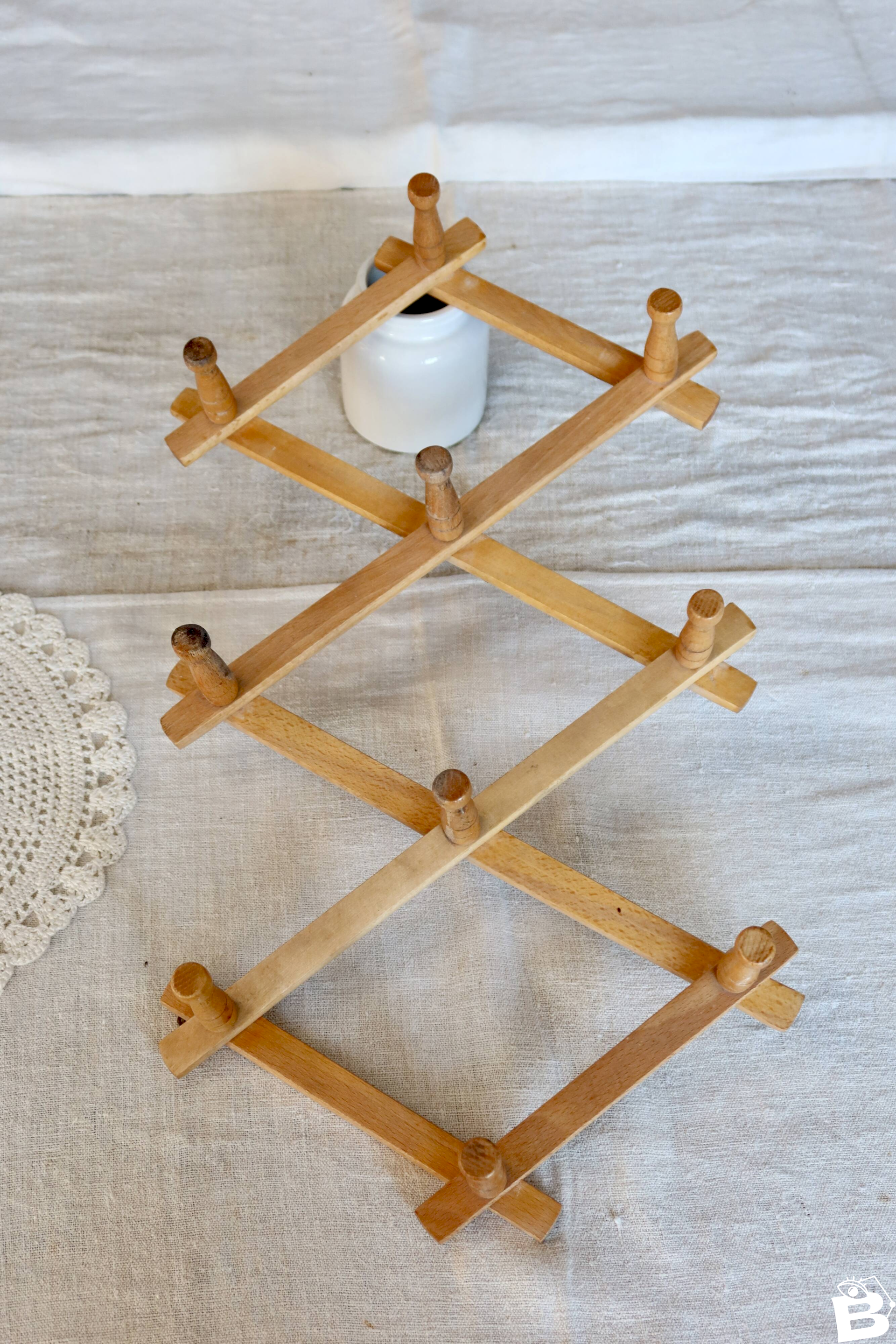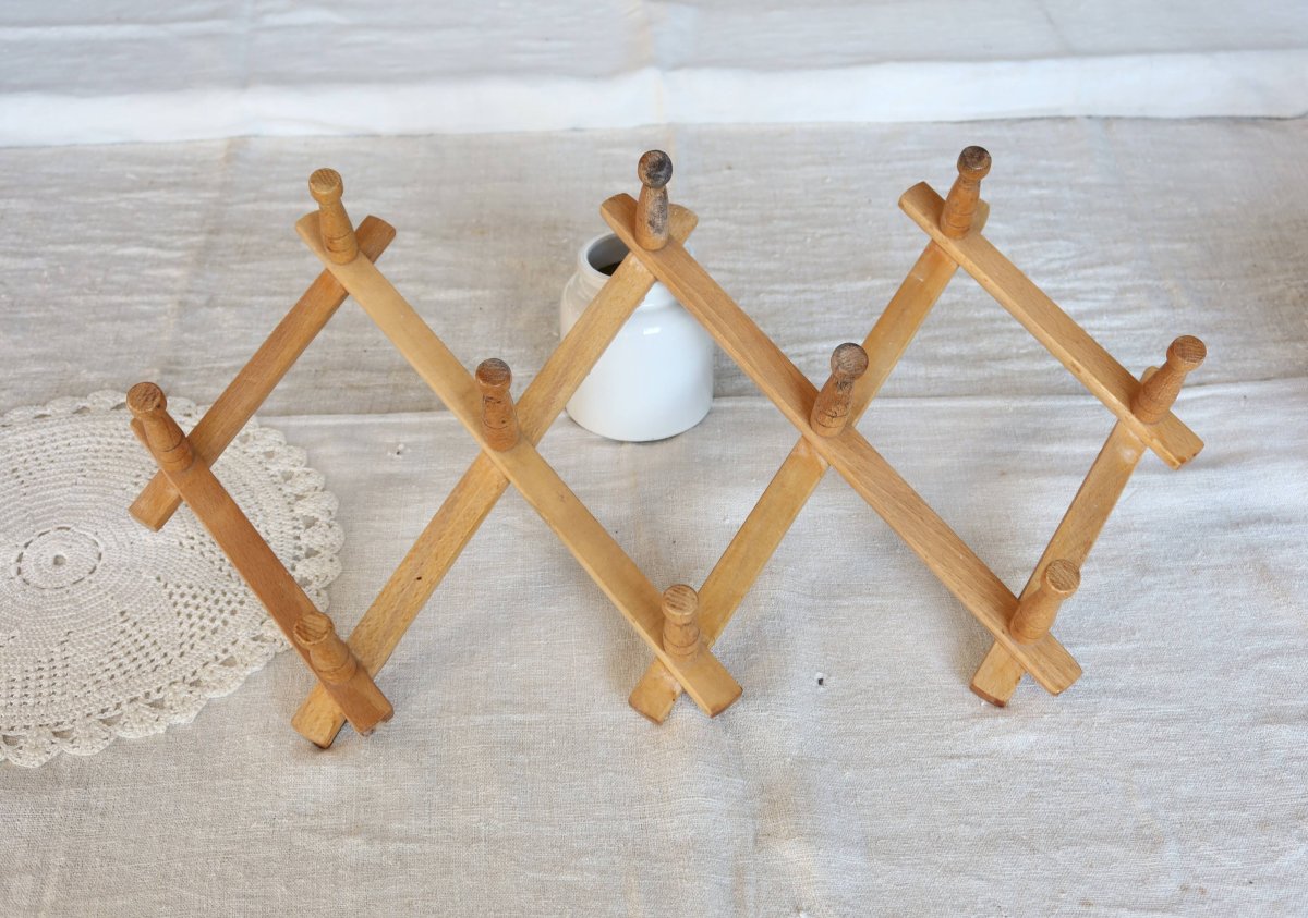 Antique wall-mounted coat rack made of light pine wood, with an expandable accordion structure and cylindrical hooks.
