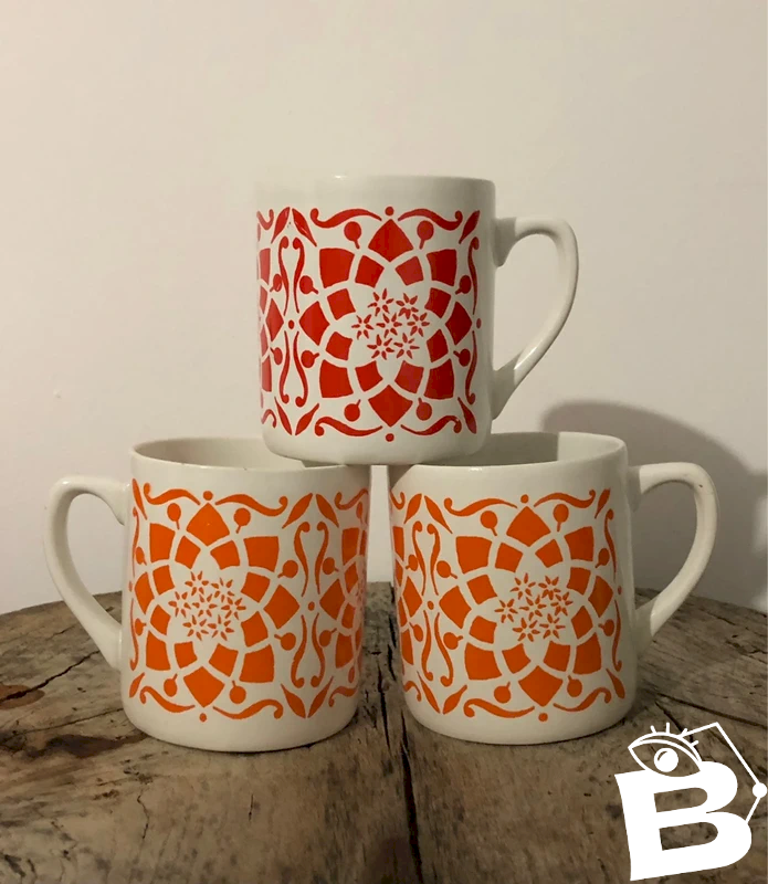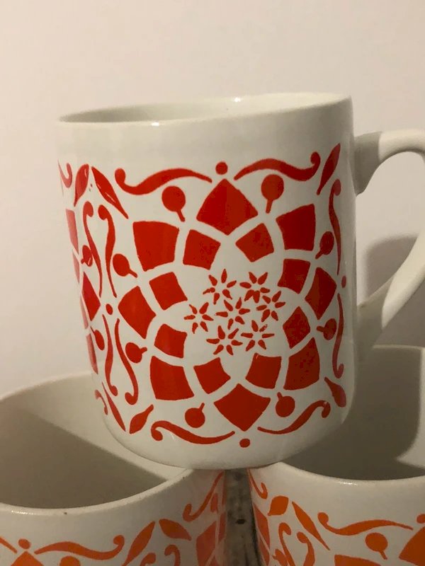 Vintage retro cups with geometric patterns in red or orange, in generally good condition, with signs of use in the bottom of each cup and a non-damaged scratch on the top of one cup, see the last photo. Height 8.3 cm Diameter 7.5 cm.