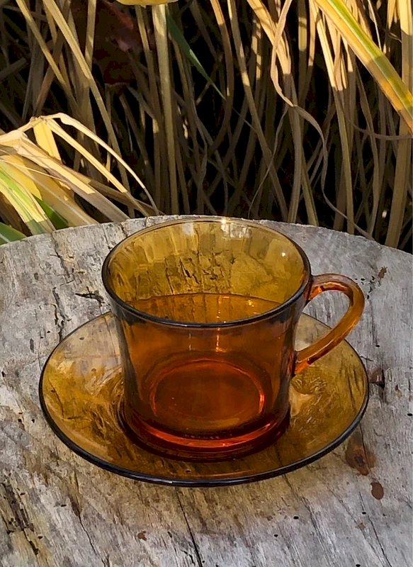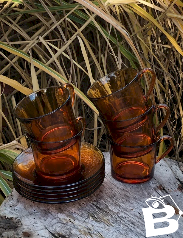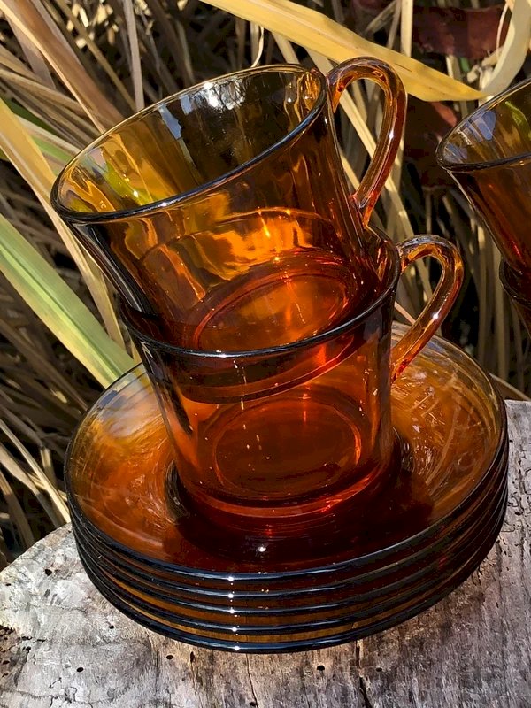 5 Vintage Duralex retro coffee cups and 5 saucers in amber glass in excellent condition. Cup height 6.7 cm, cup diameter 8 cm, saucer diameter 13.2 cm.