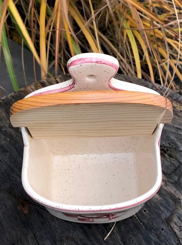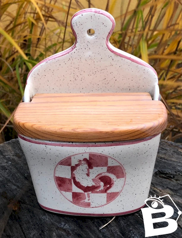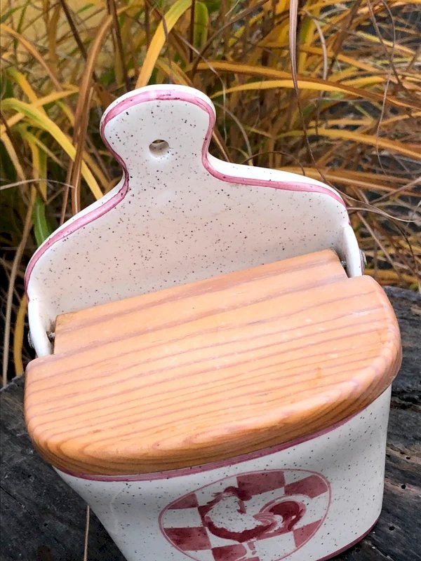 Vintage retro wall-mounted salt box in excellent condition. Back height 17 cm, compartment height 9.5 cm, compartment dimensions 9*12 cm.