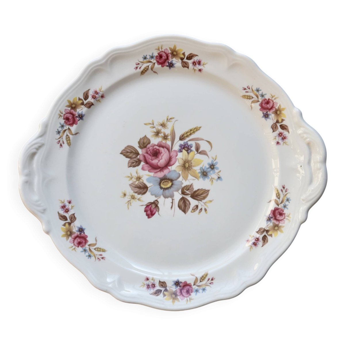This round ceramic dish decorated with pink, yellow, and blue flowers is a delicate and refined piece from the Moulin des Loups pottery.