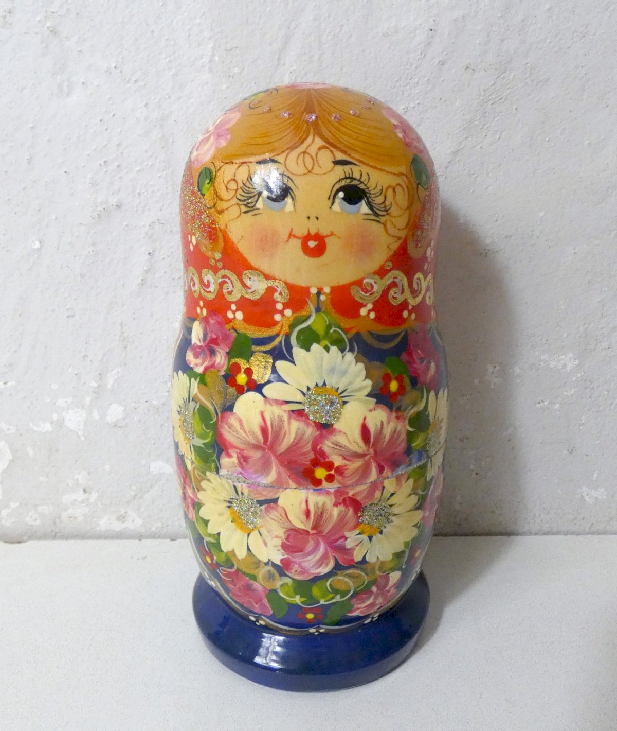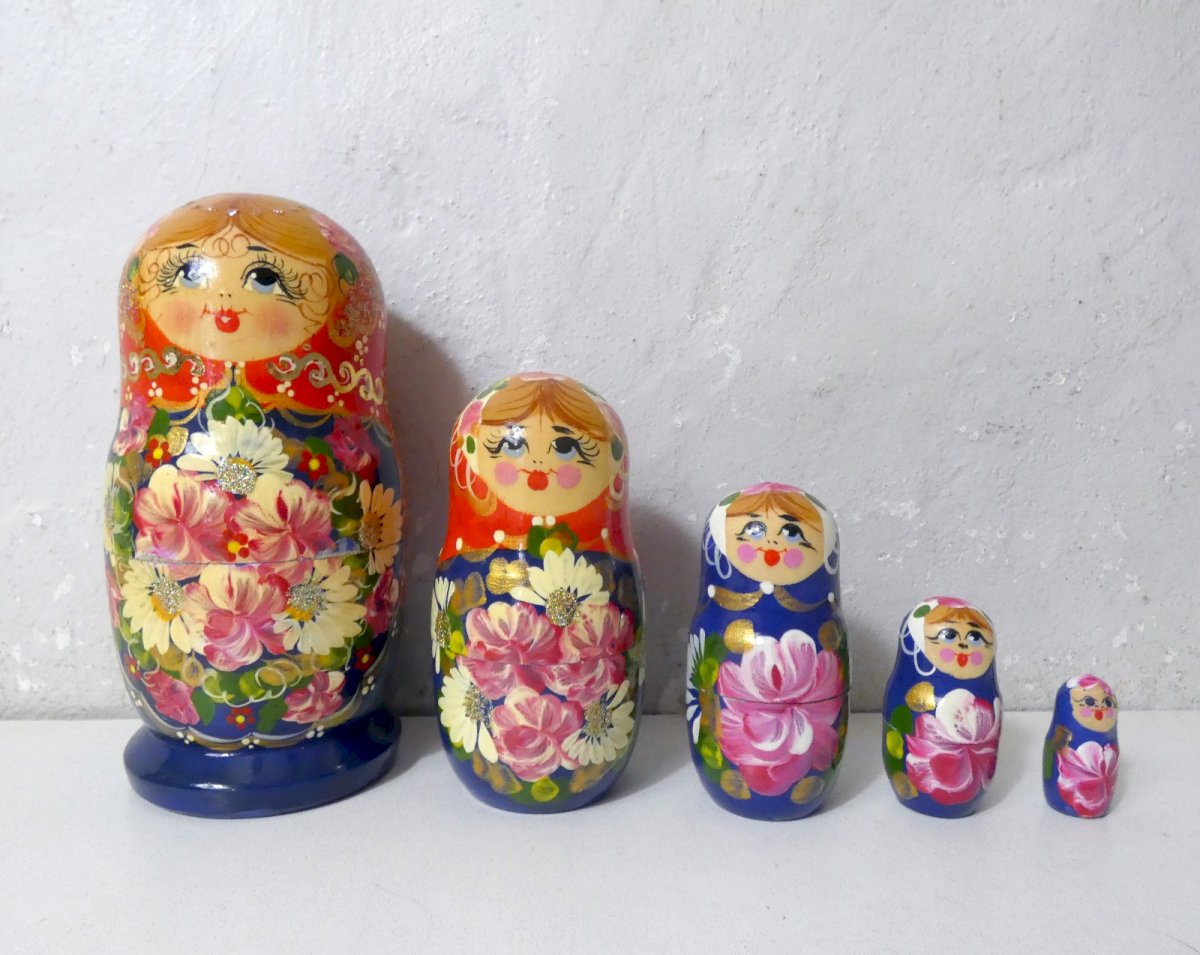Folk Art. Matrioshka. 15.5 cm. Complete set of Russian dolls beautifully decorated with bright colors, gold accents, and glitter. In very good condition. Condition: Used item. Please refer to the seller's description for more details... Used item. Any potential imperfections.