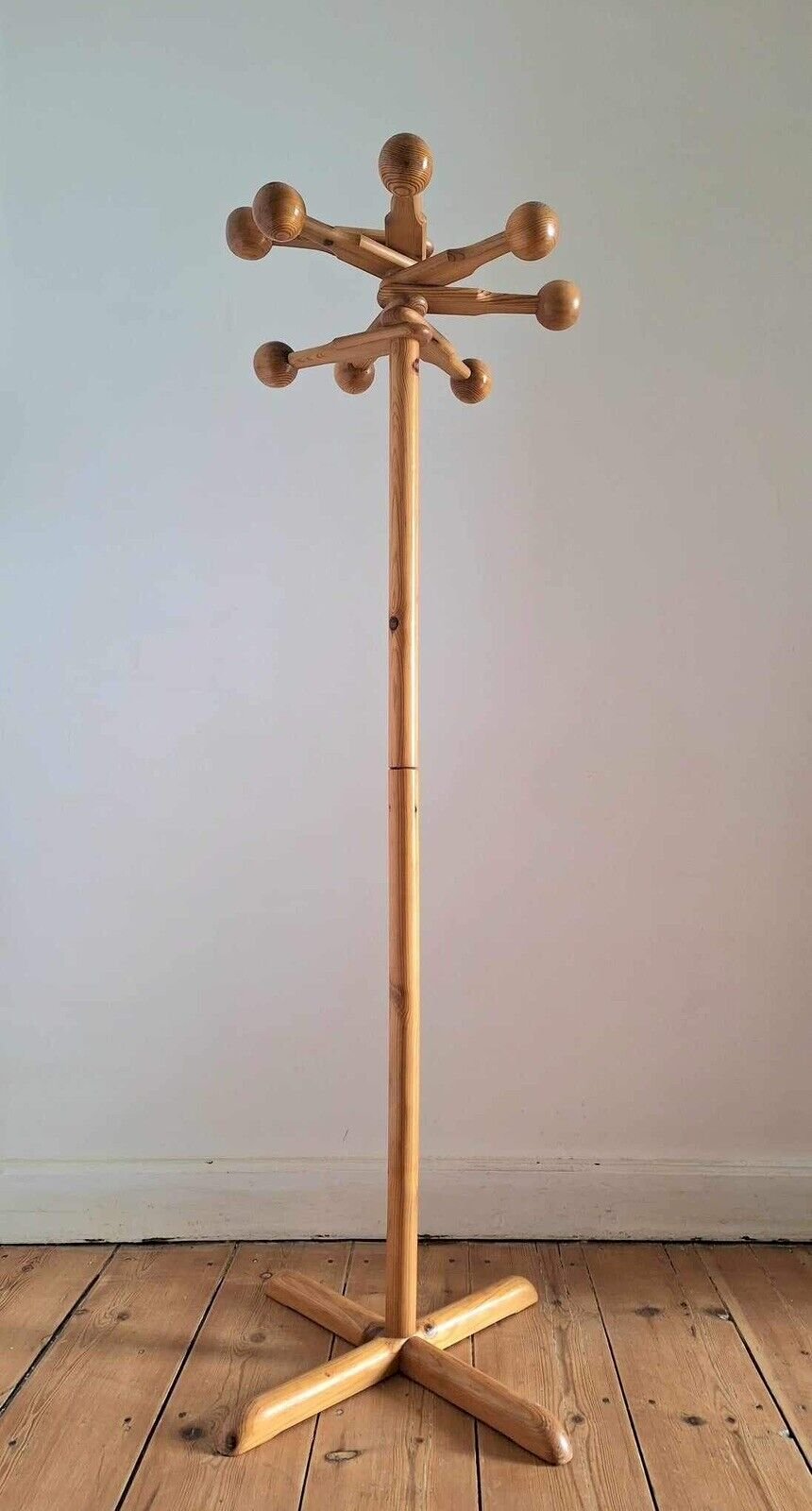 Thank you for writing to me if you would like to make an offer. Scandinavian Vintage Coat Rack, Antique Hook Furniture Dimensions 49x49xh139cm. Solid wood (pine). The balls rotate. Disassembled into 2 parts. Signs of use on the hooks, see photos. Pickup at my home or delivery possible via carrier (e.g. €30 to Paris and the surrounding region, contact me for other destinations). Delivery times of 2 to 4 days are imposed and are therefore given for informational purposes only. Space age hat entry design.