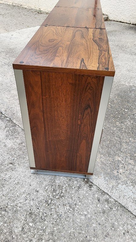 Beautiful vintage sideboard measuring 254 cm long, it is in very good condition with just two small dents on one door. There are three elements plus a fourth attached to the five-drawer unit: - One five-drawer unit measuring 56 cm long, 39 cm deep, and 73 cm high. - One five-drawer element and one door measuring 11.5 cm long, 39 cm deep, and 73 cm high. - One element with two doors measuring 86 cm long, 39 cm deep, and 73 cm high. It is a very nice set, and you have the option to separate the elements or rearrange them. I am available for any questions either by email or phone: . For larger photos, please send me your email. For delivery between the south and Paris, ask for the price from JM TRANSPORTS at 06.12.25.48.48. For another destination, please contact me. Type: SIDEBOARD