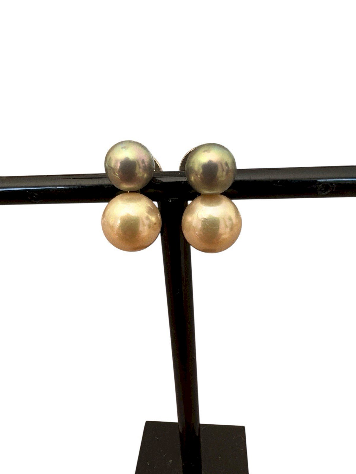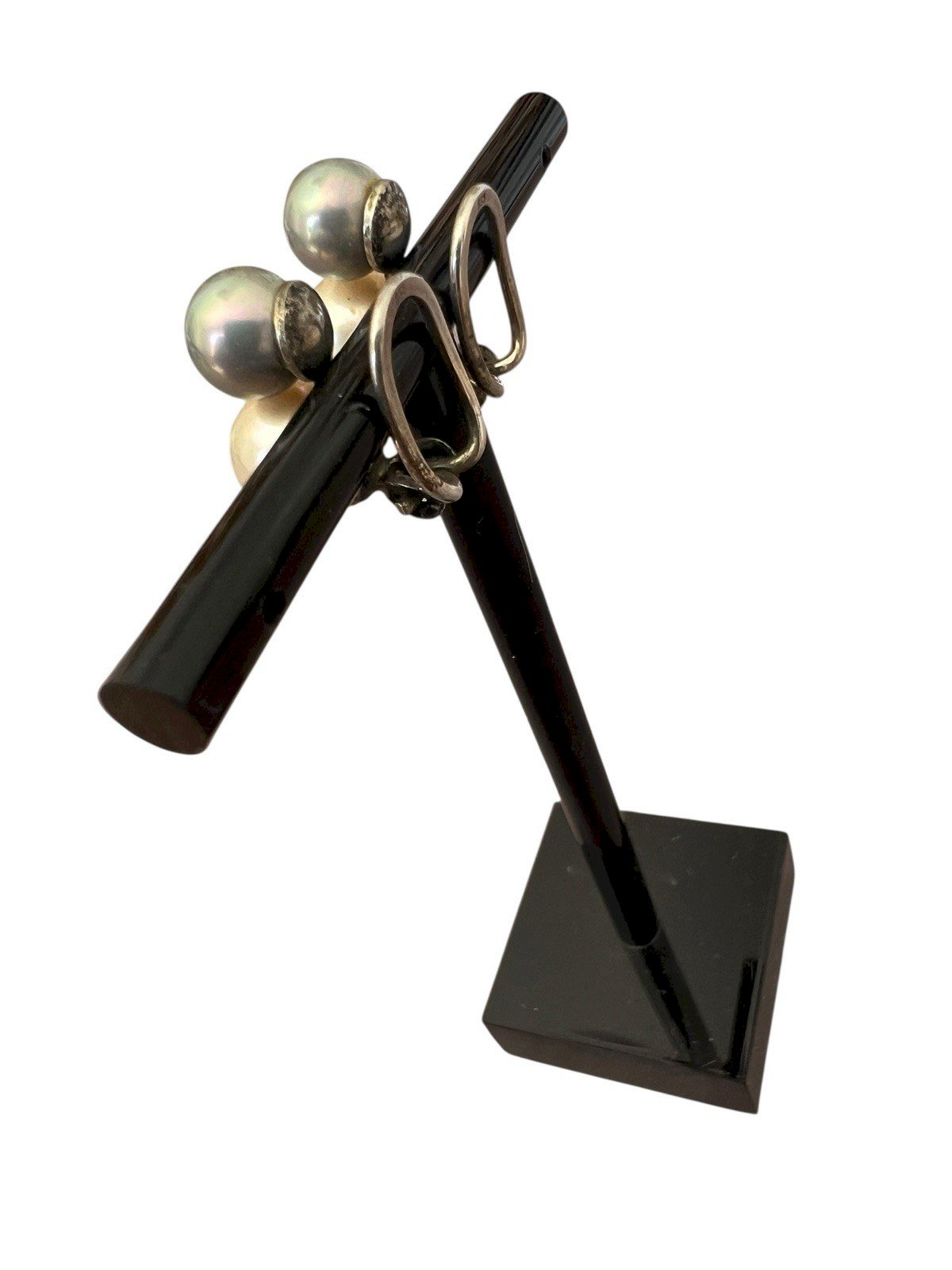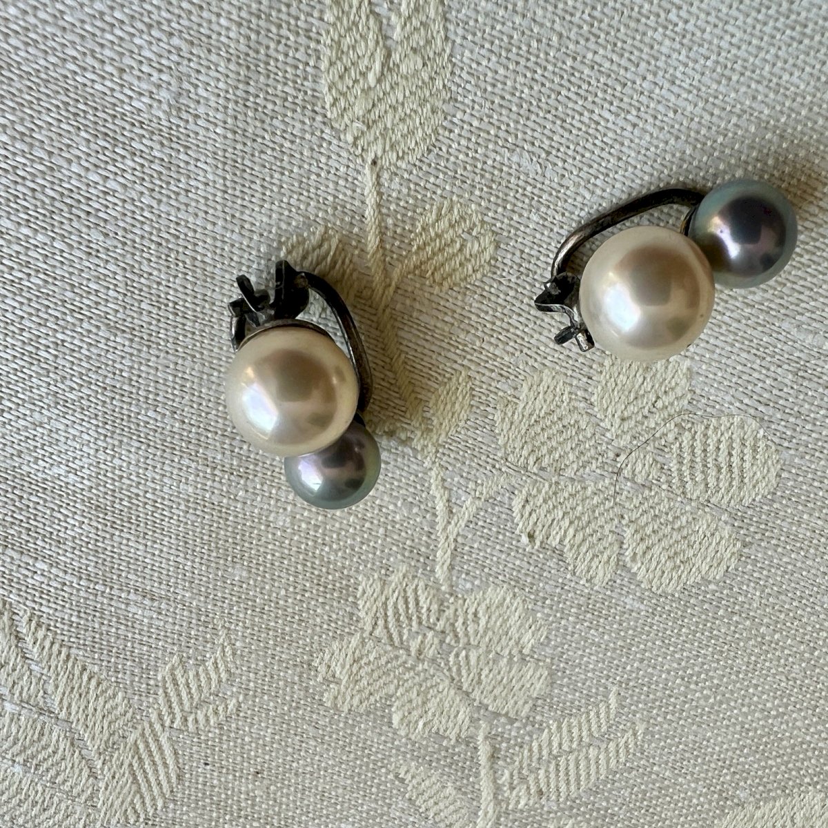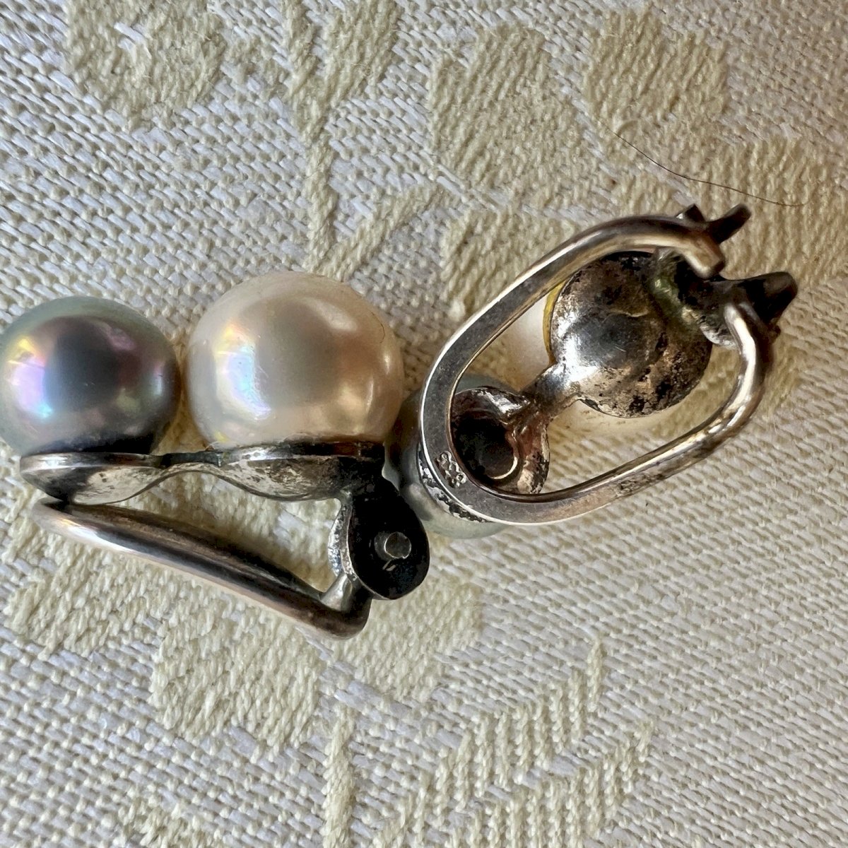Vintage 1960 silver clip earrings with white and gray cultured pearls. The setting is made of solid silver, stamped 835, and is functional. Old patina, dimensions approximately 1.8 cm by 1.3 cm, weight 5.7 g for the pair. Condition: Used: Item has been worn. ...Used: Item has been worn. any potential imperfections. Style: Clip Earrings Closure: Clips Dominant stone: White Pearls Type: Studs Metal purity: 850 parts per 1000 Dominant stone color: Silver Secondary stone: Gray Pearls Metal: Solid Silver